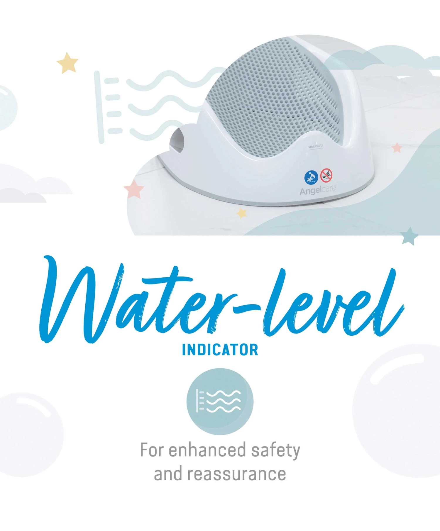 The Angelcare Soft-Touch Bath Support provides a stress- and worry-free bath time for all. The smart design keeps baby secure, snug, and comfy in quickly warming soft touch material. The unique design holds baby safely leaving your hands free to wash and play. The water level indicator provides optimal safety.