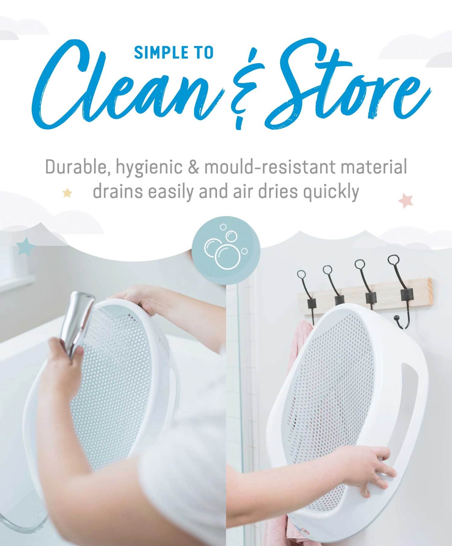 Simple to use straight in the bath and easy to clean and store, our bath support is also hygienic and mildew free. The soft fashion colours blend in with any bathroom or nursery. The perfect choice for babies from birth up to 6 months of age, for a fuss free bath time. This product can be used up to when your child can sit unaided.