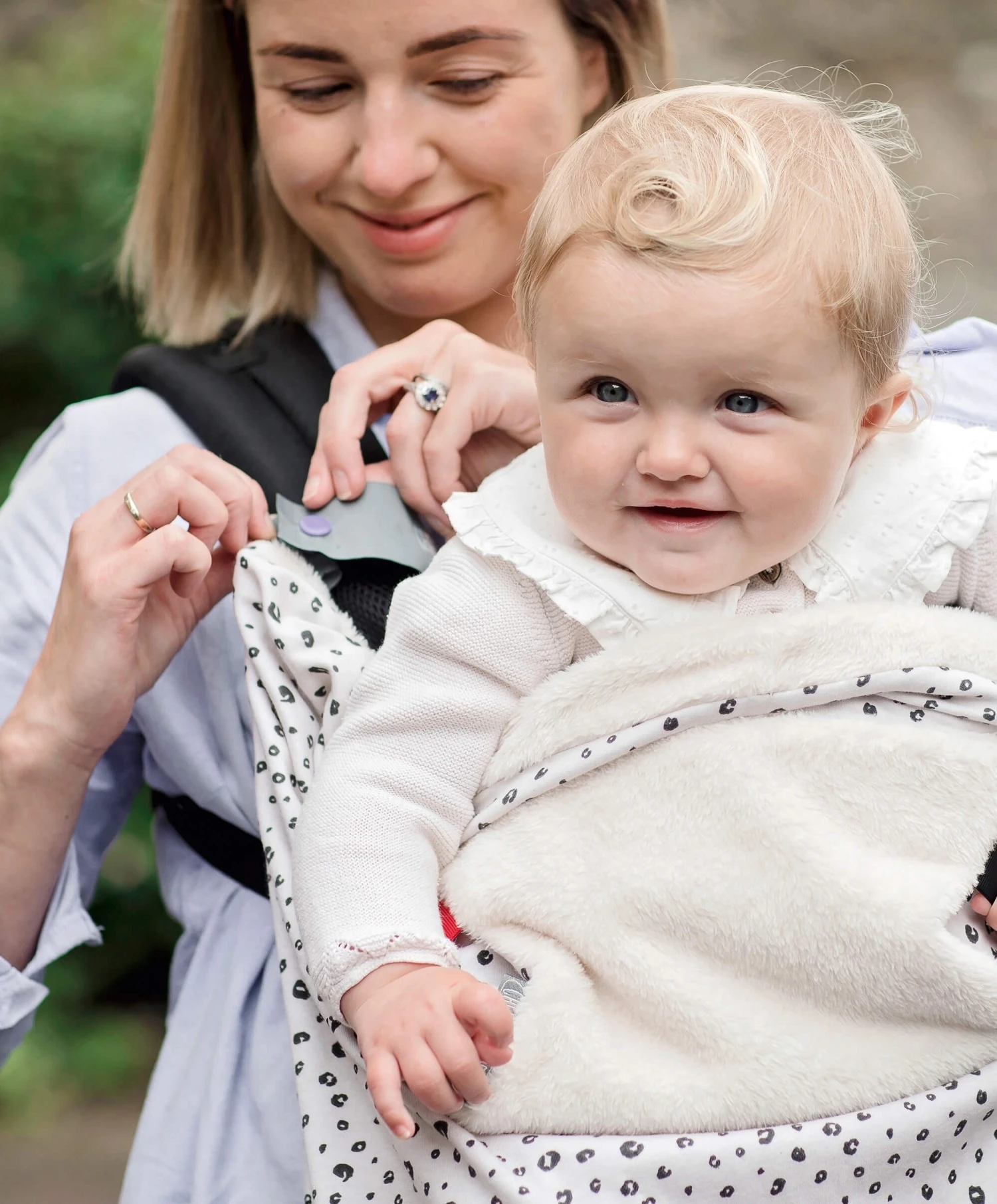 - Poppered straps to attach to any carrier, pushchair etc – no more kicked off and dirty blankets!