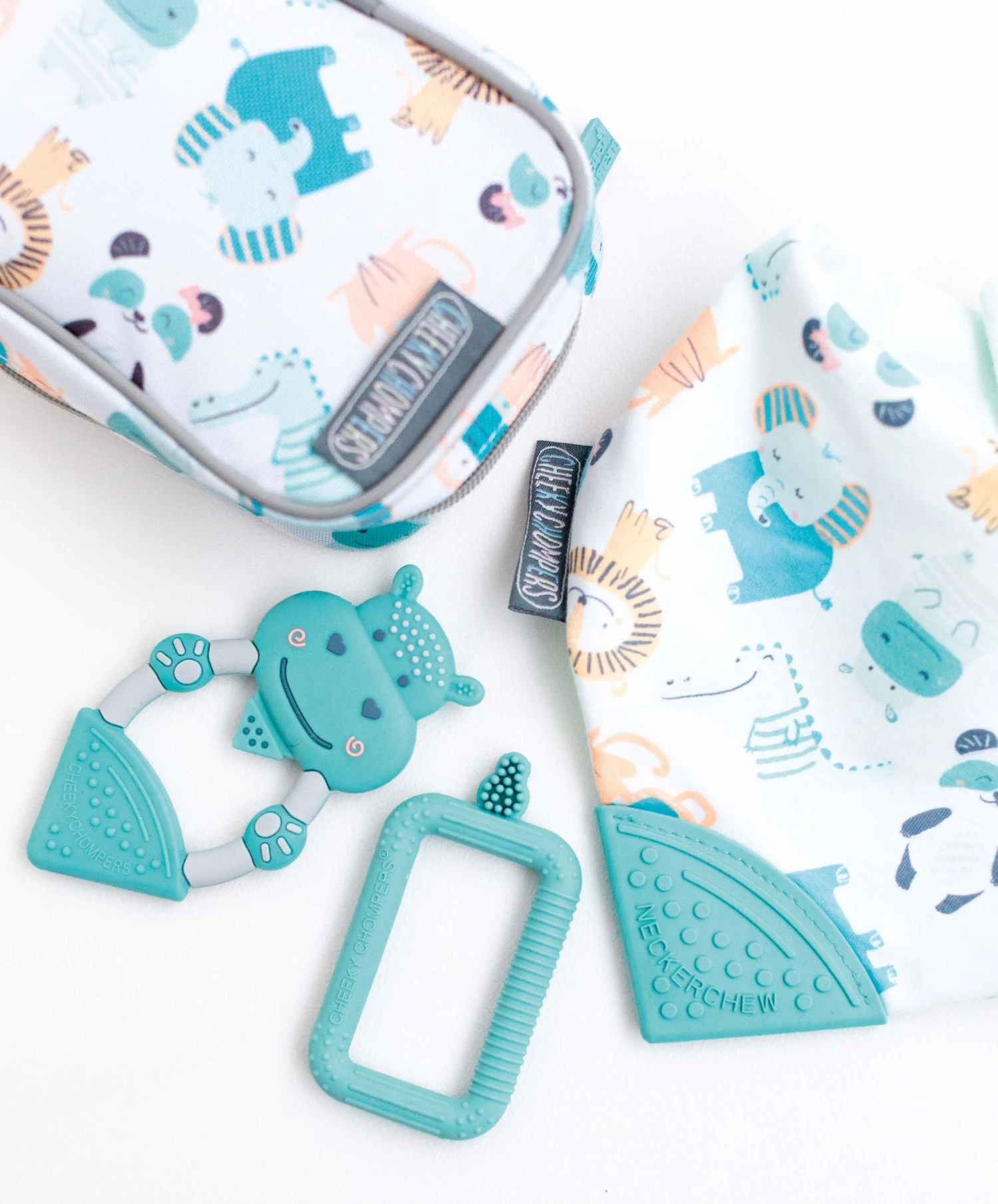Product Includes: Neckerchew Cheeky Animals, Animal Teether Chewy the Hippo and Flexi Brush and 5 Keepsake Cards