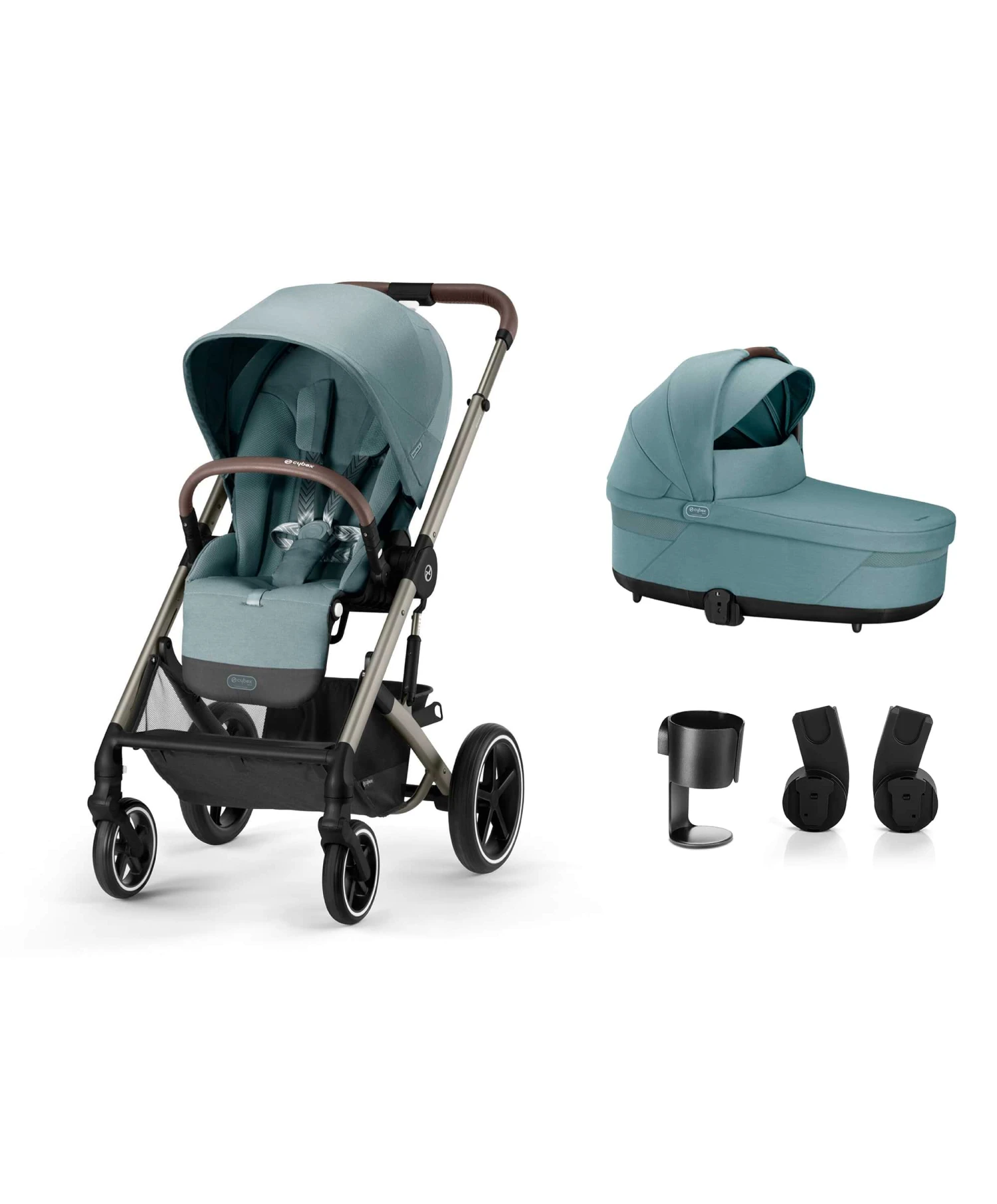 This bundle includes: Cybex Balios S Lux Pushchair – Sky Blue, Cybex Cot S Lux Car-rycot – Sky Blue, Cybex Balios S Car Seat Adaptor – Black & Cybex Cupholder – Black