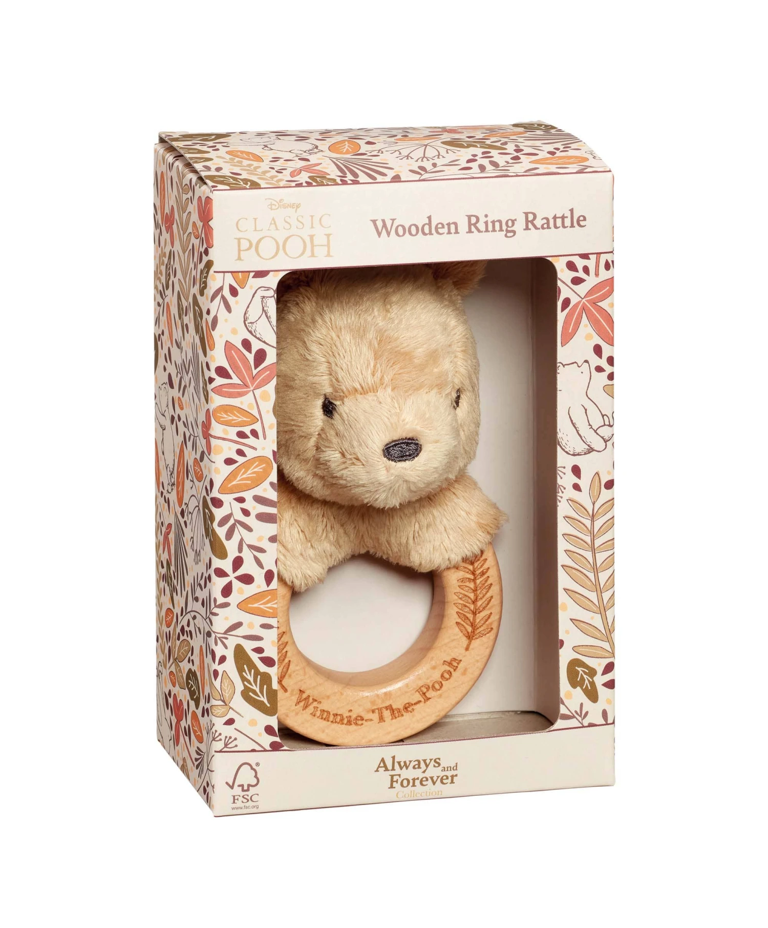 The super soft Winnie the Pooh toy on a decorated wooden ring features different textures and a soft chime rattle to encourage baby to explore and discover their senses through play, as well as offering relief for teething little ones.