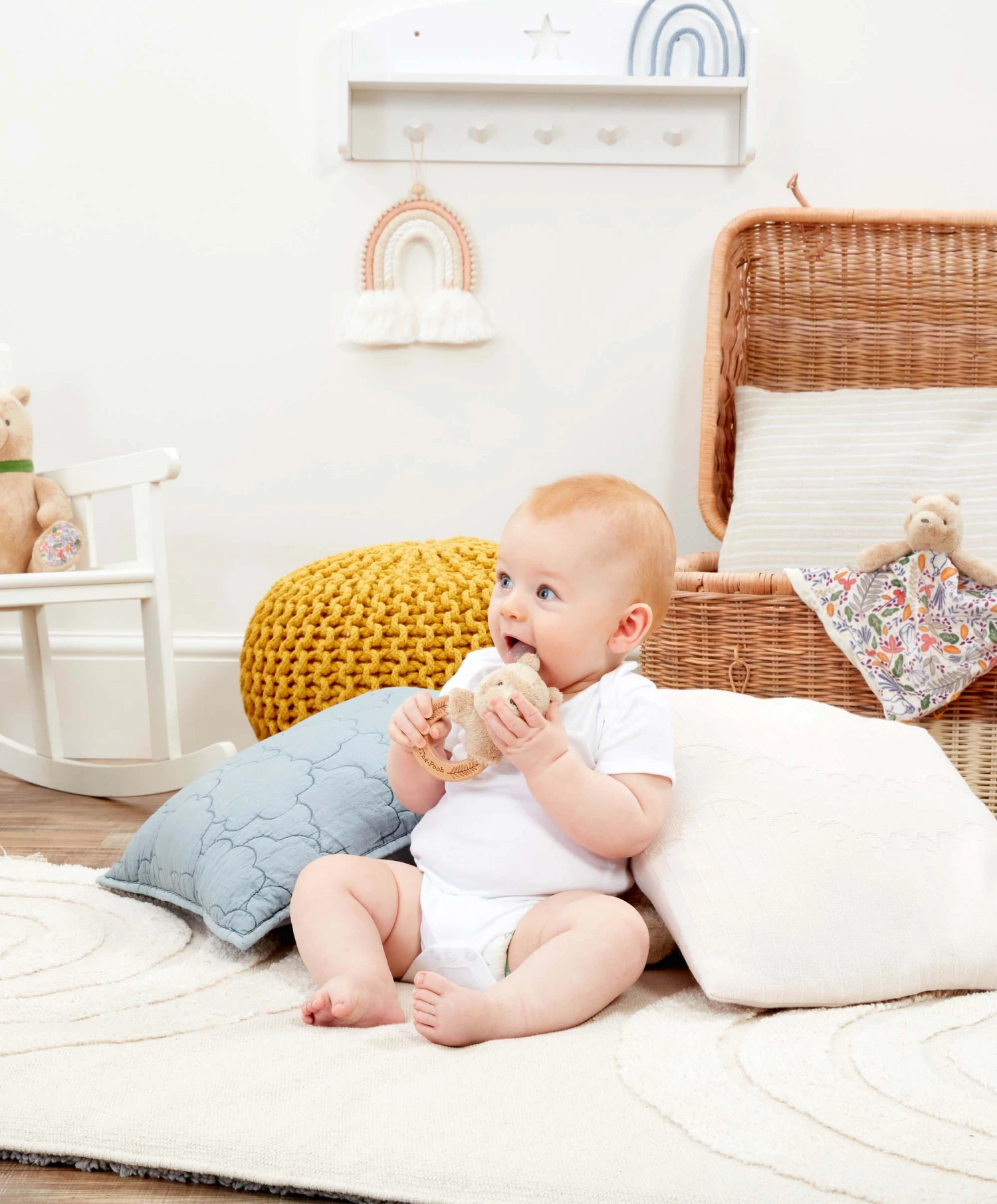 Designed to last a lifetime with a focus on sustainable materials, FSC wood and packaging, stuffing made produced from recycled plastic bottles and recycled plush fabric, this adorable Pooh Bear Ring Rattle comes beautifully presented in an illustrated gift box, making it a beautiful heirloom infant gift for any occasion. Suitable from birth.