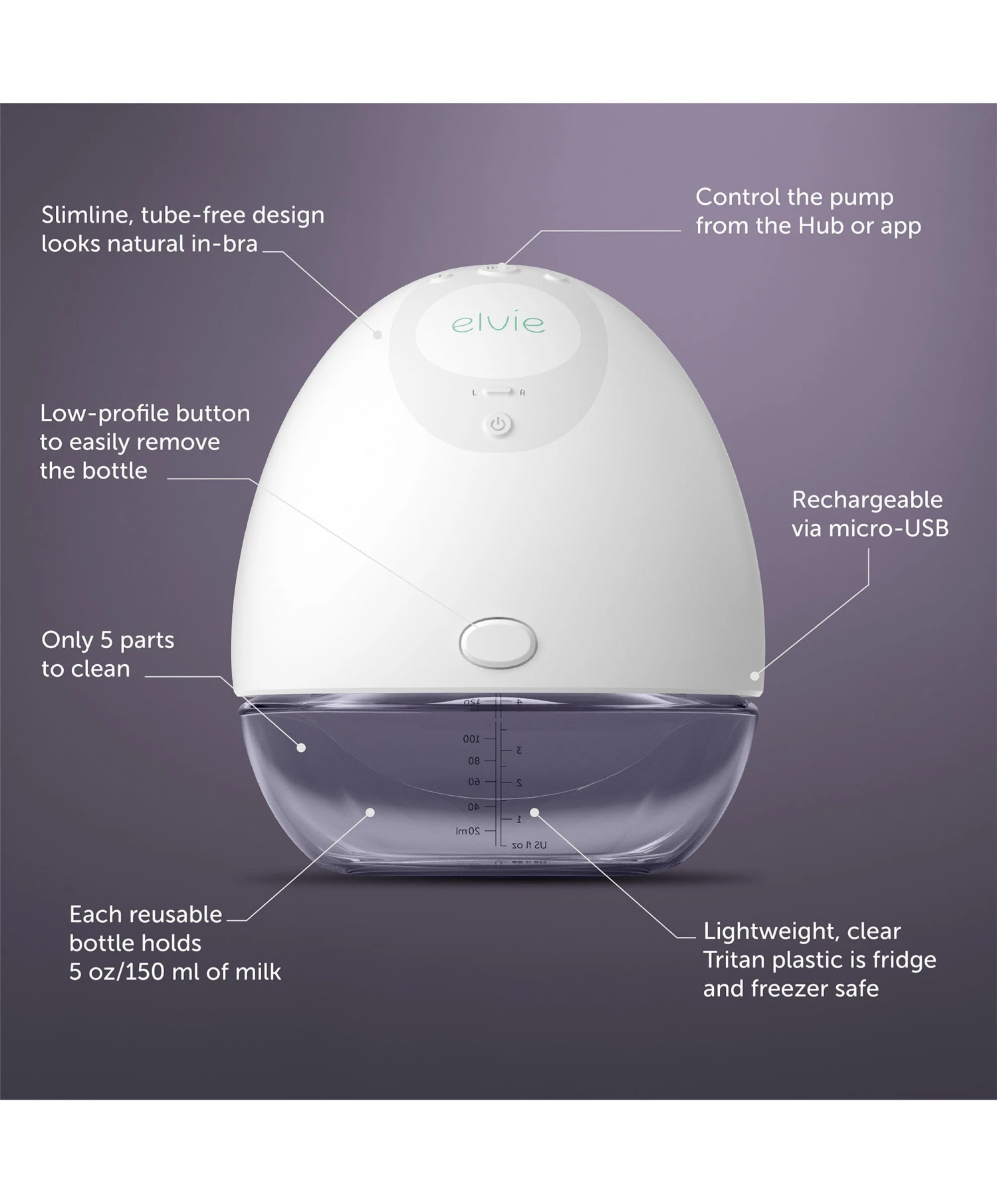 Elvie Pump is a smart, slimline wearable electric breast pump with 5 oz / 150 ml capacity. Tucking discreetly in-bra, Elvie Pump can be controlled from the Pump with Elvie app for a seamless hands-free experience – leaving you free to roam where other pumpers dare not go.