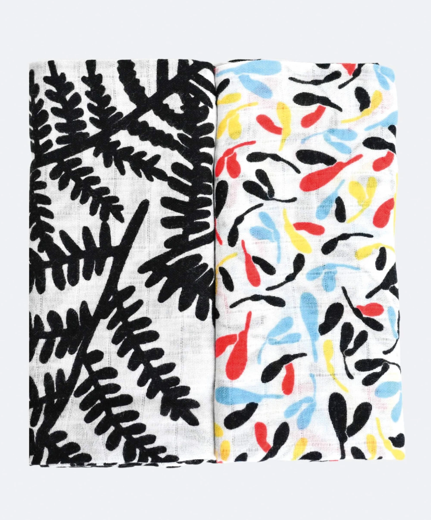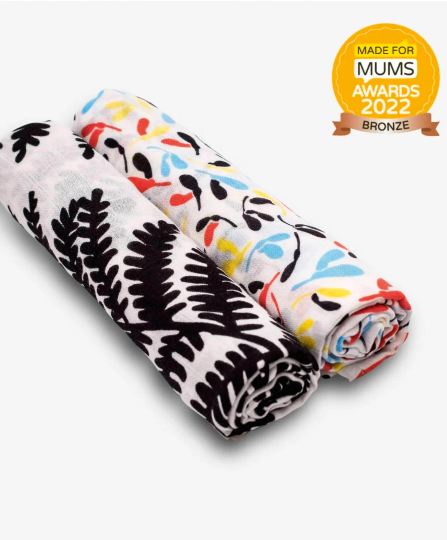 Two-pack of mid-sized super-soft sensory muslin squares, one from each age range from Etta Loves best selling plant print collection. The Fern print has been expertly scaled to support babies’ cognitive and visual development between birth and around 5 months old, whilst the colourful Sycamore print muslin introduces smaller scales and colour to support from 5 months to a year and beyond. Perfect for feeding, play, cuddles, spillages, as a lightweight blanket, breastfeeding cover or to put over a playmat to encourage tummy time. You can even wind them up in a car window for shade and stimulation for calmer car journeys.