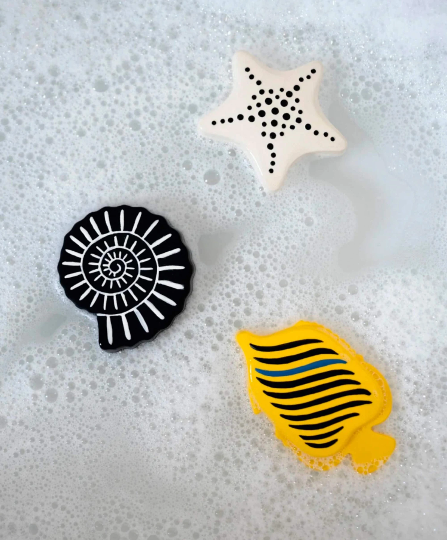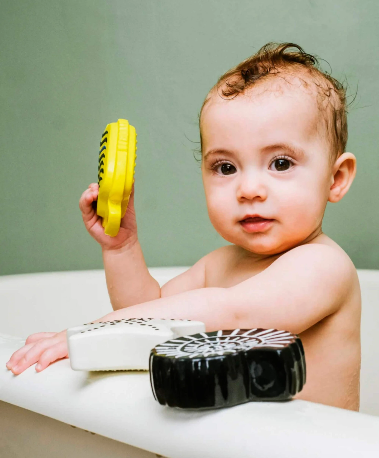 These playful bath toys have been designed to support babies’ visual and cognitive development through their patterns, scales and colours. Hand painted on one side with raised features on the reverse for a physical sensory experience as well as a visual one. Babies’ will love the look and feel of the natural rubber, and they’re as good for chewing as they are for water play. They’re also fully sealed so no nasties can get in.