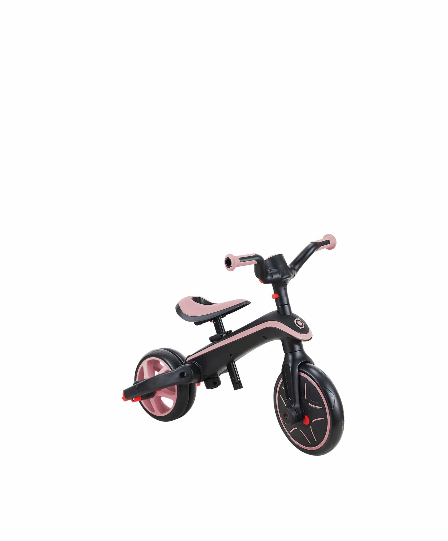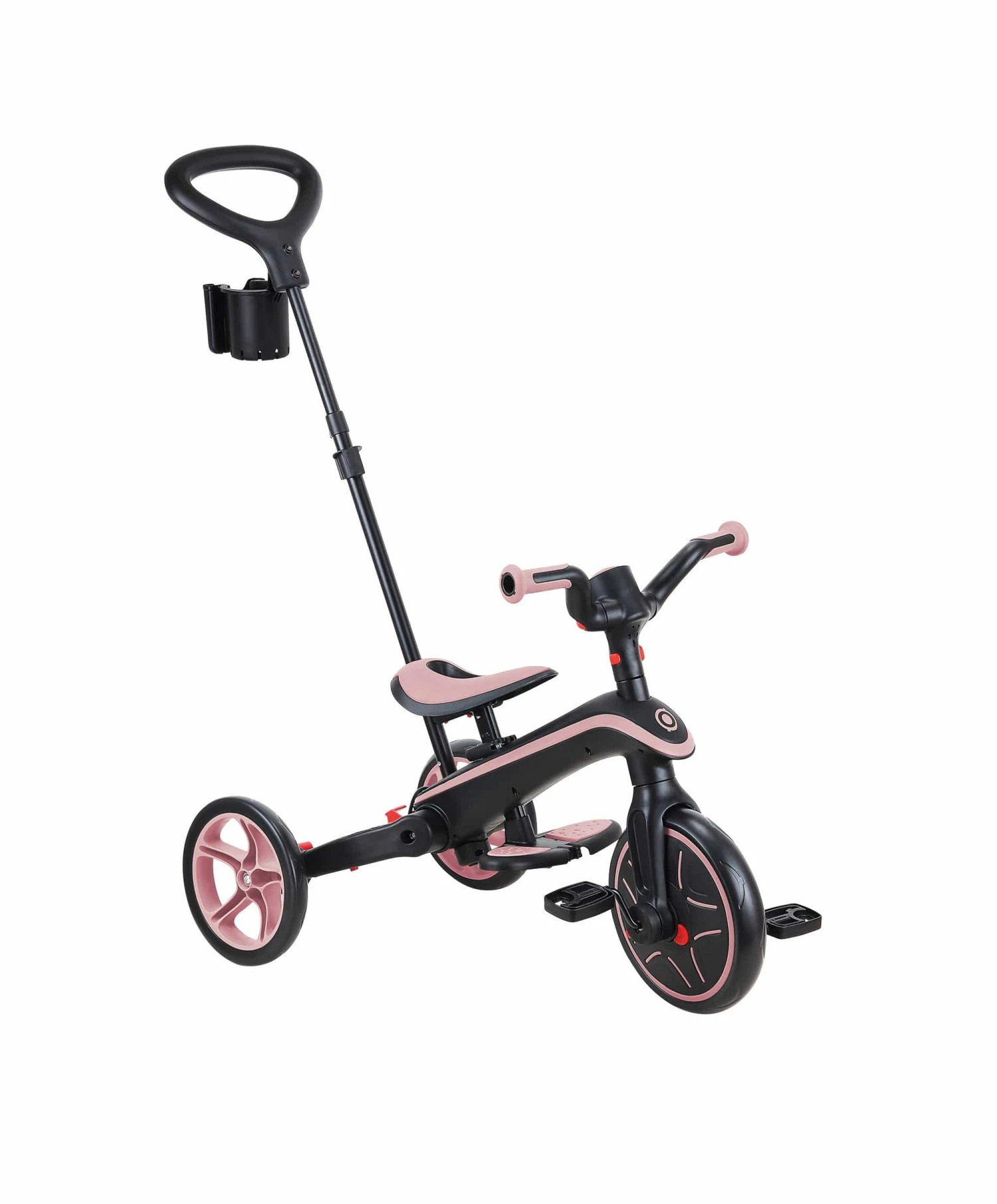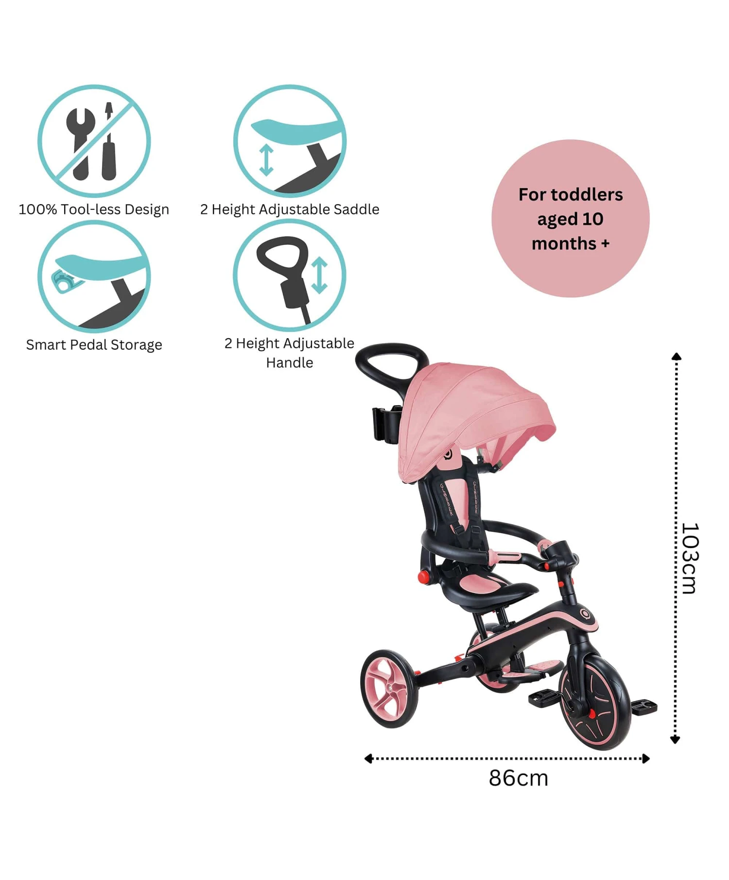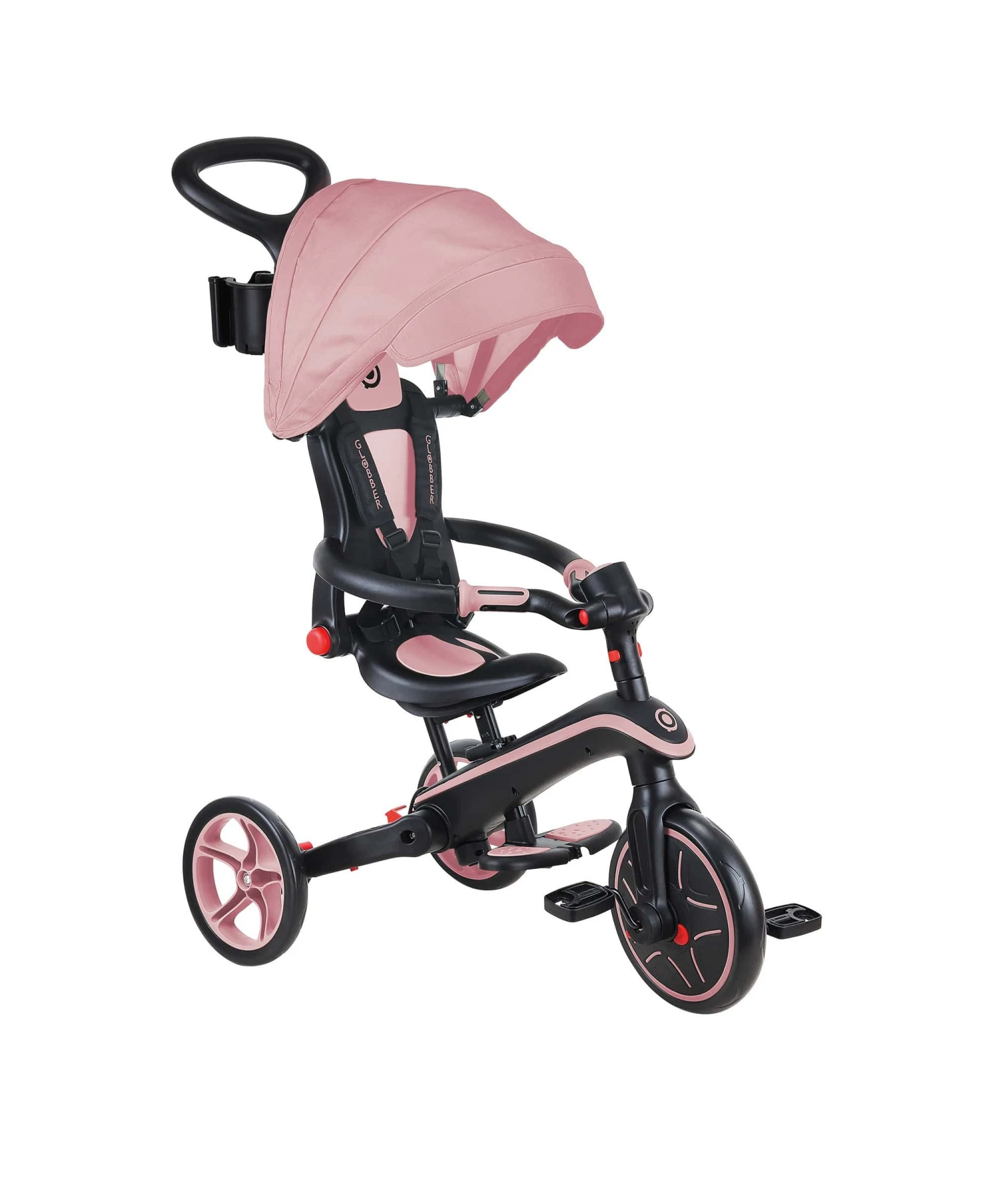 Foldable with a handy carry bag for even more convenience, the Globber EXPLORER TRIKE FOLDABLE 4in1 is the perfect all-in-one companion to your family’s outdoor adventures! Suitable for little ones 10 months to five years+, to see them develop through their toddler years and beyond. Easy to transport with the patented scissor folding system and smart handlebars, the tricycle can be folded into trolley mode in an instant, meaning taking the trike on the go and putting it away after playtime has never been so simple! The trike can be easily converted between its four forms, as the child grows, thanks to the 100% tool-less design. When assembled as a toddler tricycle, it can be adapted for when kids develop. From infant trike when they are 10 to 36 months, to guided trike for 18 to 36 months, to training trike for 24 to 36 months – and for when they are ready, a balance bike for 2 to 5 years. With a patented wheel mechanism, adults can easily transform the trike through the modes to meet their little one’s stage in development. Without the need for tools, the process is both quick and simple! With a built-in front wheel system locking system for optimum safety. Infant trike: Pushchair with parent handle to keep little ones safe and comfortable. Guided trike: A great tricycle to help toddlers learn to steer with the parent handle. Training trike: Encourage little ones to learn to steer and balance by removing the trike’s parent handle. Balance bike: Toddlers can show off their trike skills as they balance independently. The Trike has been designed to include a 5-point safety harness with comfortable shoulder pads, high-back seat, kid’s wide, removable footrest and safety bar when in infant trike mode. For those sunnier days, the detachable, adjustable anti-UV (UPF 50+) canopy will add style and protection. Quench kids’ thirst on the go and store their water bottle in the integrated bottle holder on the parent handle for easy access to hydration when travelling.