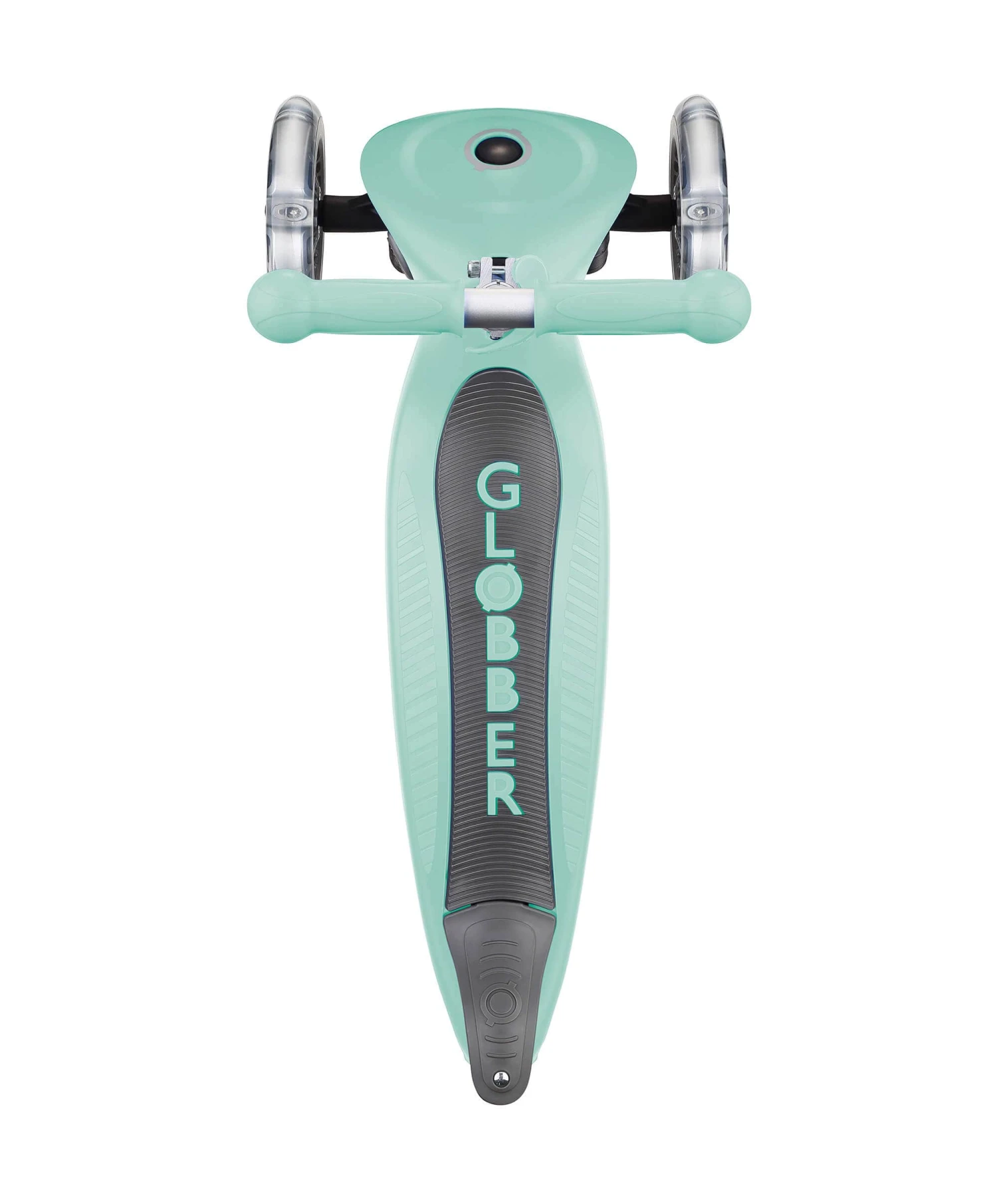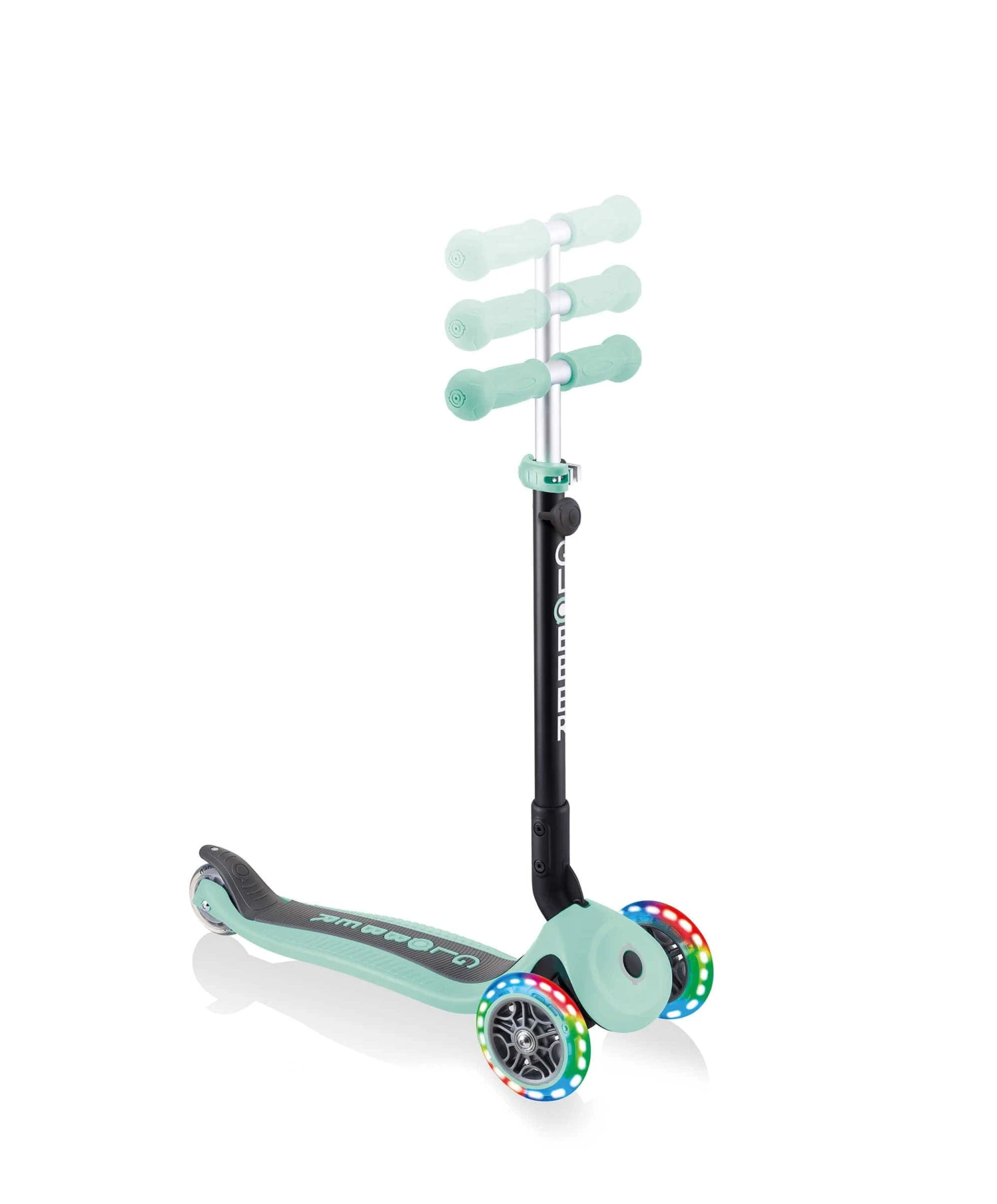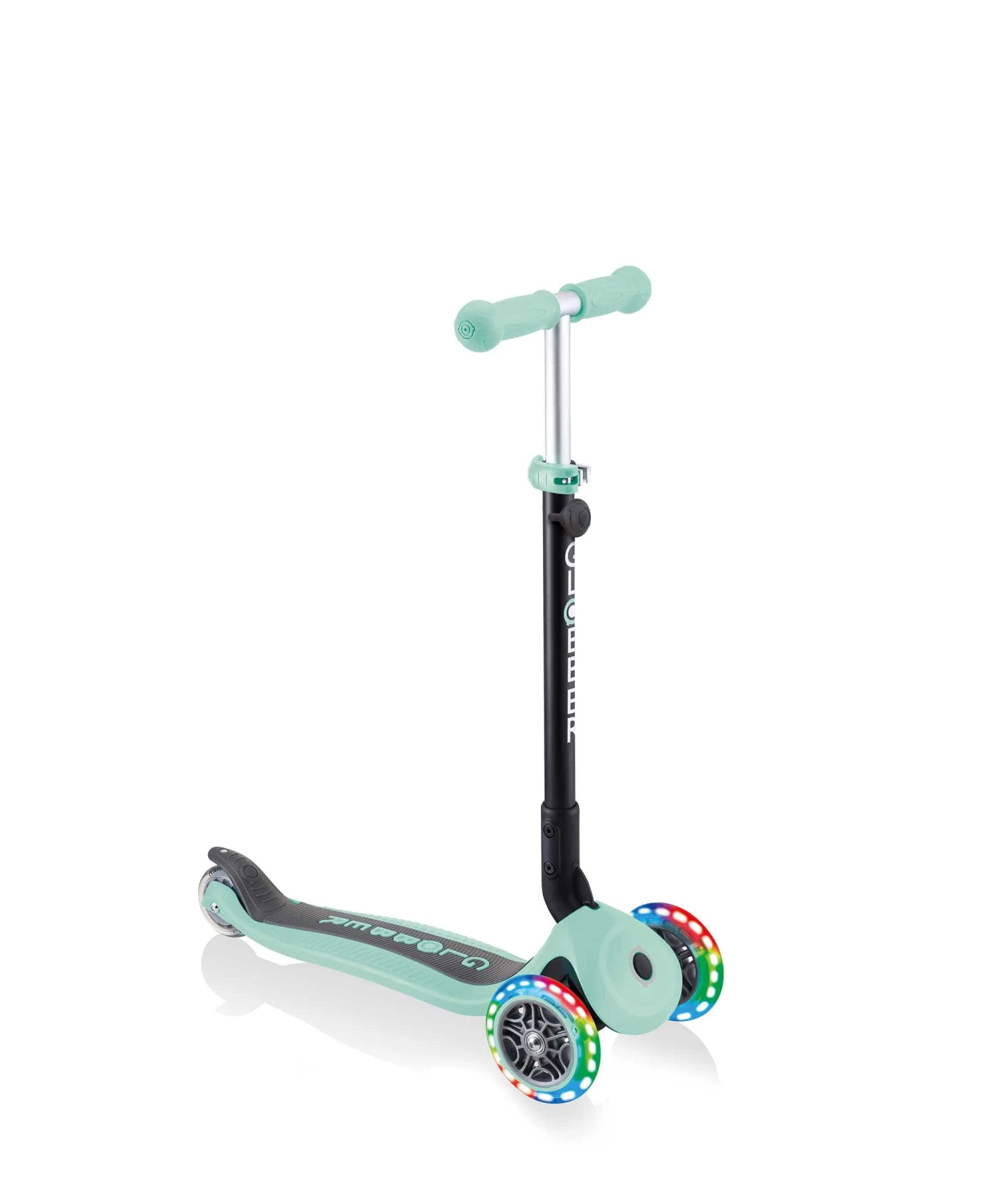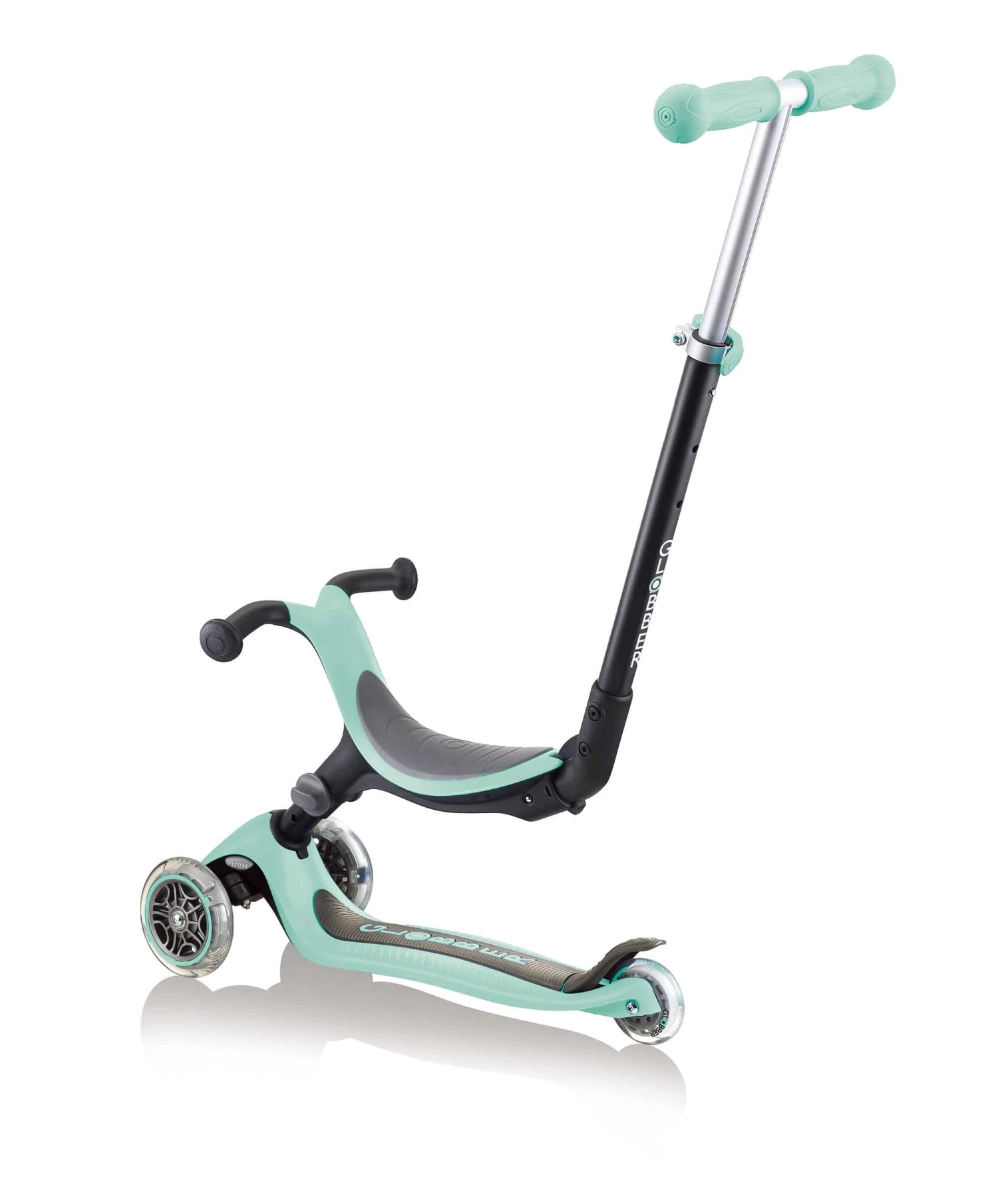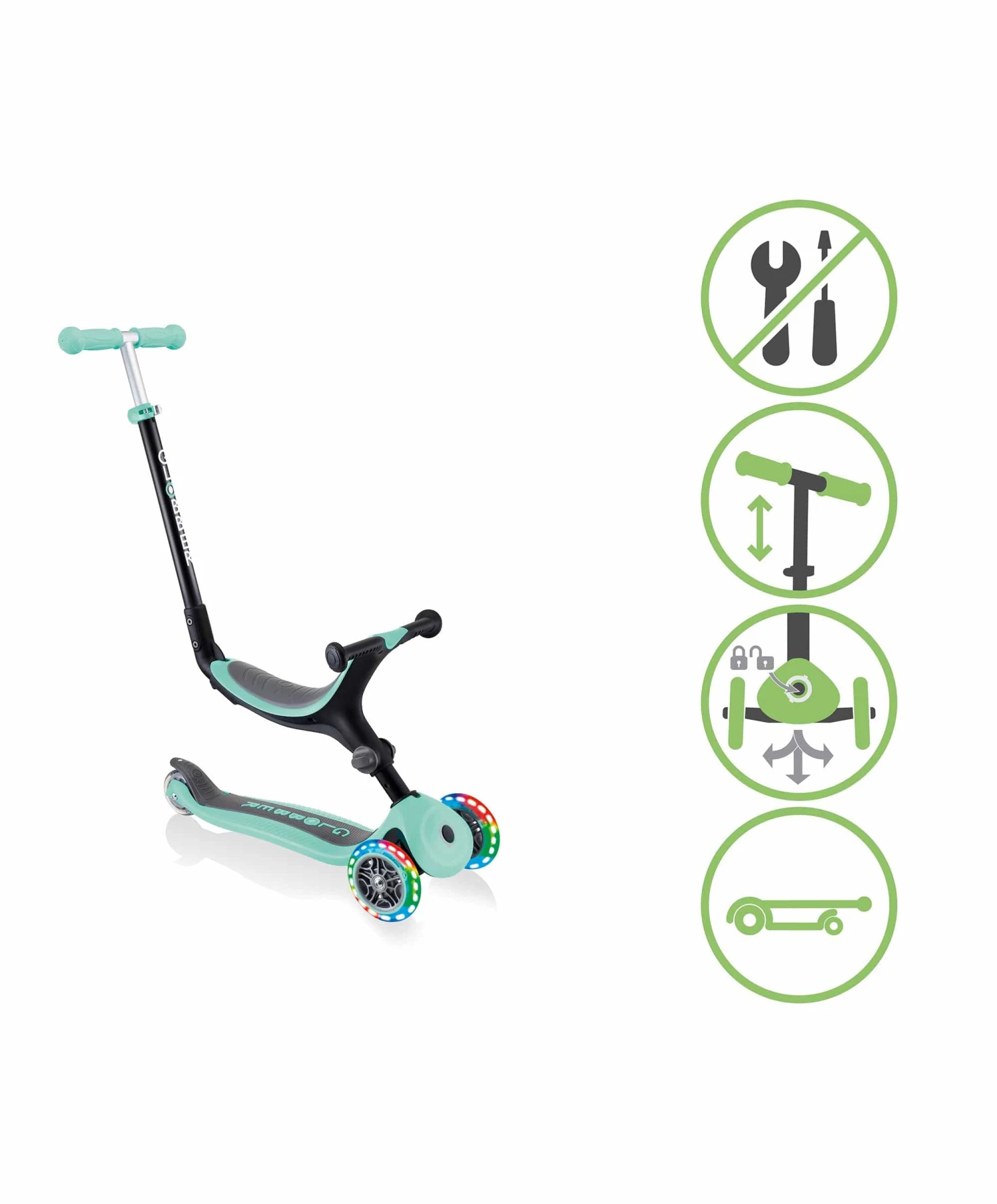 Adapting as your child grows; the Globber Go Up Foldable Lights delivers even more convenience and functionality! The Go Up series has been designed to adapt as your child grows and develops. This three-wheeled scooter can transform into three different forms; ride on pushchair, walking bike and scooter. The faster children ride, the brighter the front LED lights appear! Thanks to the dynamo technology, the wheels will flash green, red and blue. The push-button allows the scooter to pack down into trolley mode, making it more convenient to transport and store after playtime. With its patented steering lock button fixes the steering system of the two front wheels, allowing it to only move backwards and forwards. Children can ride safely with the extra-long and wide composite rear brakes, delivering on brake efficiency and prolongs wheel longevity. With an adjustable 3-height metal T-bar, it’s perfect for adapting as your child grows. The ergonomic, TPR grips and soft seat offers both comfort and durability.