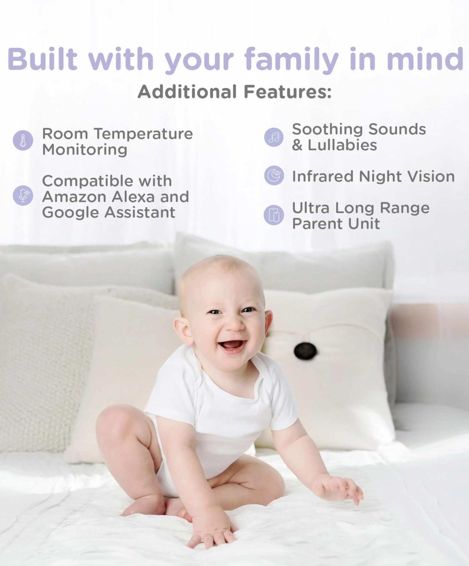 The Hubble Nursery Pal Glow+ is a smart HD video baby camera that enables you to keep an eye on your baby wherever you are in the world on your compatible smartphone or tablet. The HubbleClub Subscription, available on the HubbleClub by Hubbe Connected app, allows you to receive sound and motion notifications to your compatible viewing device so you can always stay connected to what’s going on. You’ll also have unlimited steaming and motion triggered recordings will be stored for 24 hours in the cloud. A wide range of analytics, including Video Recording and the Growth and Development Tracker, give you peace of mind that your little one is healthy and happy. See the room with remote scan, digital tilt and zoom functions, and communicate while on the go with crystal-clear two-way audio. With the Hubble Nursery Pal Glow, you’re free to watch them dream from anywhere.
