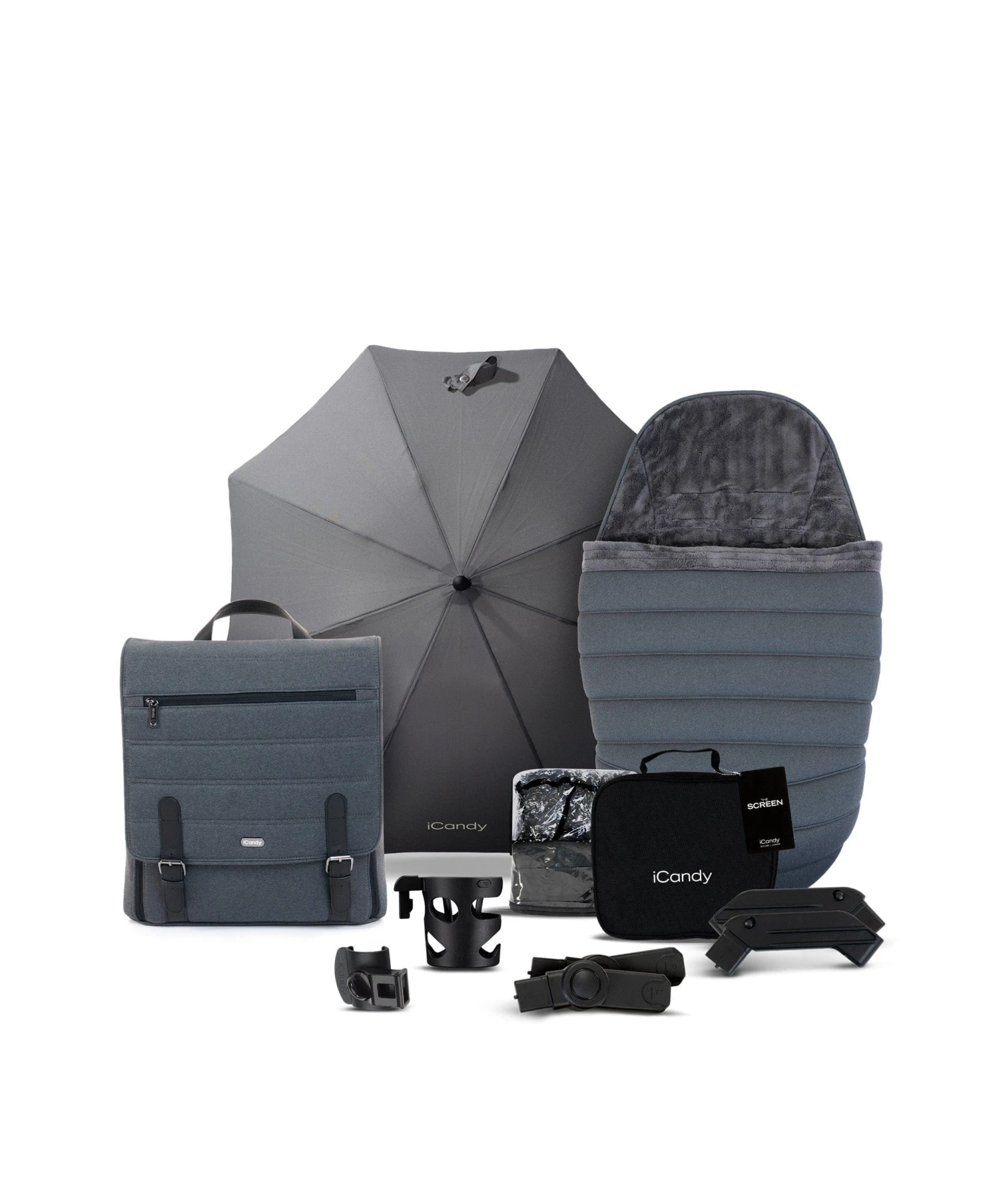 Includes accessory pack with raincover, backpack, footmuff, parasol, screen, cupholder