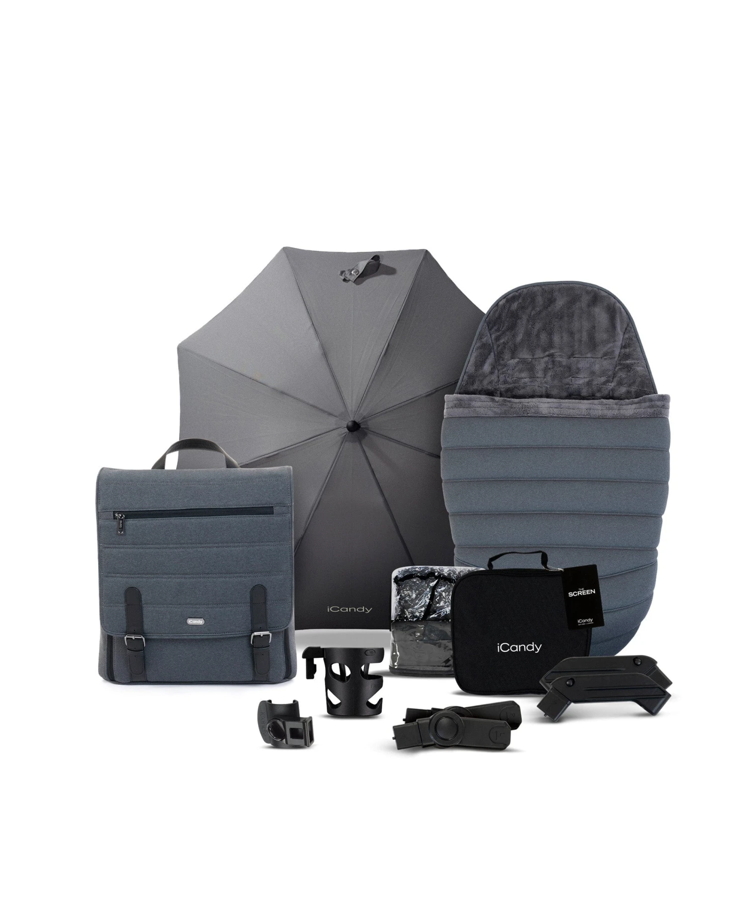 Includes accessory pack with raincover, backpack, footmuff, parasol, screen, cupholder