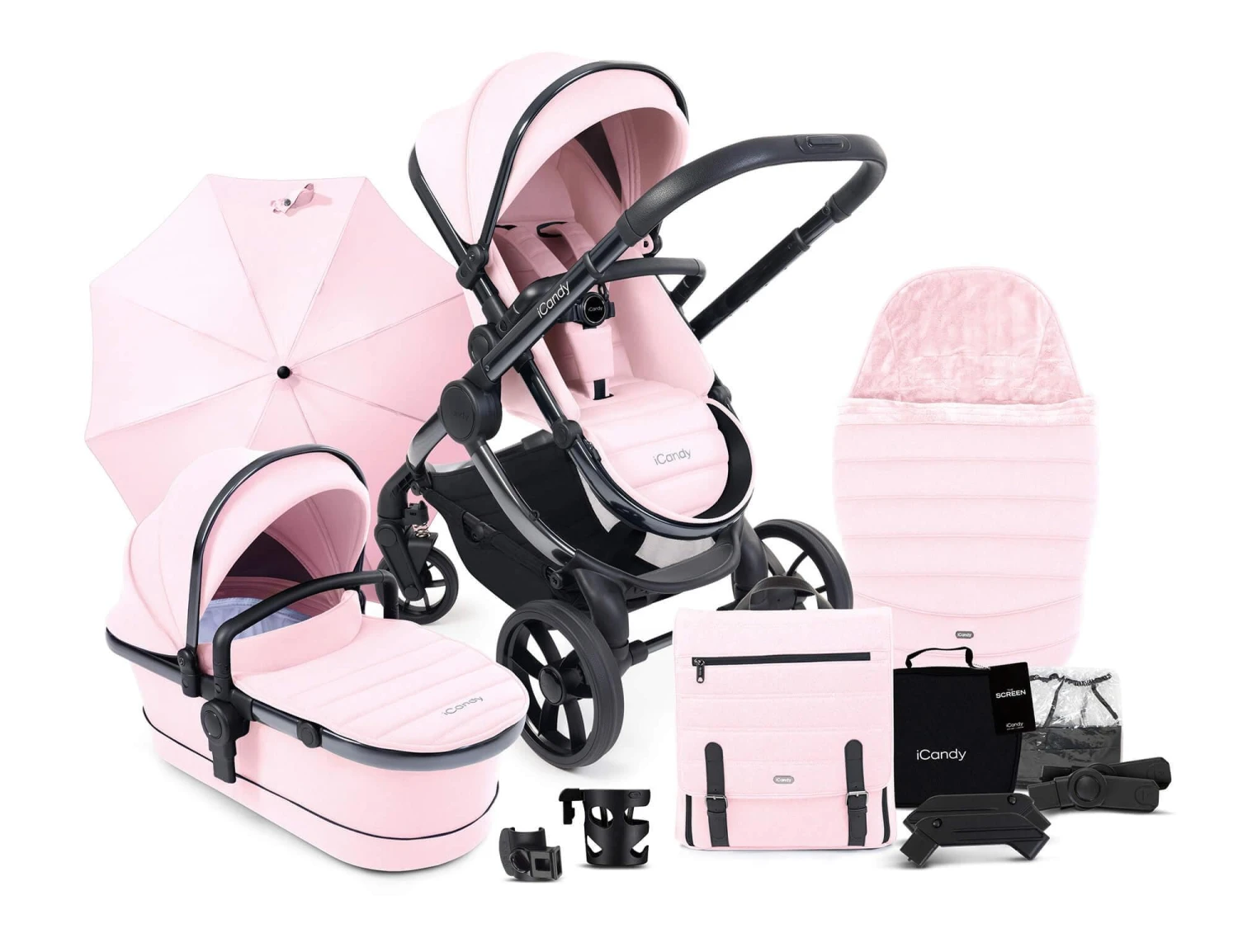 This Bundle includes: Pushchair, Carrycot, Maxi Cosi Pebble 360 Pro Car Seat and FamilyFix 360 Base, Car Seat Adaptors, Elevators, Raincover, Backpack, Footmuff, Parasol, Screen, Cupholder & Clamp