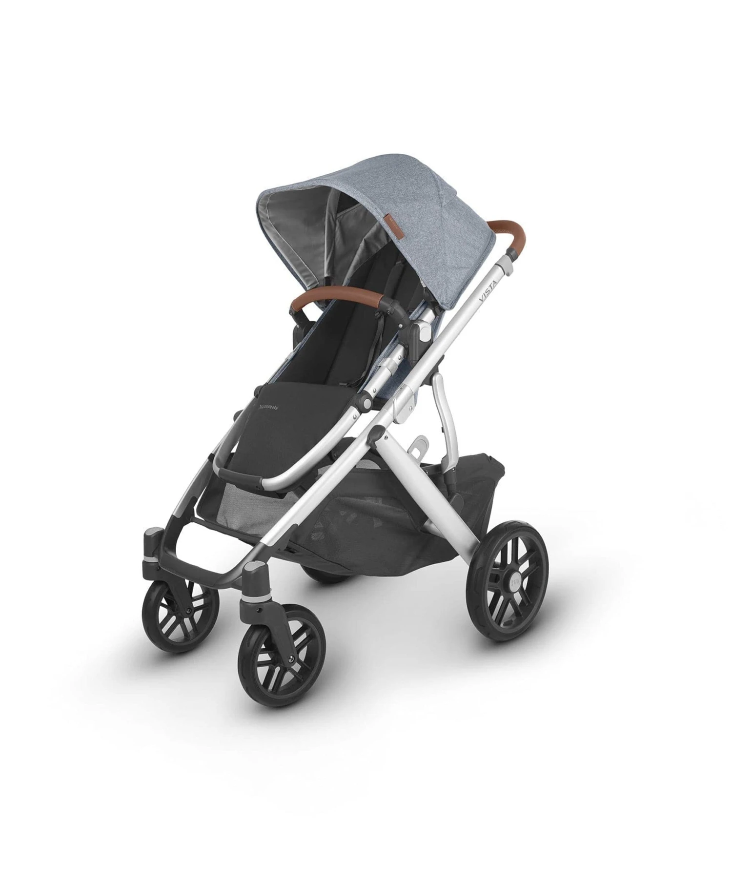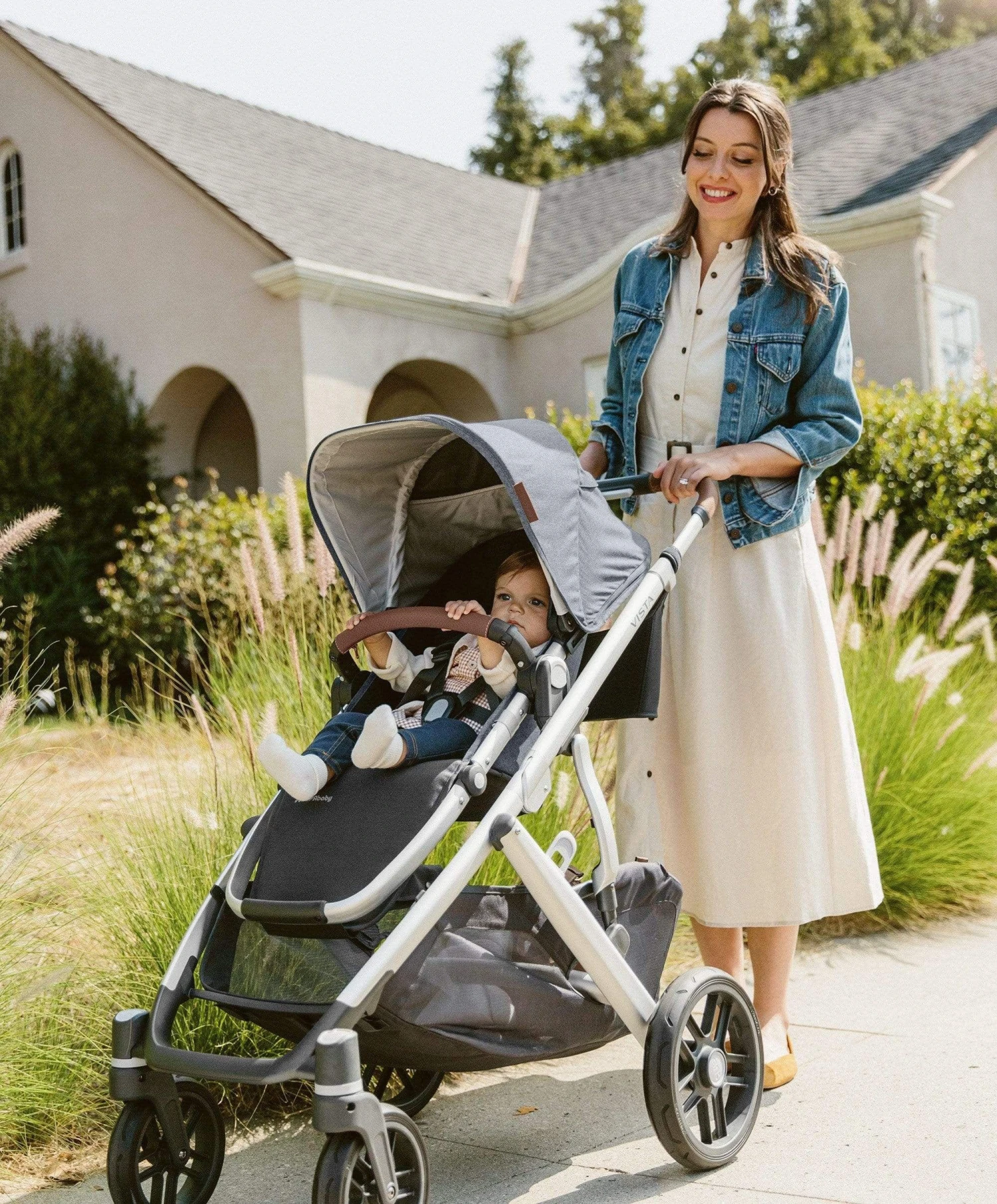 The Uppababy VISTA V2 pushchair with its enhanced performance features and intuitive design allows for multiple configurations, making transporting a second and third child a breeze – all while strolling like a single.