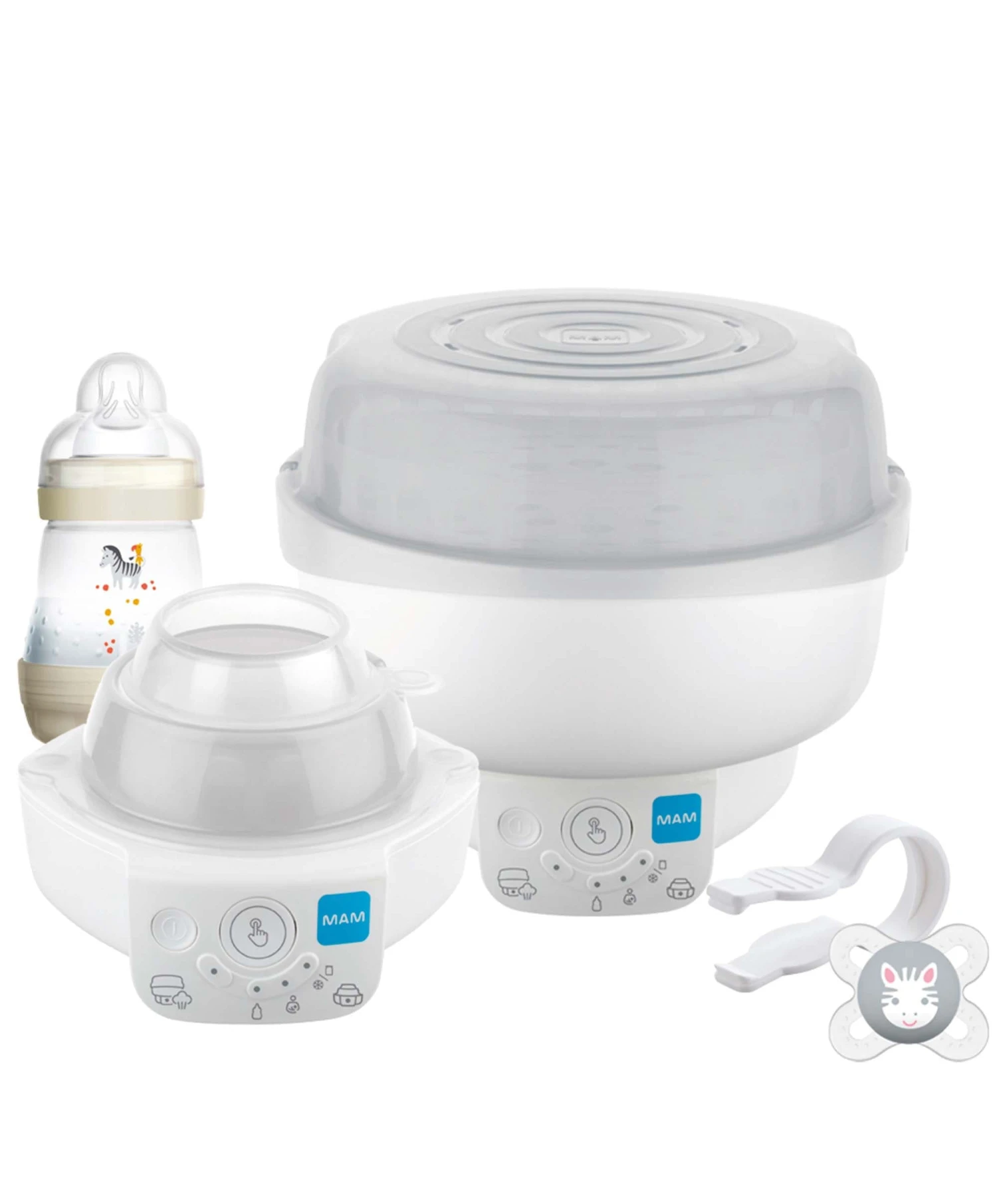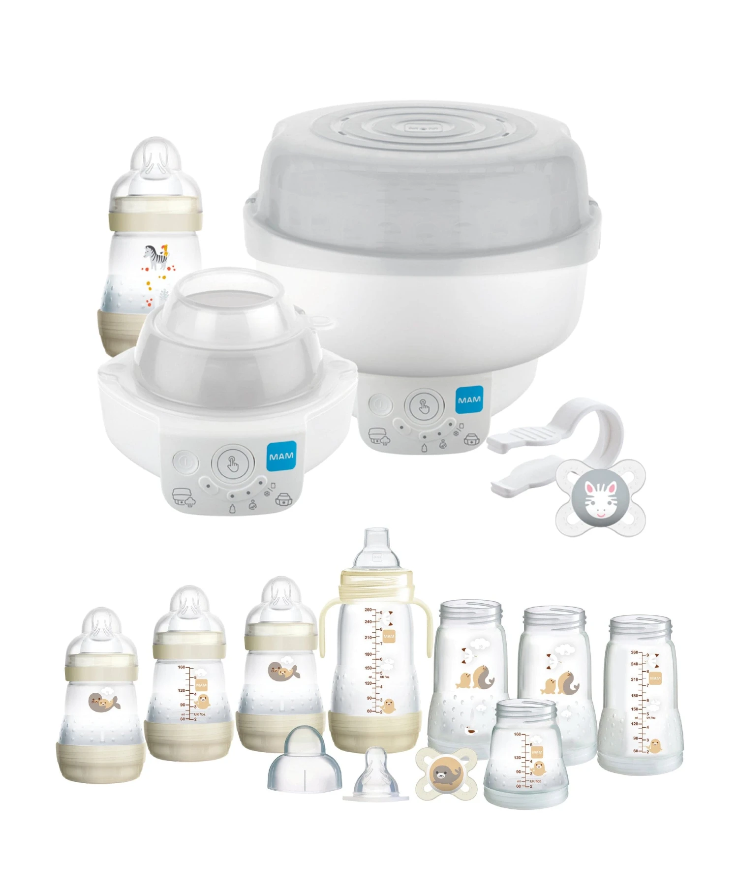 Bundle Includes: MAM Baby 6-in-1 Electric Steriliser, 4 x Easy Start 160ml Anti Colic Bottles with Size 1 Slow Flow Teats, 4 x Easy Start 260ml Anti Colic Bottles (Bottle bodies only), 1 x 0-2 months Soother, 1 x Extra Soft Bottle Spout, 1 x Hold my Bottle Handle