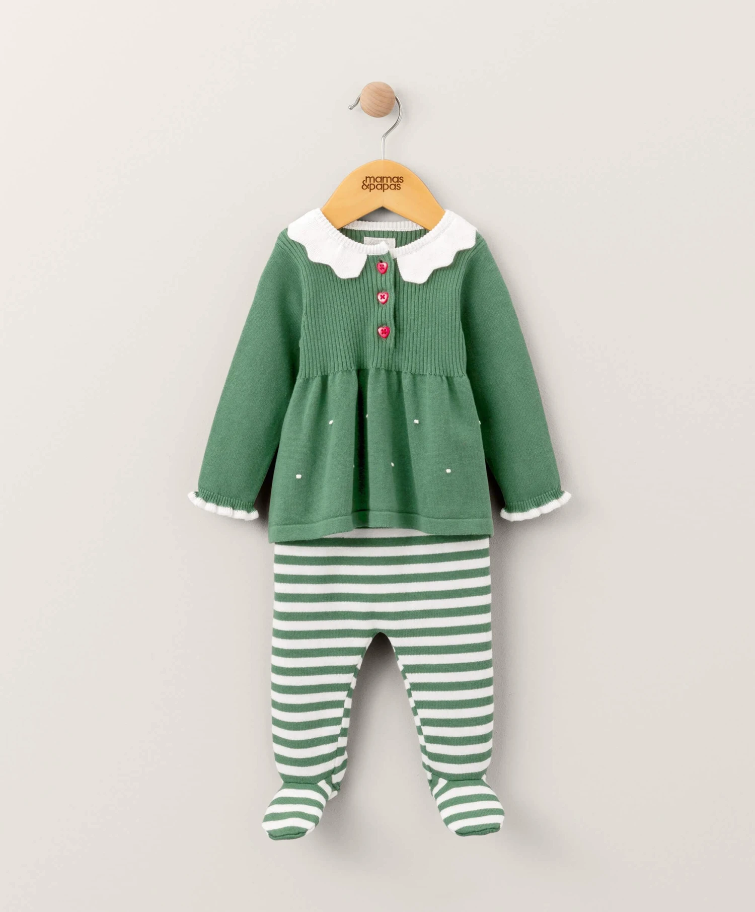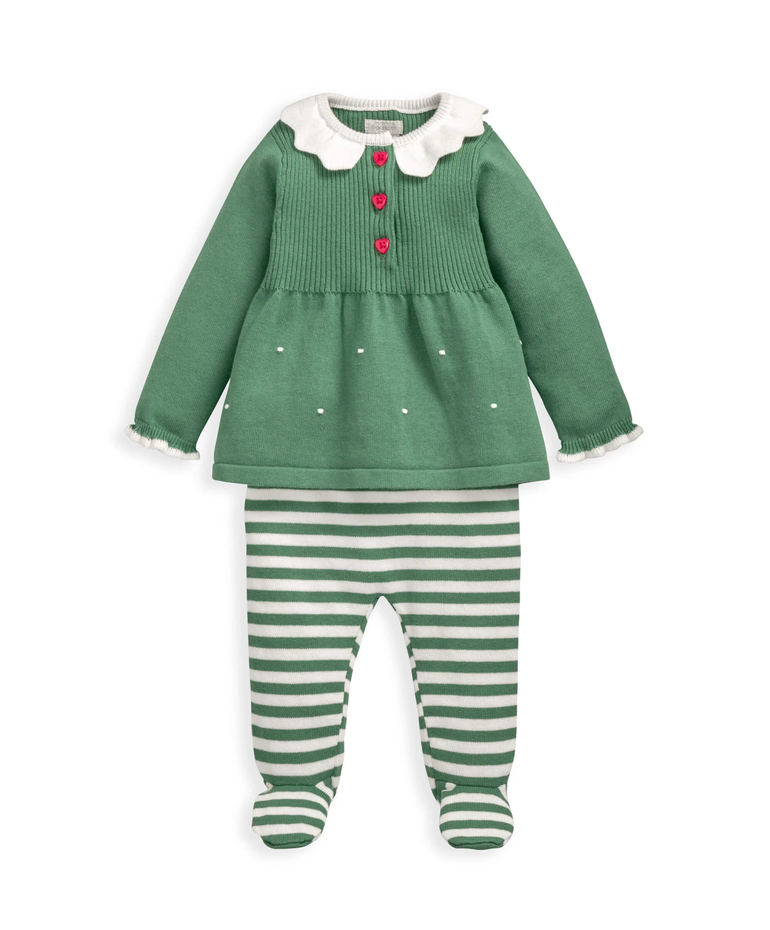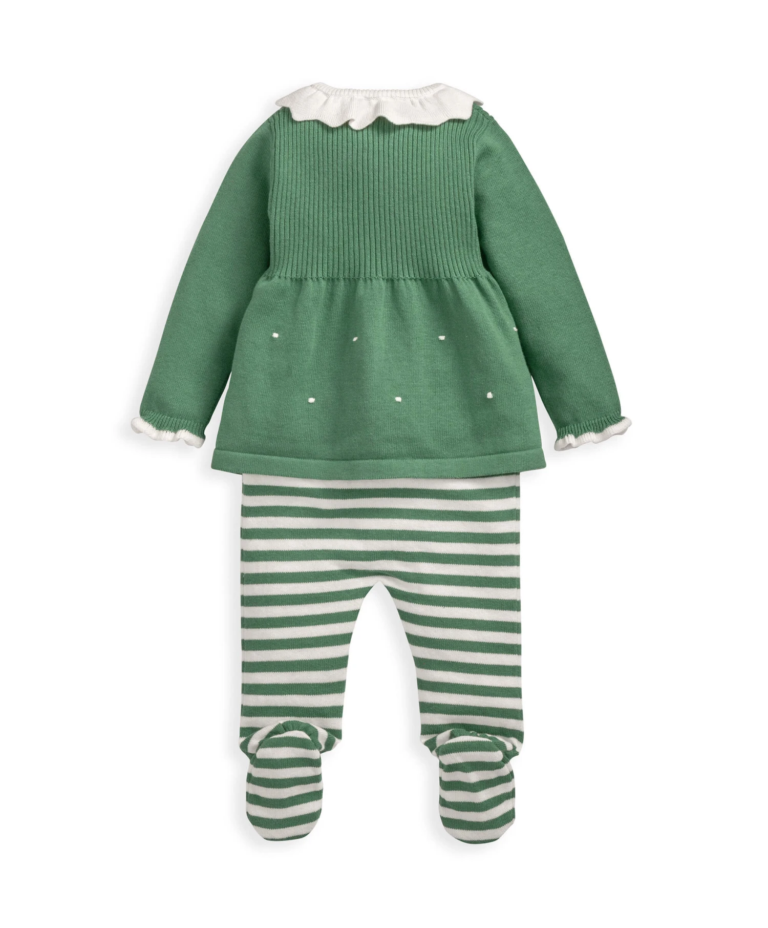 Novelty Christmas 2-piece elf set. Includes knitted top with collar detail, elasticated ribbed cuffs with contrast tipping around edge, cute 3D bobble detail and back button fastening. Striped leggings crafted from a soft jersey knit fabric and have enclosed feet. Elasticated ribbed waistband for easy dressing and nappy changes.