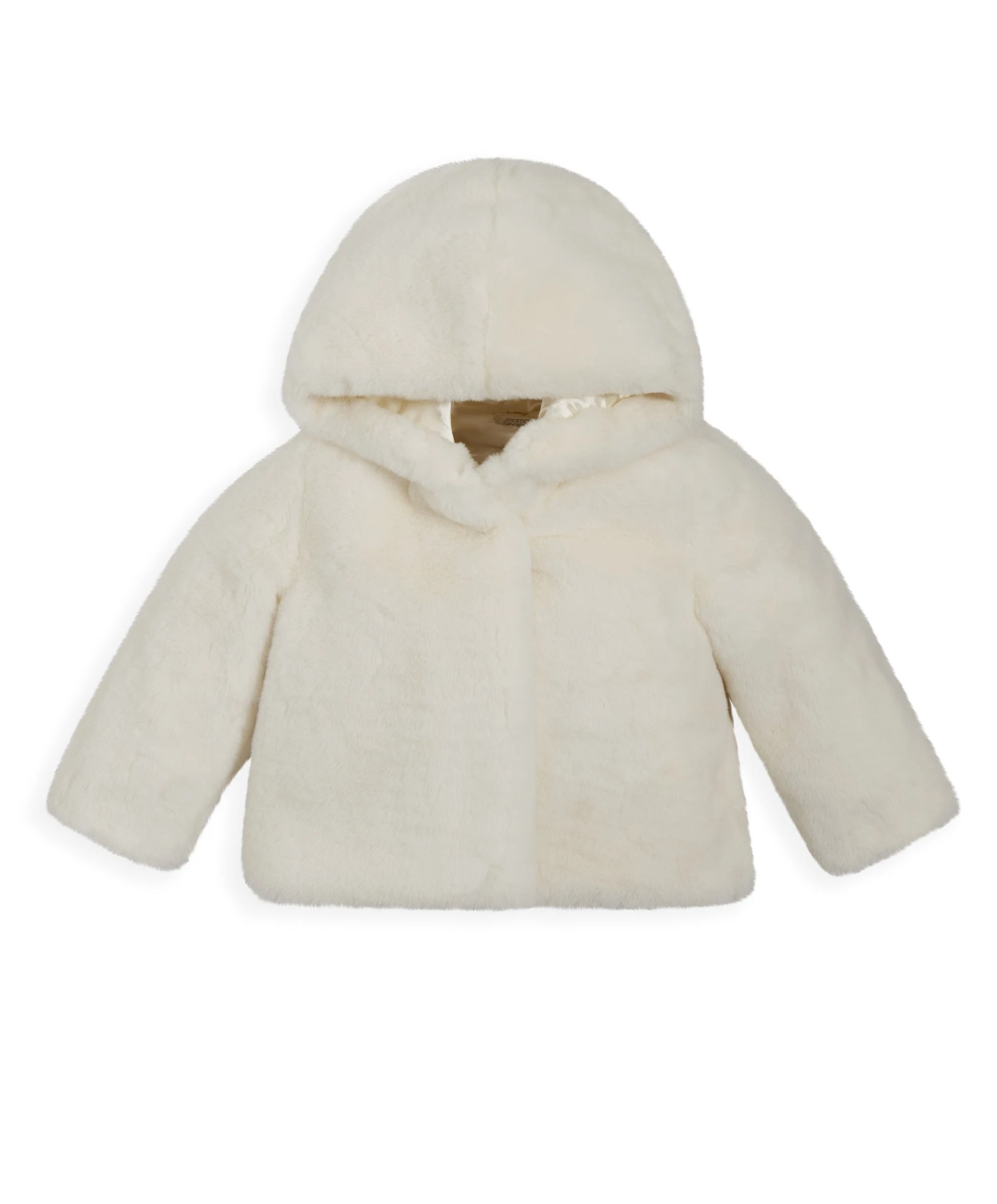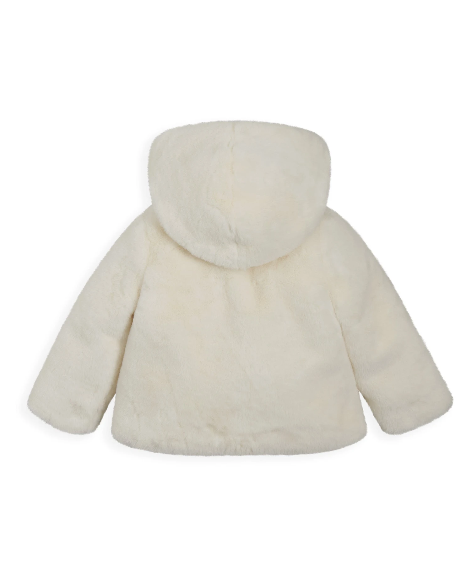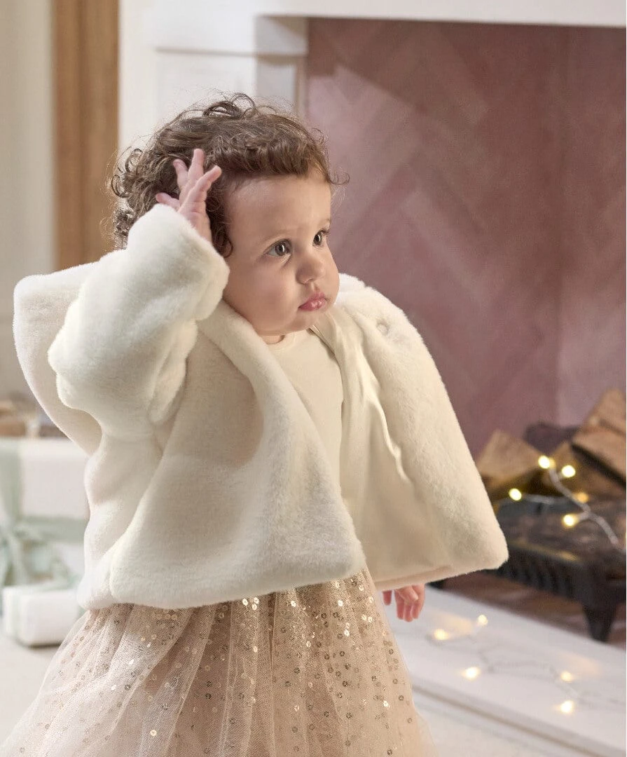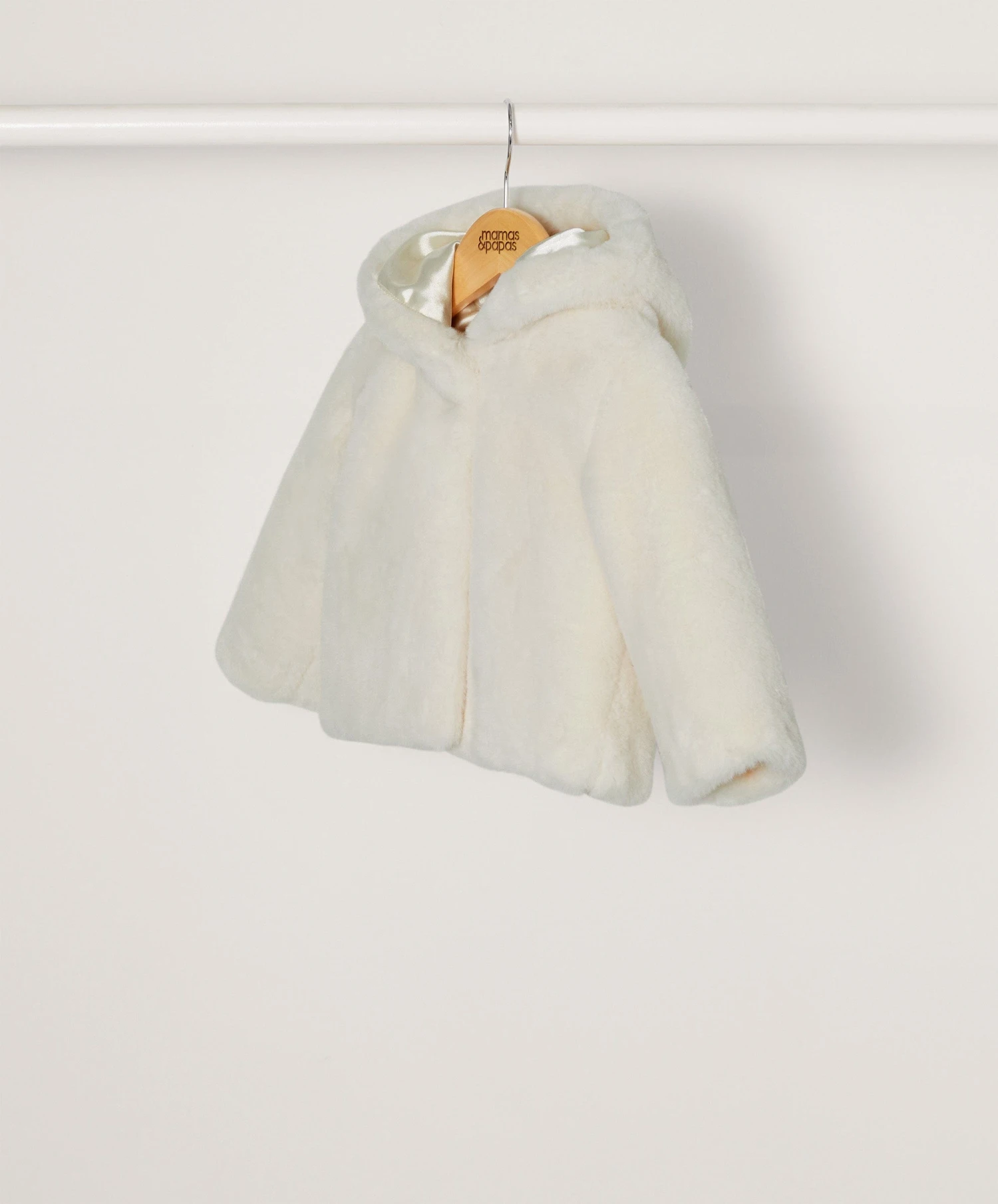 Put the finishing touches on your little one’s party outfit with this snuggly-soft faux fur coat. With a cosy hood and luxurious creamsatin lining, it’ll be really easy to slip on when the weather takes a turn. And thanks to the large concealed poppers on the front, getting it fastened up will be fuss free.