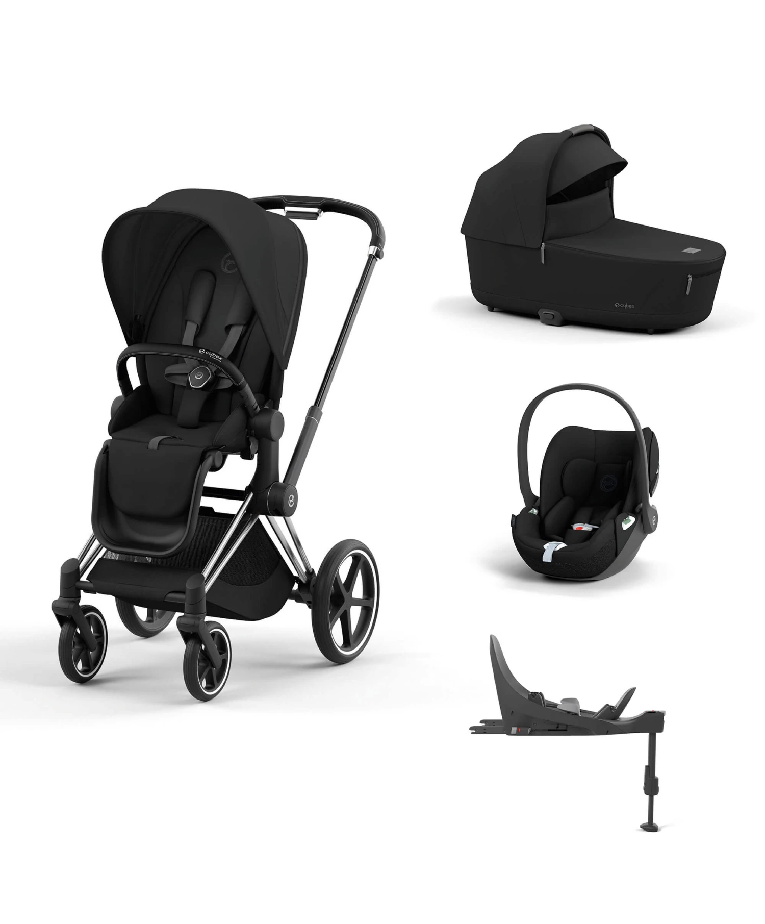 This bundle includes, Cybex Priam Frame – Chrome, Cybex Priam Seat Pack – Sepia Black, Cybex Priam Lux Carrycot – Sepia Black, Cybex Cloud T i-Size Infant Car Seat – Deep Black & Cybex Base T ISOFIX Base