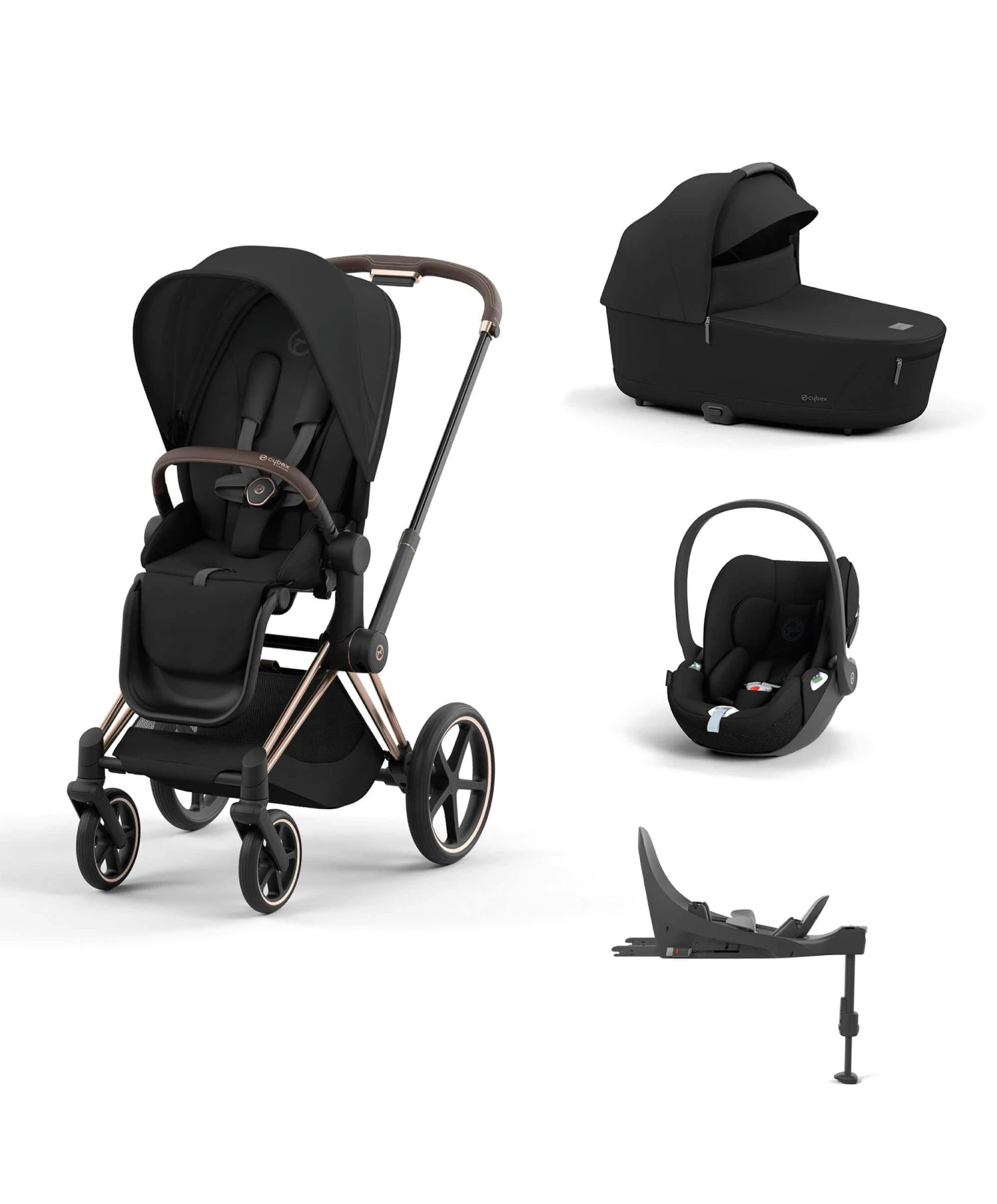 This bundle includes, Cybex Priam Frame – Rose Gold, Cybex Priam Seat Pack – Sepia Black, Cybex Priam Lux Carrycot – Sepia Black, Cybex Cloud T i-Size Infant Car Seat – Deep Black & Cybex Base T ISOFIX Base