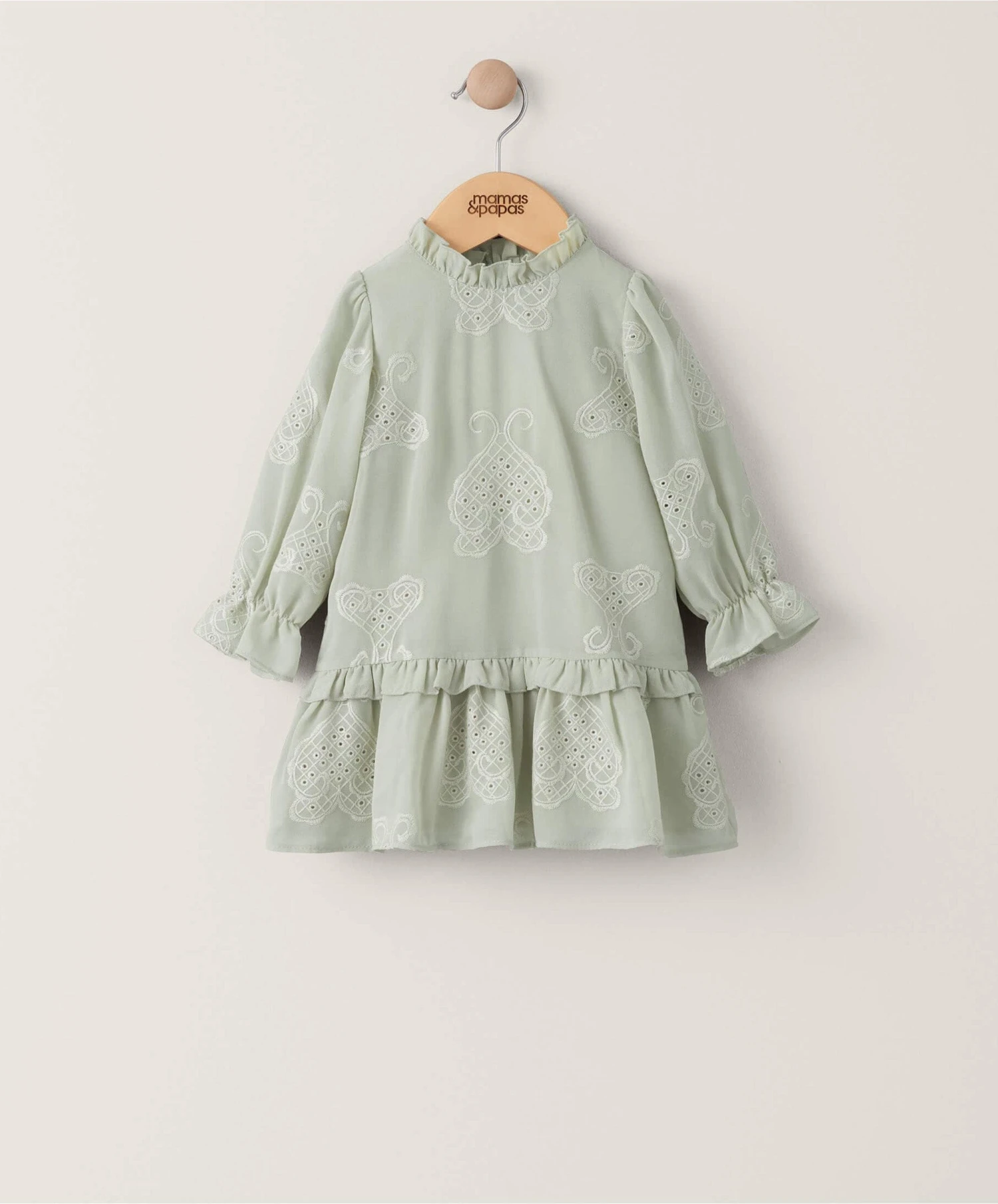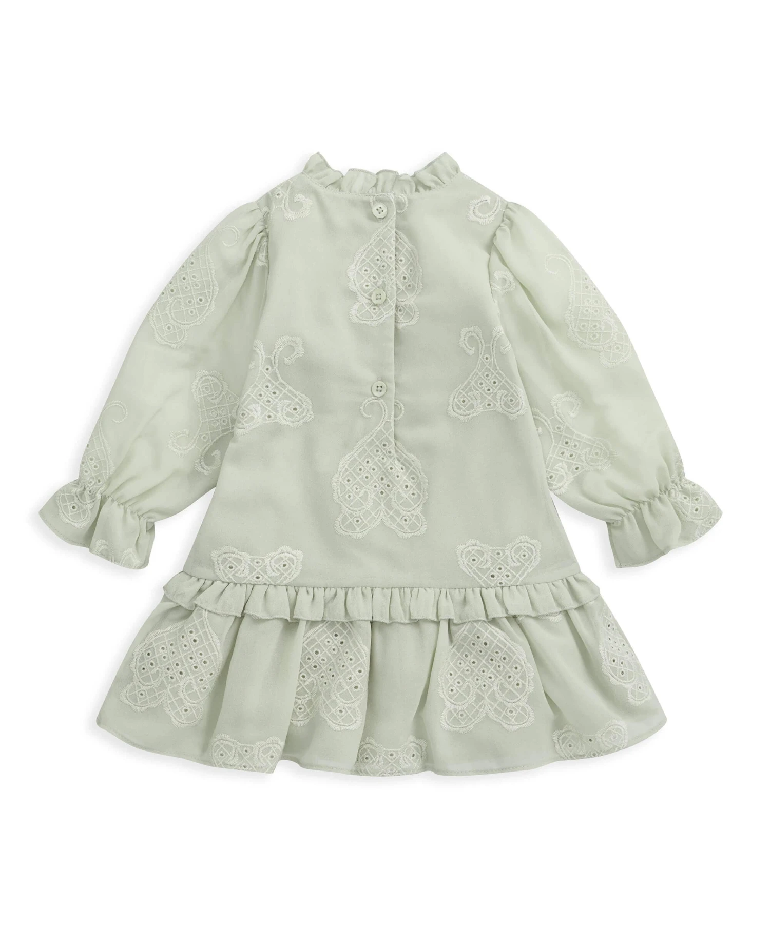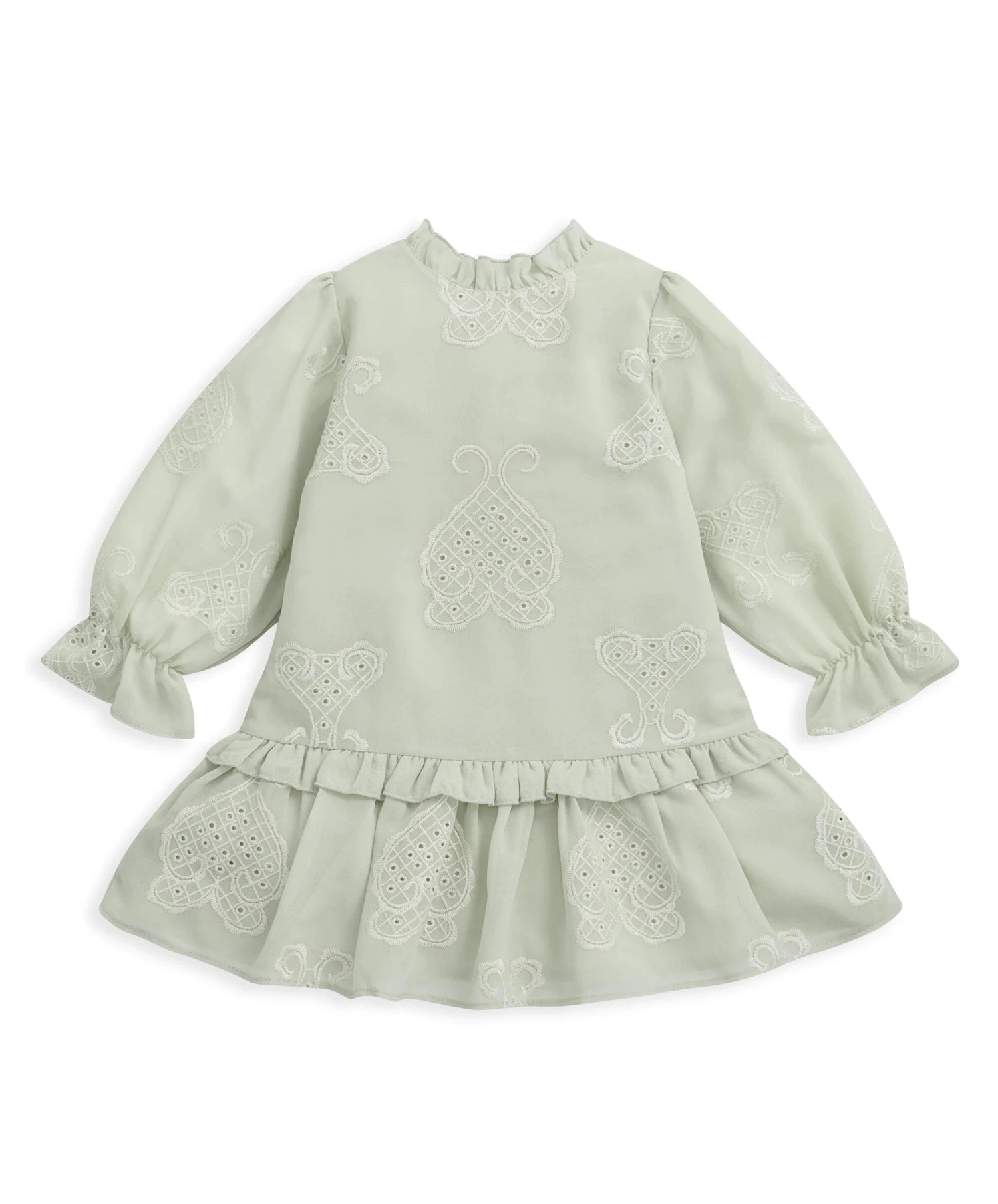 Romantic and whimsical, full of delicate lace detailing, this long sleeved dress is beautiul. In a delicate green shade, it features a dropped waist with frill, frill neck detail and embroidered lace detailing. Elastication at cuffs meas sleeves can be pushed up easily and are extra comfy. Centre bck opening with button trim. Fully lined with cotton.