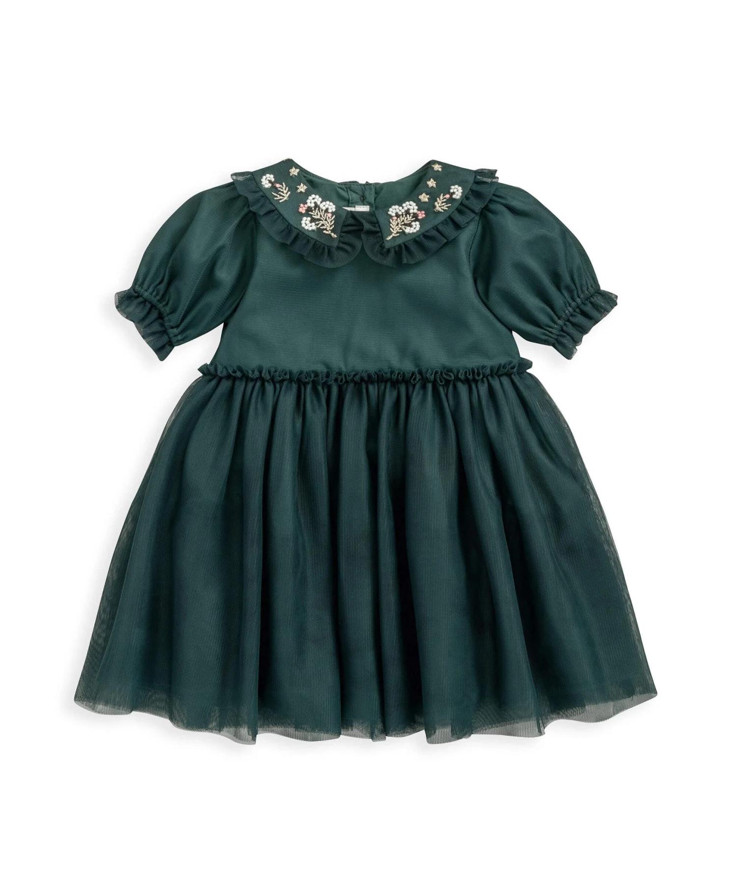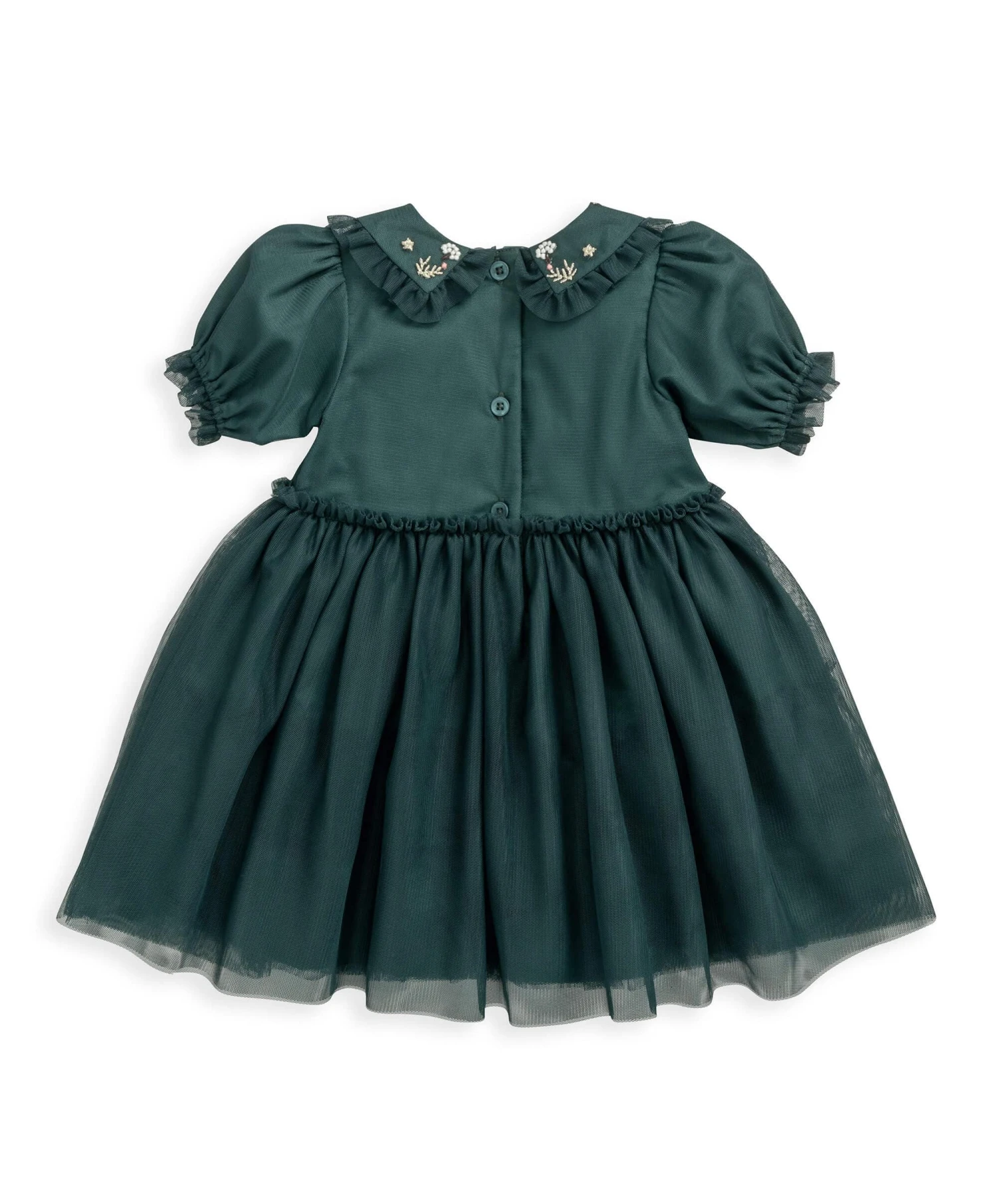 Dark forest green, rich in layers of gorgeous mesh, finished with frill detail to collar, waistband and sleeves. Beautiful hand-stitched style embroidered flower detail and shimmering stitching on collar. Button back fastening. Extra full skirt. The perfect dress for a special occasion.