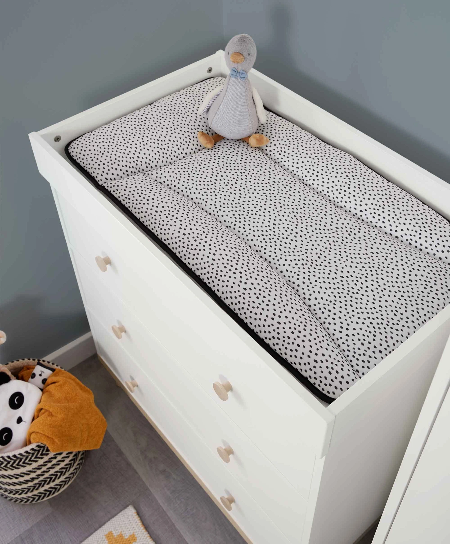 Our essentials spotted print baby changing mat will make those nappy changes simple. With a wipe-clean PVC design, you don’t need to worry about those little accidents and spills, and the reversible design means you can choose the side that suits your décor. We’ve designed our changing mats with smooth edges, with no scratchy bits or tags that’ll irritate your baby’s delicate skin. In addition to its practical features, our essentials spotted print baby changing mat offers a host of benefits that enhance both functionality and aesthetics. We understand that as a parent, you value convenience, which is why our baby changing mat is designed with portability in mind. It’s lightweight material makes it easy to transport from room to room, allowing you to have a dedicated baby changing station wherever you go. Whether you need to change your baby’s diaper in the nursery, living room, or even while traveling, our baby changing mat ensures that you’re always prepared. And because they fit all of our Mamas & Papas dresser and cot top changers, it makes the perfect finishing touch for your nursery.