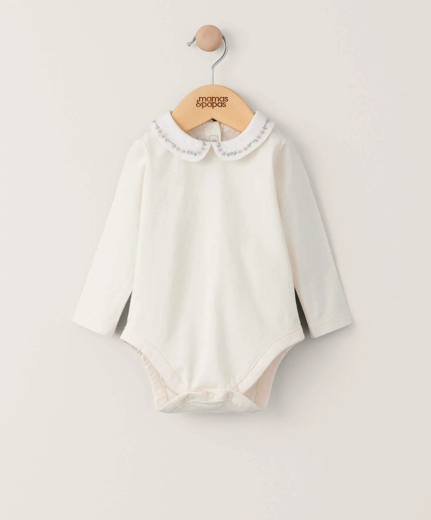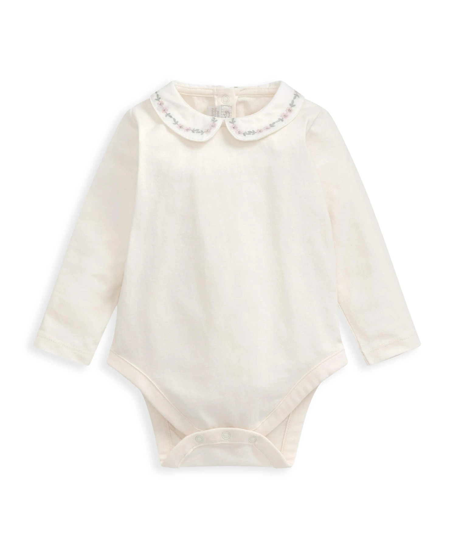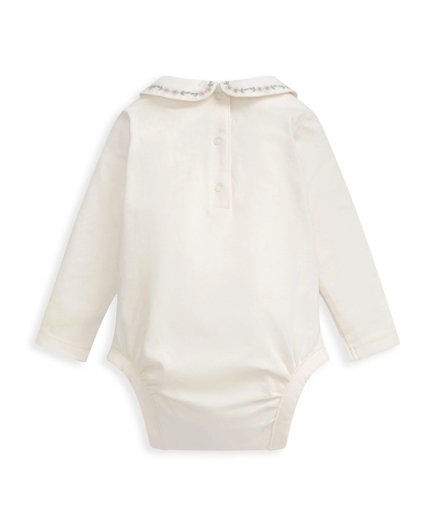 A super soft, jersey collared bodysuit. The collar features a delicate floral embroidery detail with a beautiful lace trim around the edge. Full of practical features too, it features elasticated cuffs, popper opening at crotch for easy changes and back placket opening with popper trim. This bodysuit can be teamed with a tutu to create the perfect Occasion look for your baby.