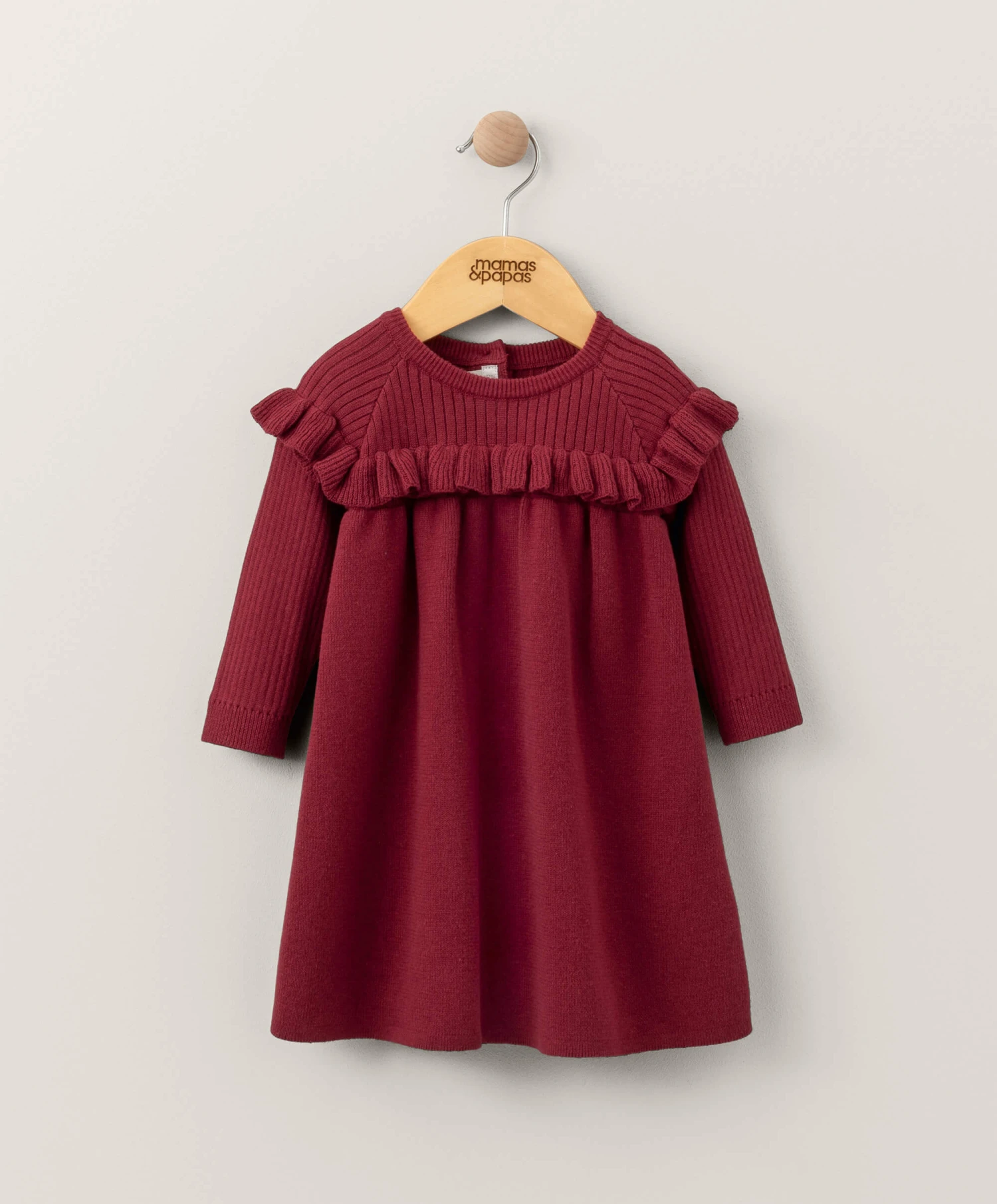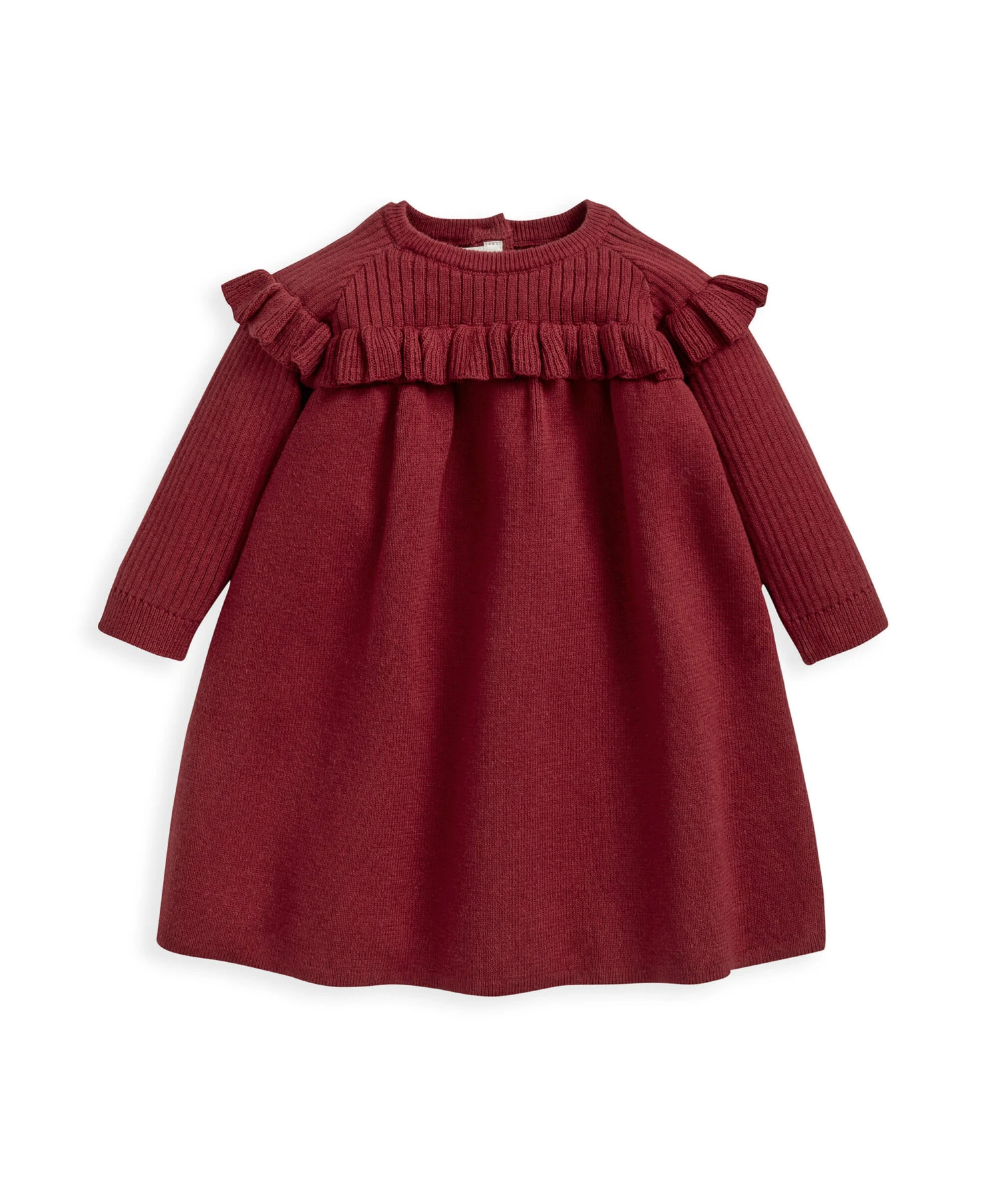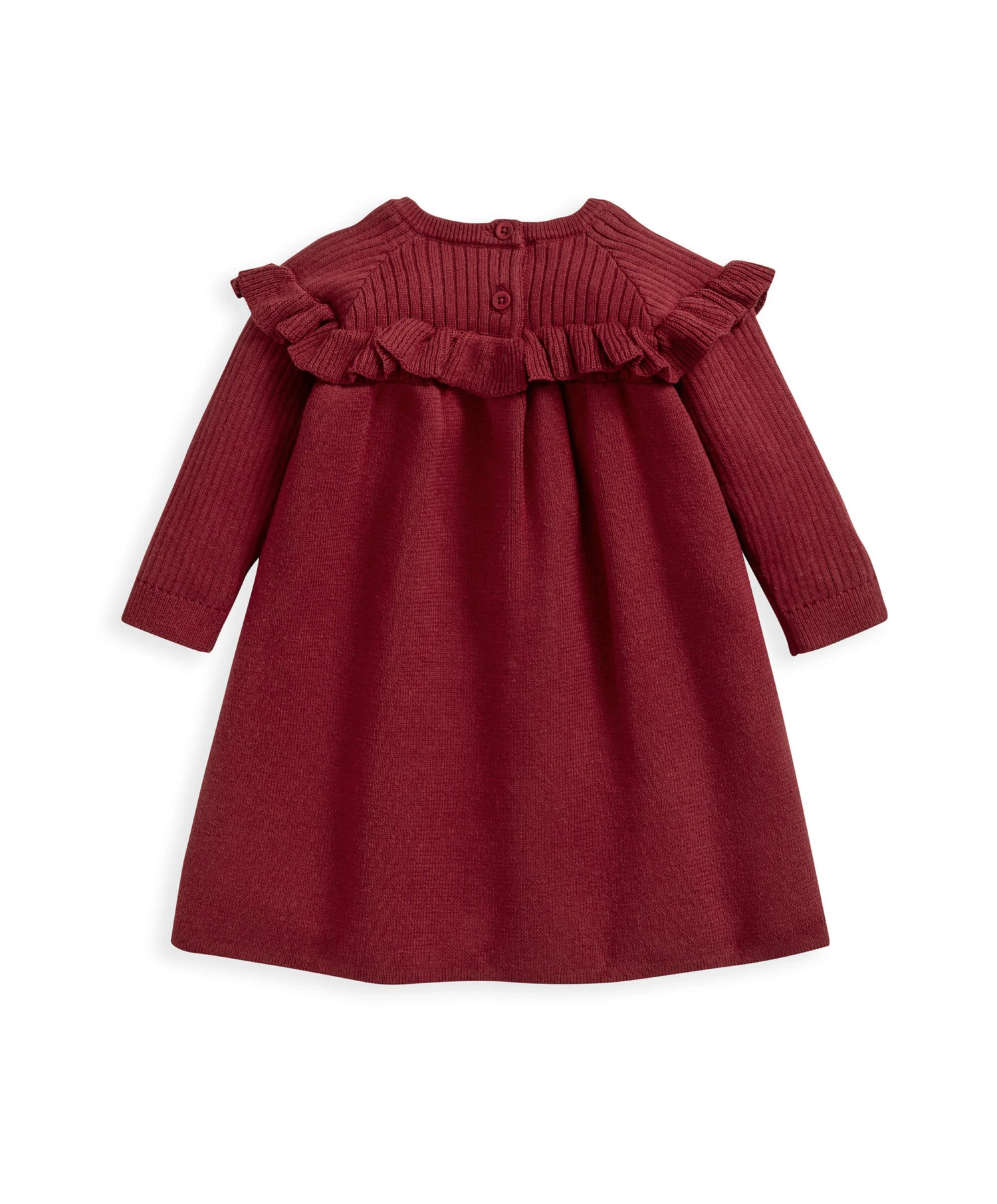 Gorgeous cosy knitted dress with frill detail. Button fastening down the back. Finished with ribbed cuffs.