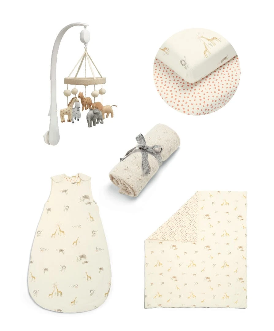 This bundle includes 5 pieces: Jungle Cotbed Quilt, Jungle Dreampod 0-6m – 2.5 Tog, Jungle Cotbed Fitted Sheets – 2 Pack, Born to be Wild – Oatmeal Pointelle Blanket & Born to be Wild Cot Mobile from our jungle essentials collection.