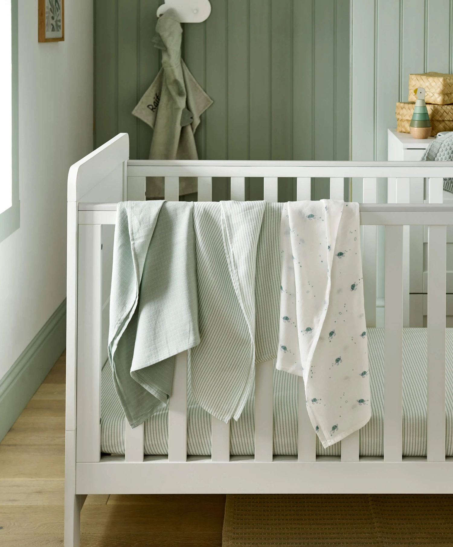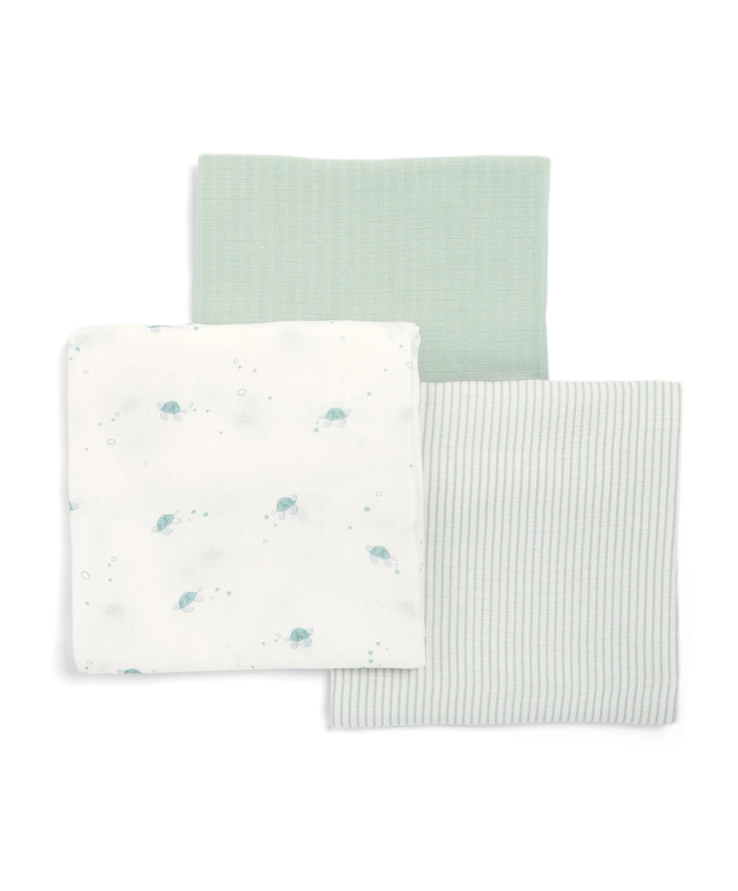 Handy 3-pack of muslin cloths, ideal for mopping up spills on your little one or yourself! In a large 90x90cm size these ultra-useful muslins are crafted from super soft cotton and co-ordinate effortlessly with the rest of the collection. With different prints – 2 x turtle print and 1 x soft stripe print – in playful sea-inspired aqua, green and blue shades.