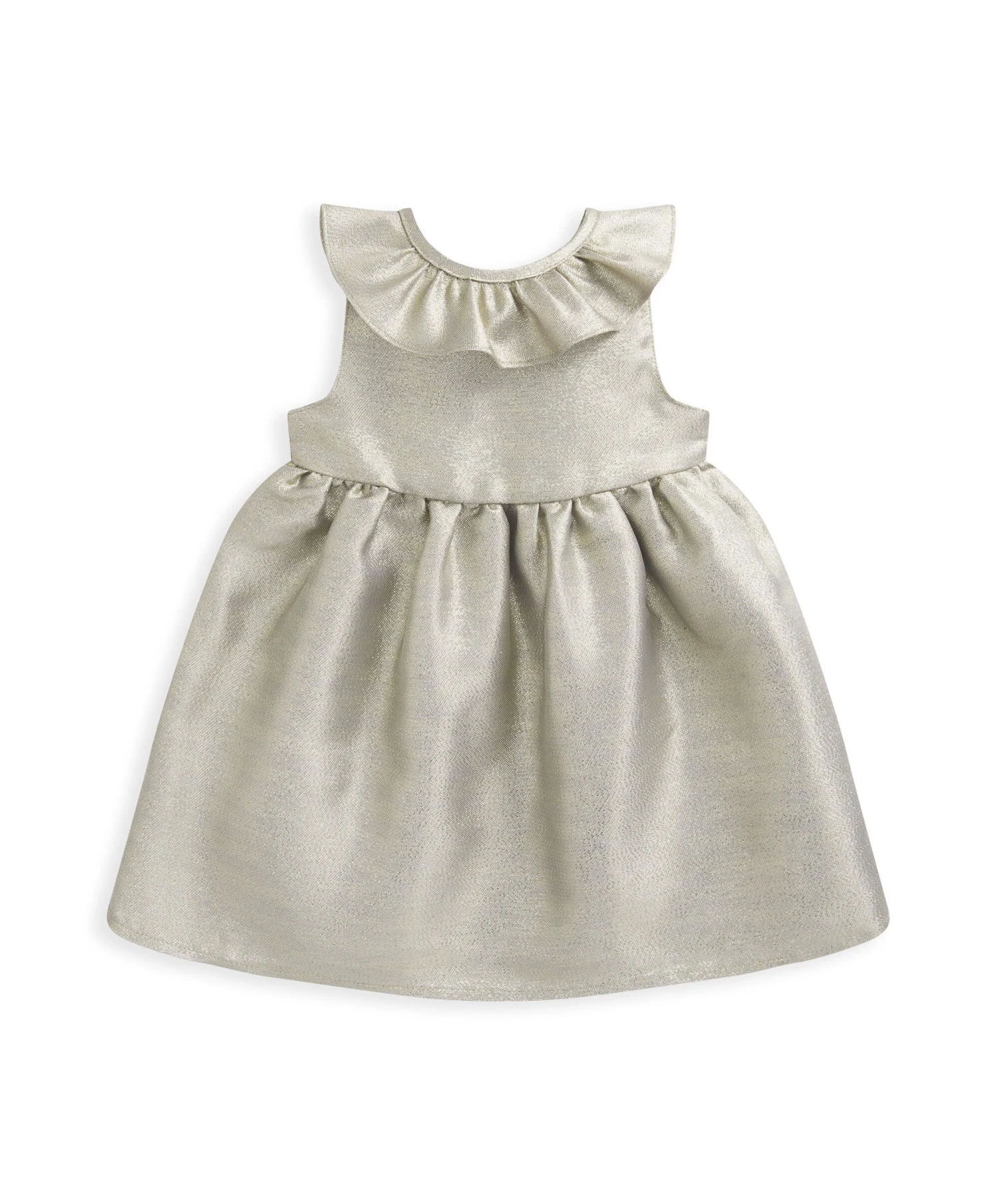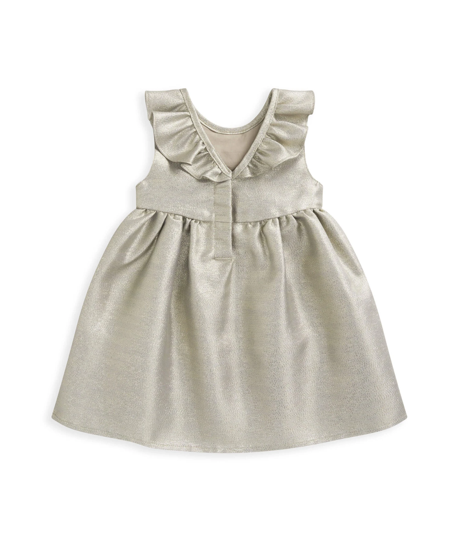 Add subtle shimmer to their party wardrobe with this metallic sleeveless dress. Full of frills and layers, it features a statemement frill neckline that continues along the back and a full multi-layered skirt, that fully gathers from waistband. This dress will make the perfect party piece for your little one.