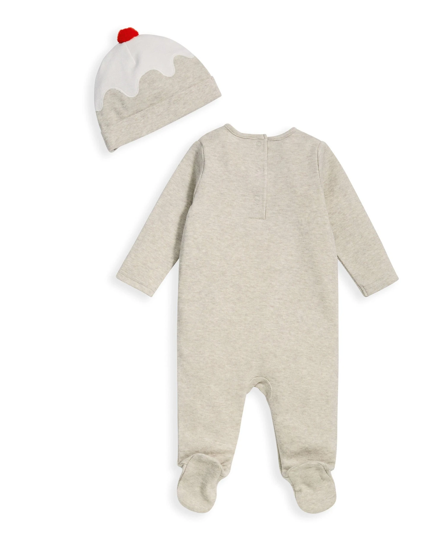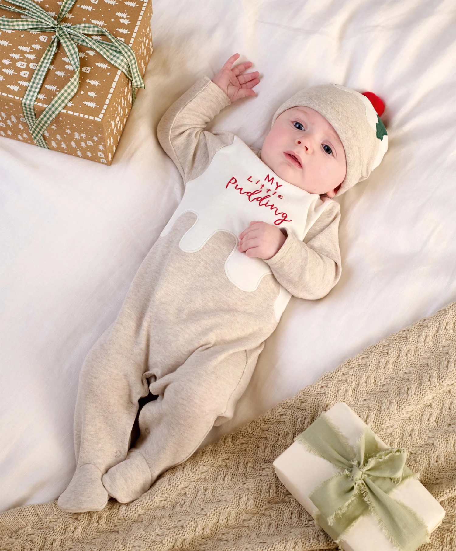 Wrap your own little pudding up in this cosy 2-piece set! Includes all-in-one and matching hat. Oatmeal all-in-one with embroidered Christmas pudding detail. Matching pudding hat with applique holly detail.