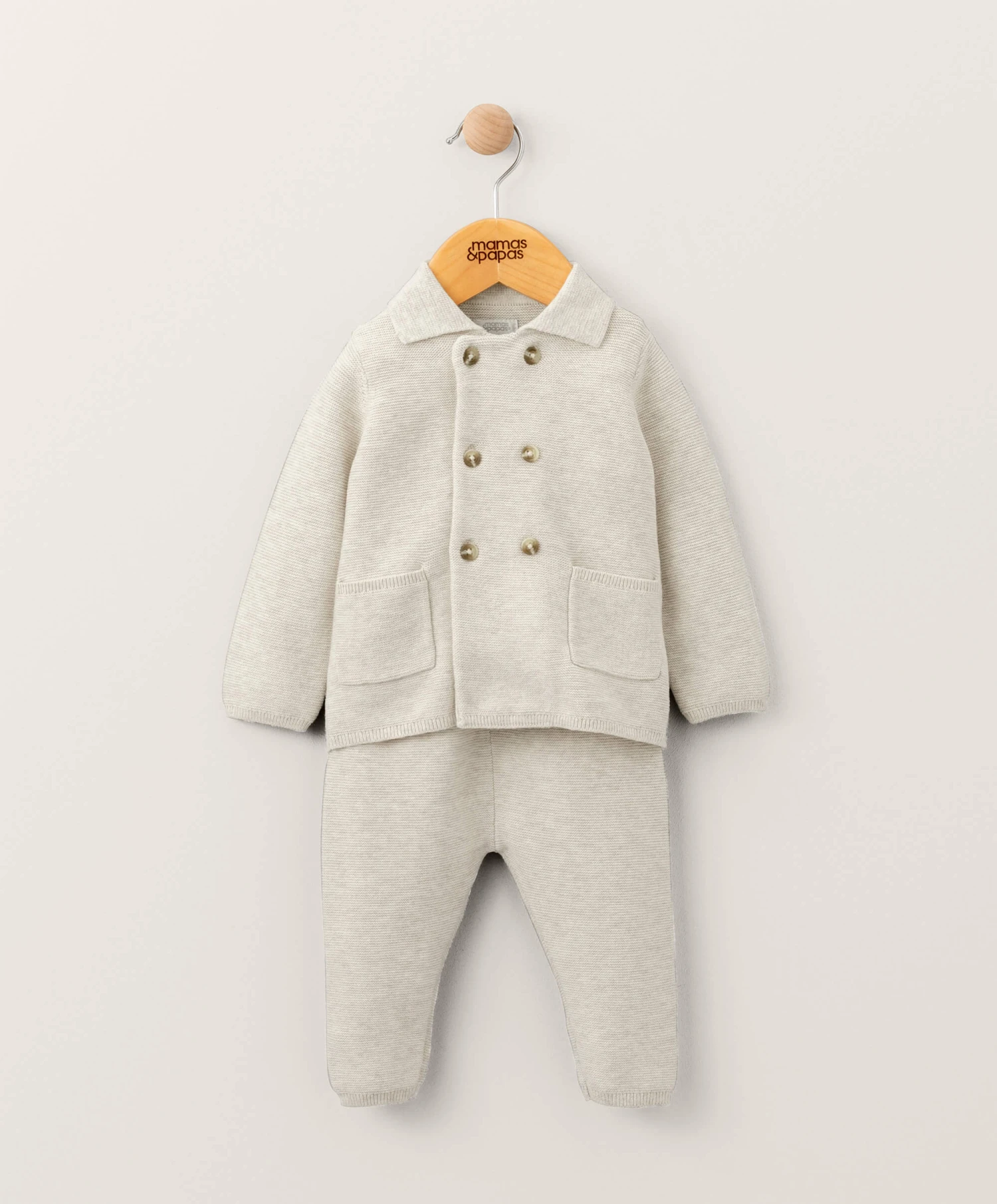 Adorable oatmeal 2-piece knit set. Cosy and comfy to wear, this smart outfit is made from ultra soft knitted 100% cotton fabric in a delicious shade of oatmeal.