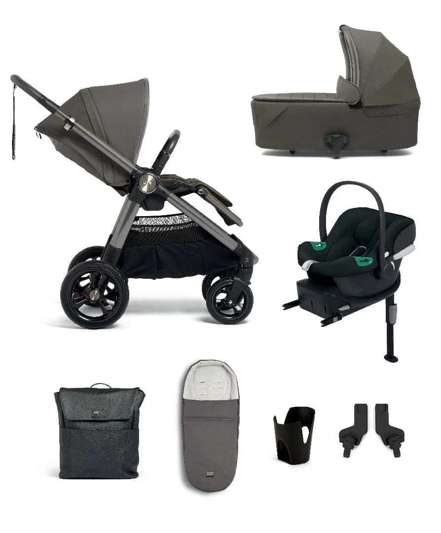 This 7 piece bundle includes: Ocarro Pushchair, Ocarro Carrycot, Car Seat Adaptors, Cybex Aton B2 Car Seat & Base Adjustable Changing Bag, Ocarro Footmuff & Universal Cup Holder