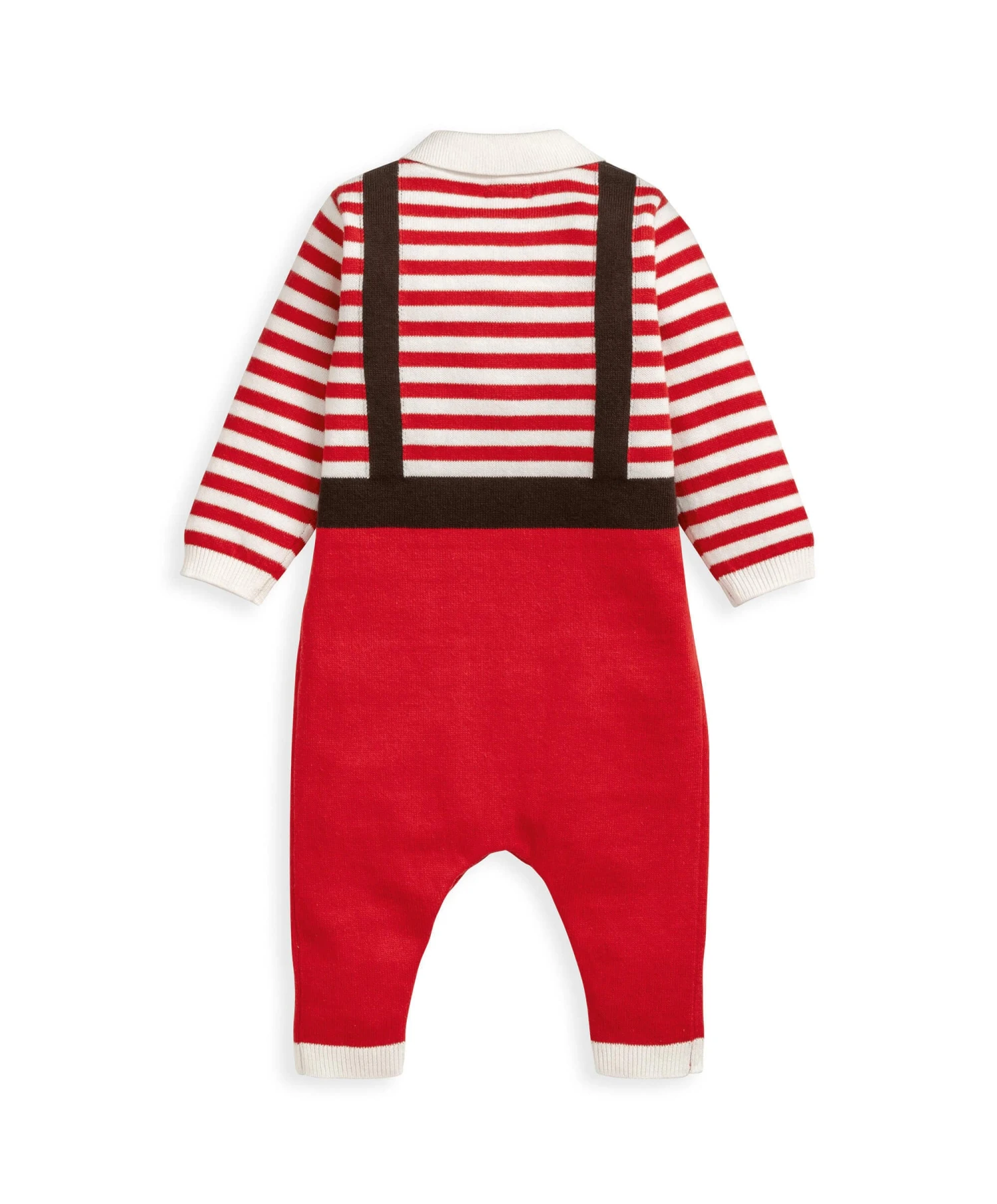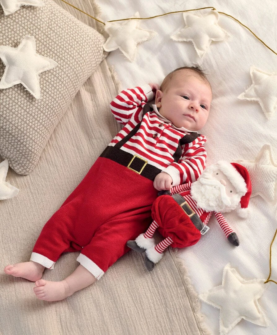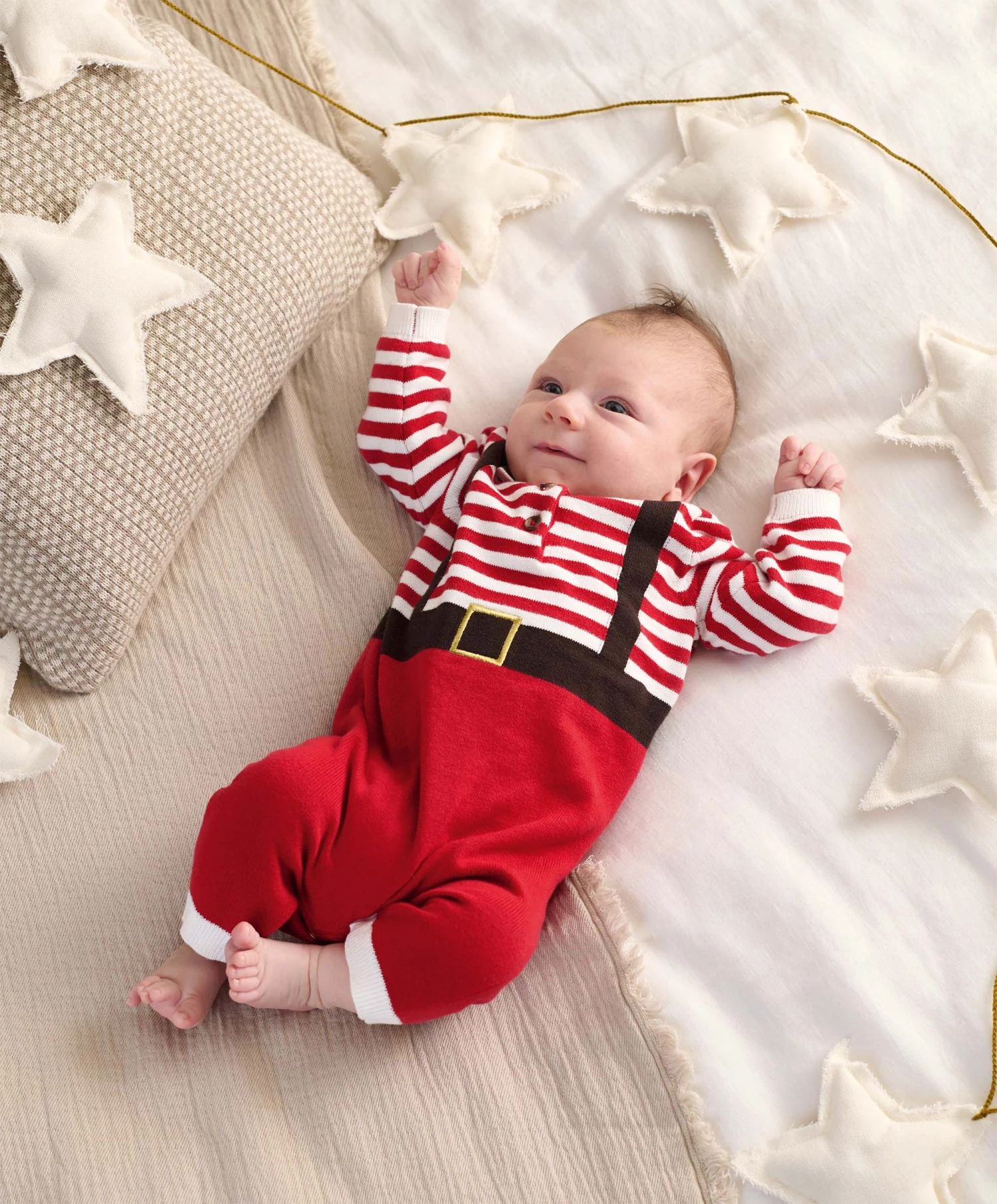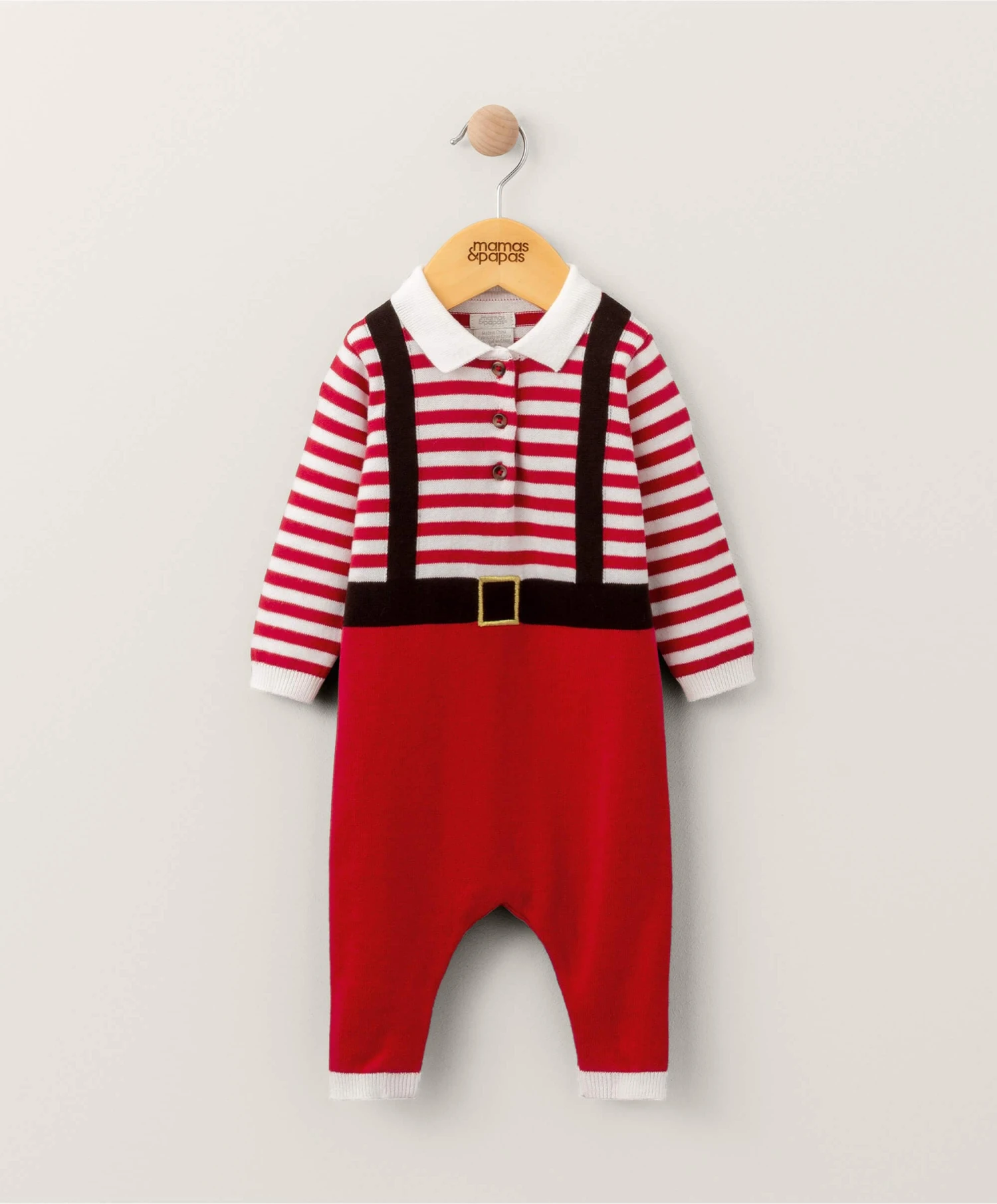 Dress your little one as Santa in this super cute romper! Made from ultra-soft striped jersey knit, it it features collar detail, dark grey knit ‘braces’ and gold embroidered ‘buckle’. Front opening features functional button fastening and there’s a concealed popper opening at the gusset for quick nappy changes. Finished with smart ribbed cuffs.