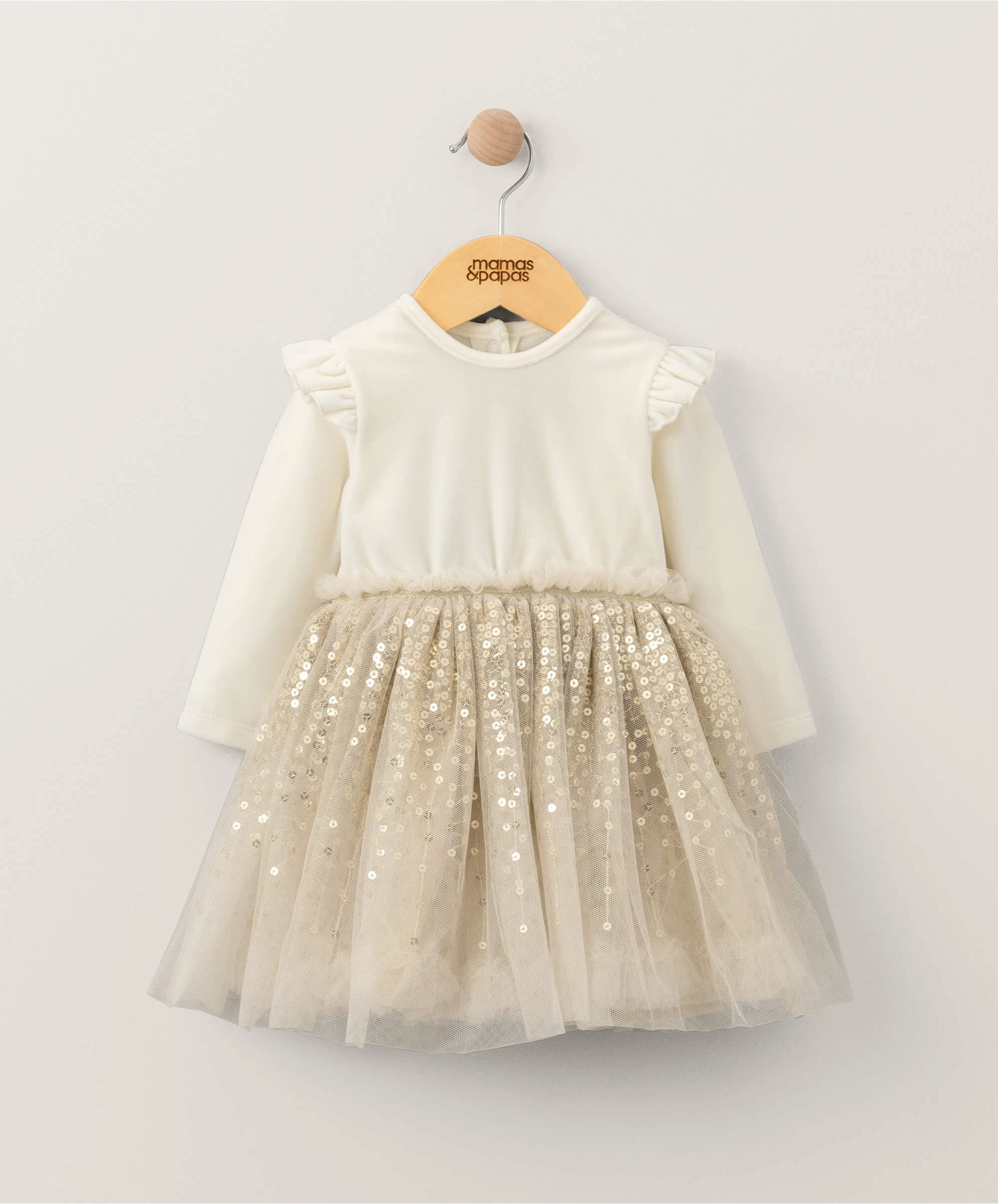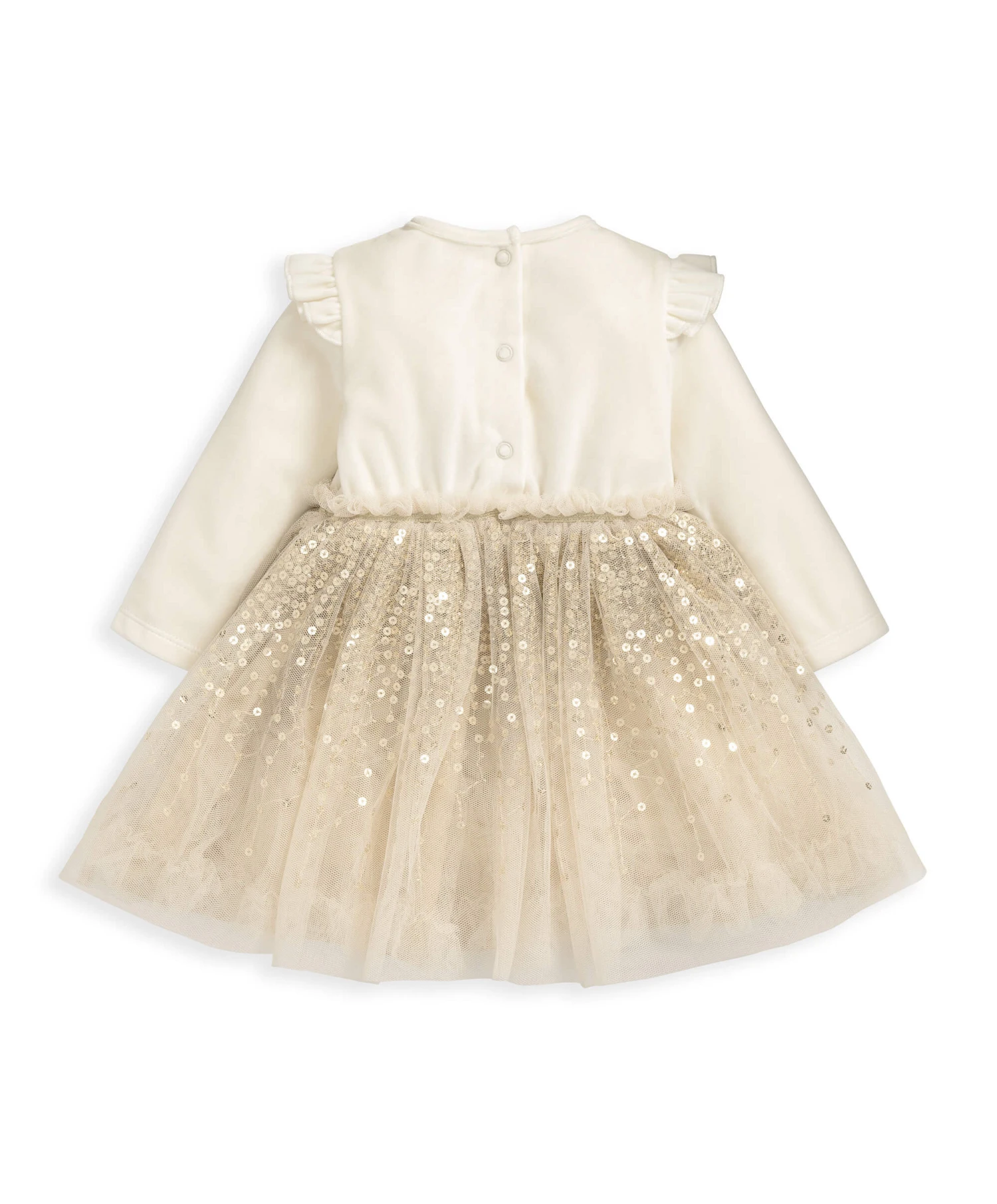 Dress your little one as the star they are in this pretty ballerina dress! Supersoft cream velvet bodice with frill detail on the shoulders and an eye catching golden mesh sequin tutu skirt. Finished with elasticated waistband in gold stitching, for a truly special piece.