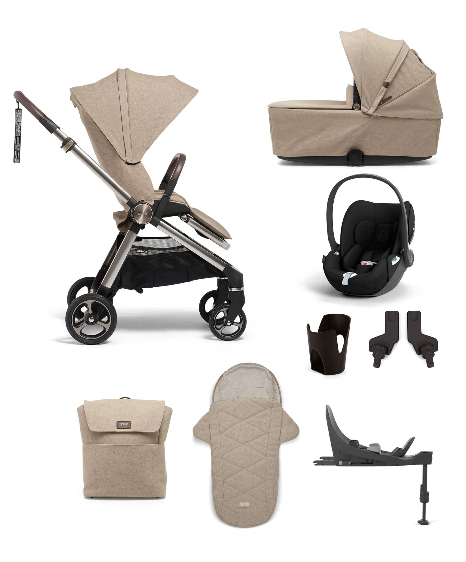 This Strada Bundle includes: Strada Pushchair, Strada Carrycot, Adaptors, Strada Footmuff, Changing bag, Universal Cup Holder, and Cybex Cloud T Car Seat and Base