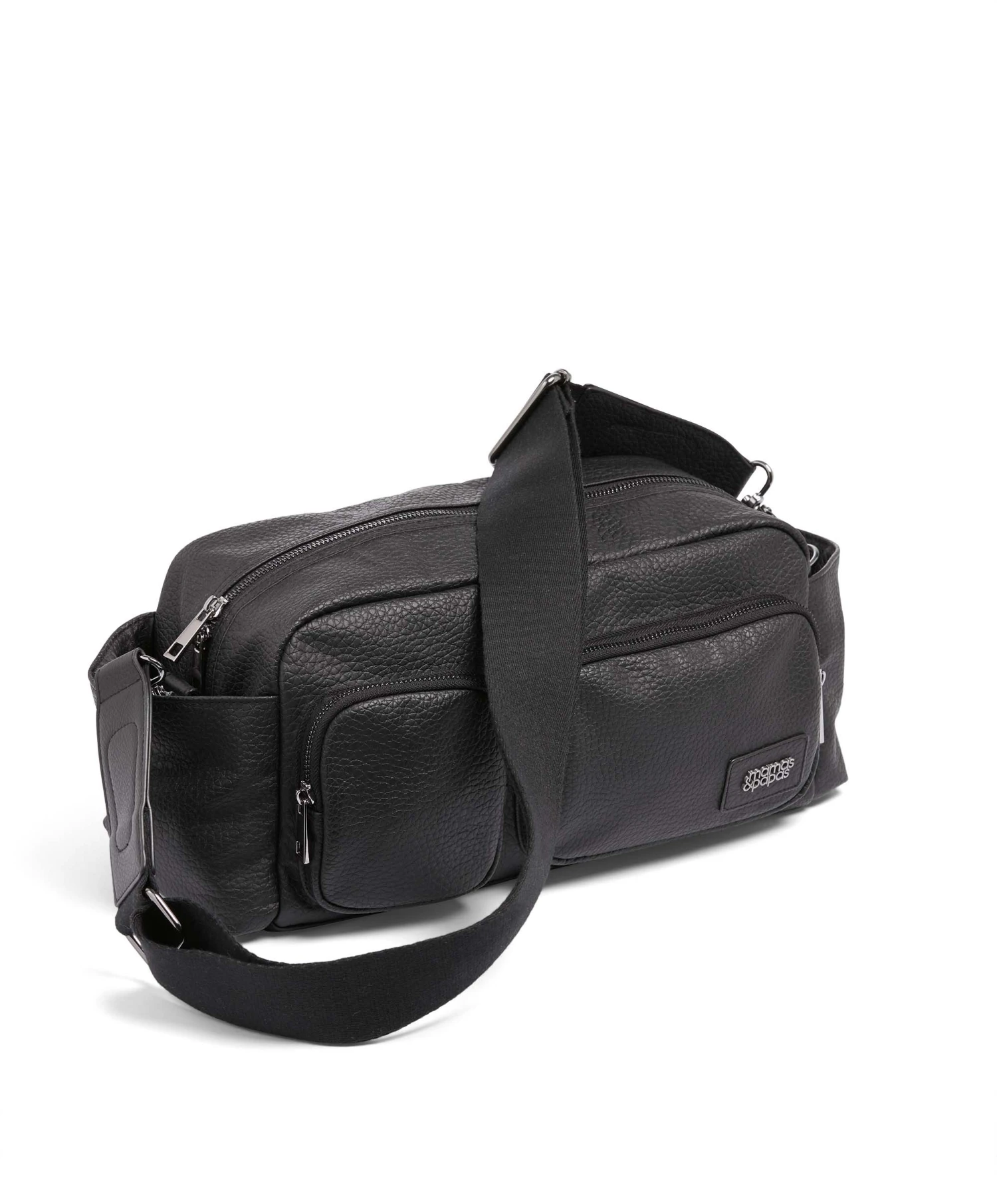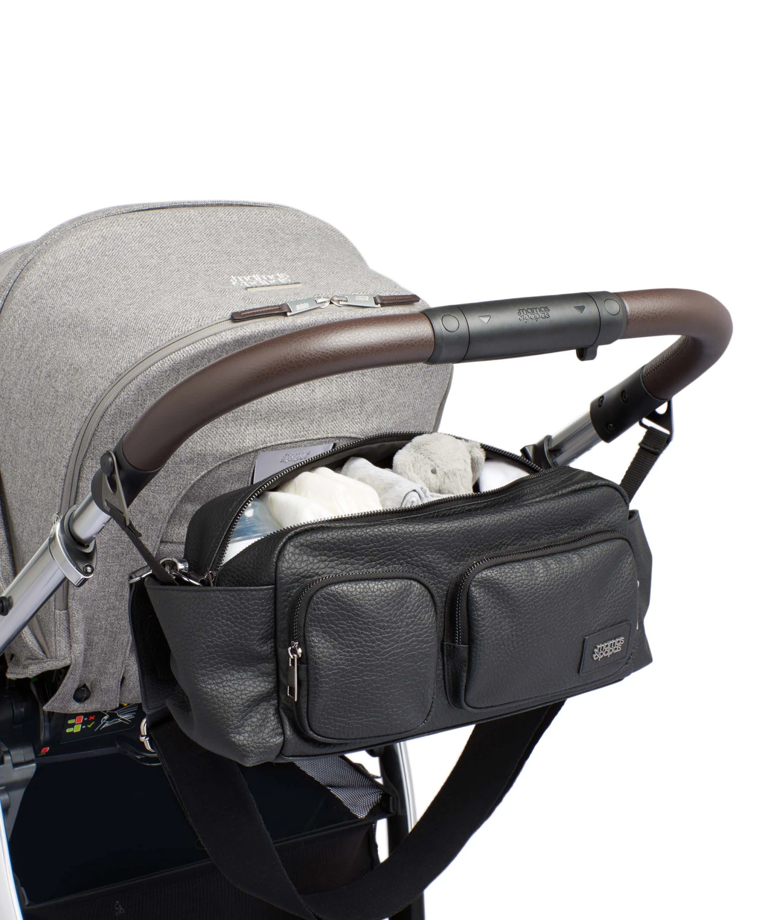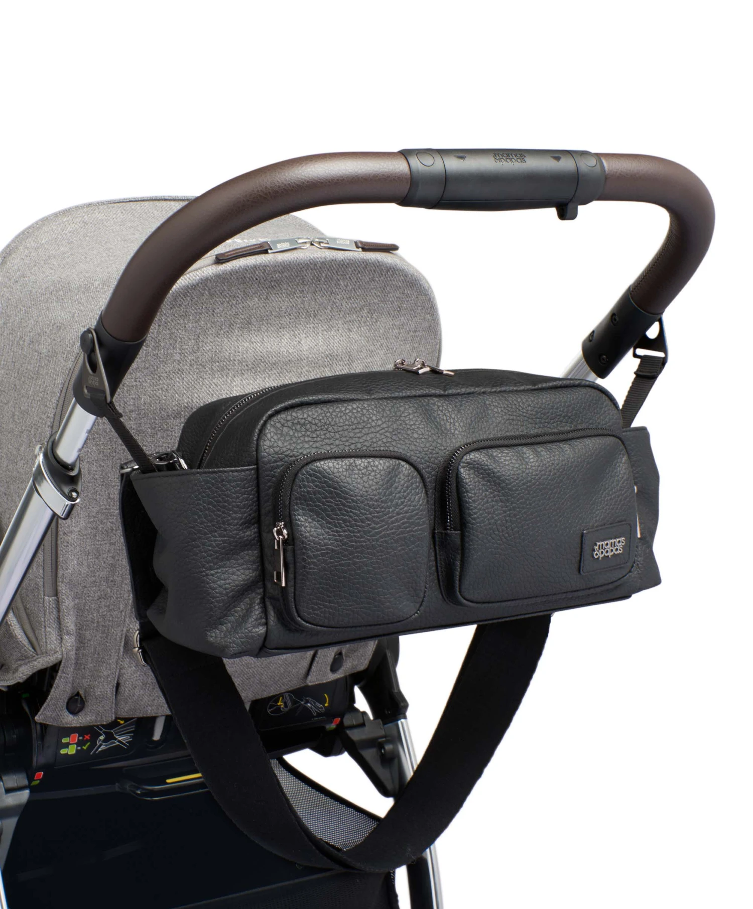Compatible with our Ocarro, Strada and Airo pushchairs, this stylish black leatherette and gunmetal stroller organiser is a sophisticated way to keep baby’s belongings organised and easily accessible. Simple to clip onto the frame of your pushchair, it features multiple pockets for keeping all your essentials organised, internal insulated bottle holders to keep baby’s bottles upright and will keep their milk warm for on-the-go feeding.