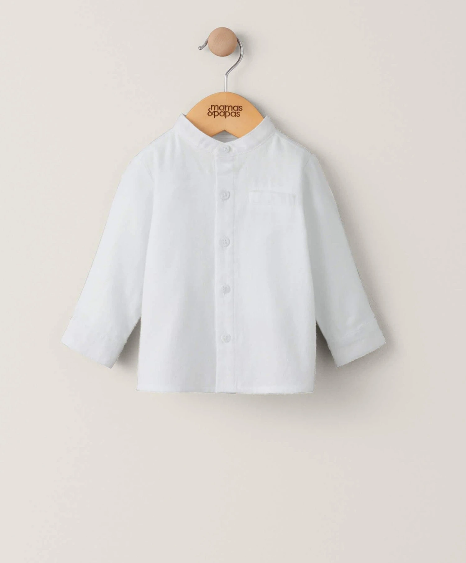 Long sleeved shirt in brushed woven twill. With front button trim, functional cuff opening with button fastening, welt pocket, pleated back and stylish Grandad collar to create a smart look.