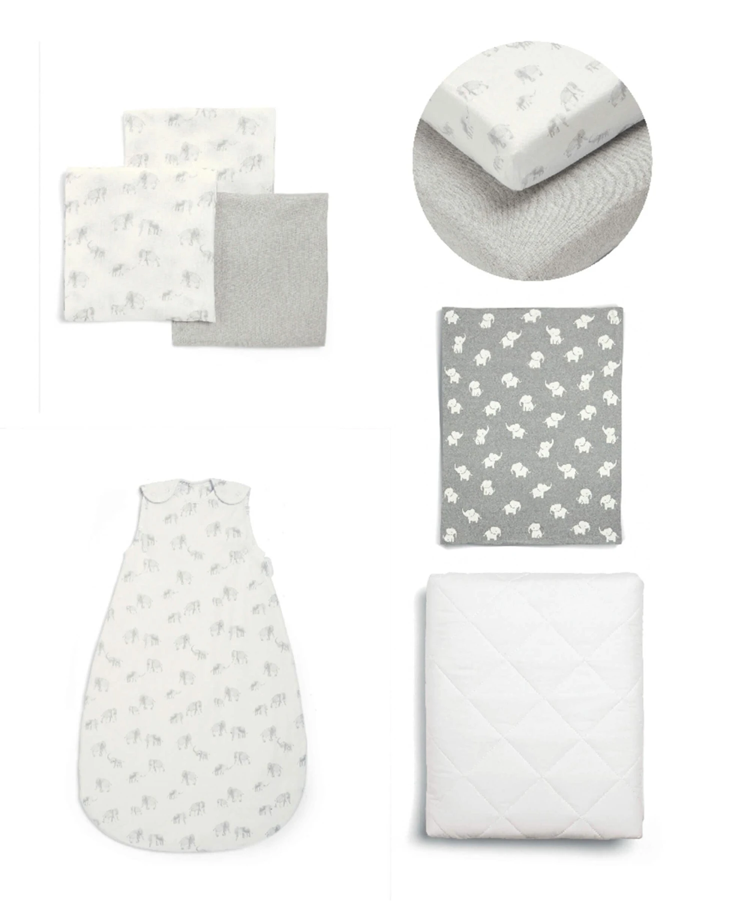 This 5 Piece Bundle includes: Elephant Muslin Cloths, Elephant Dreampod 0-6m – 2.5 Tog, Elephant Cotbed Fitted Sheets – 2 Pack, Knitted Elephant Blanket & Cotbed Mattress Protector, from our Welcome to the World & Cotton Essentials Collection.