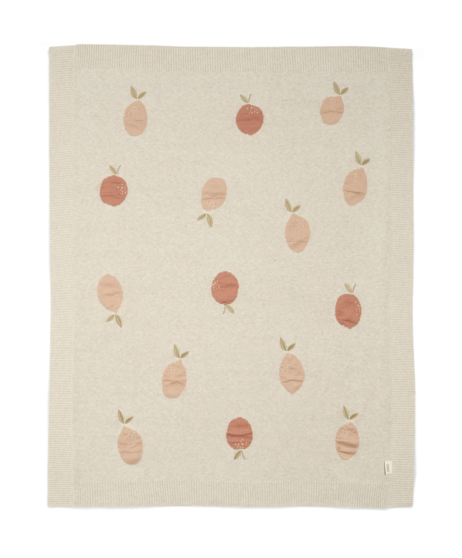 Made with organic cotton, this beautiful knit blanket with ribbed edge detail adds warmth, texture, rich tonal colours and a hint of the natural world to their nursery. Showcasing tonal but playful fruit against a soft and neutral mocha coloured base. White and apricot colored fuit add a pop of colour while keeping the overall look and feel surprisingly neutral. Designed to co-ordinate with this collection, as well as our pushchairs. A standout piece that still manages to sit effortlessly alongside other pieces in their nursery. Aa a unisex piece, this is a truly special addition that will elevate the style and comfort of their room and their pushchair.