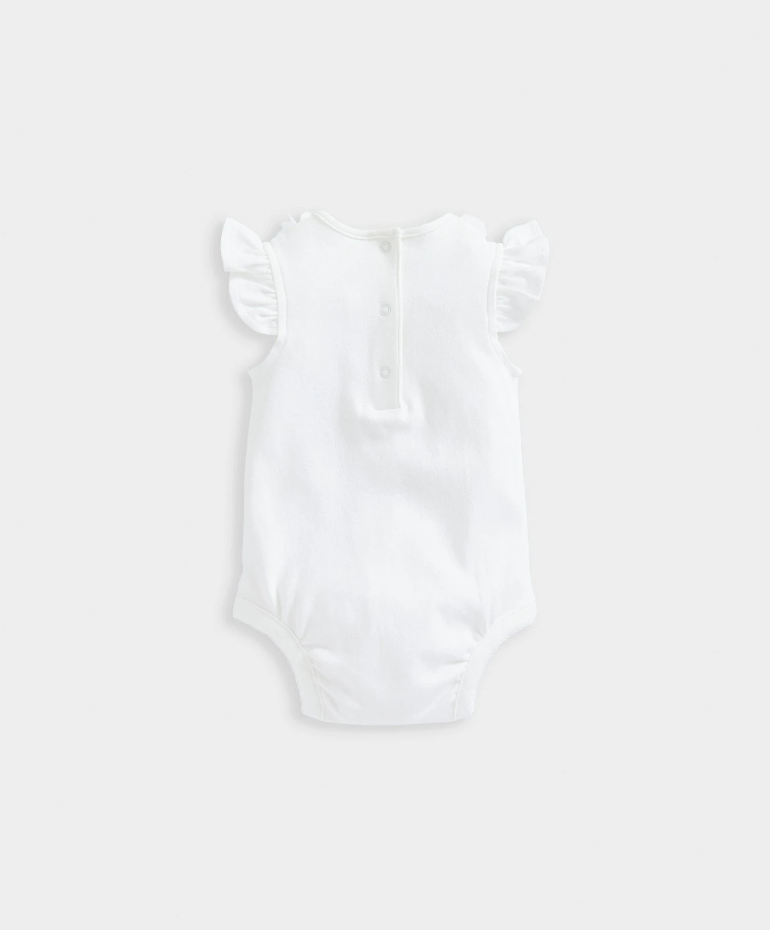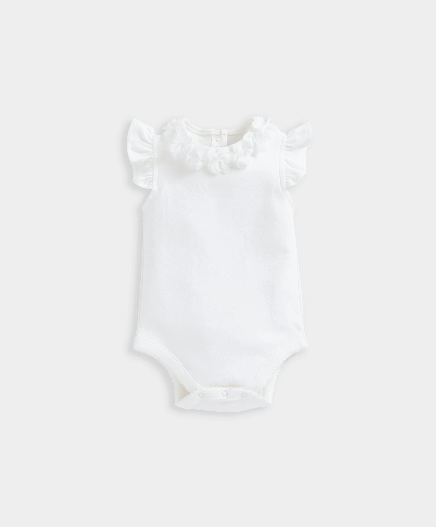Girls short-sleeved bodysuit with pretty flower detail and collar. Back placket features centre opening while crotch opening features a popper trim for quick and easy nappy changes. An elevated item that can be paired with other pieces or worn alone.