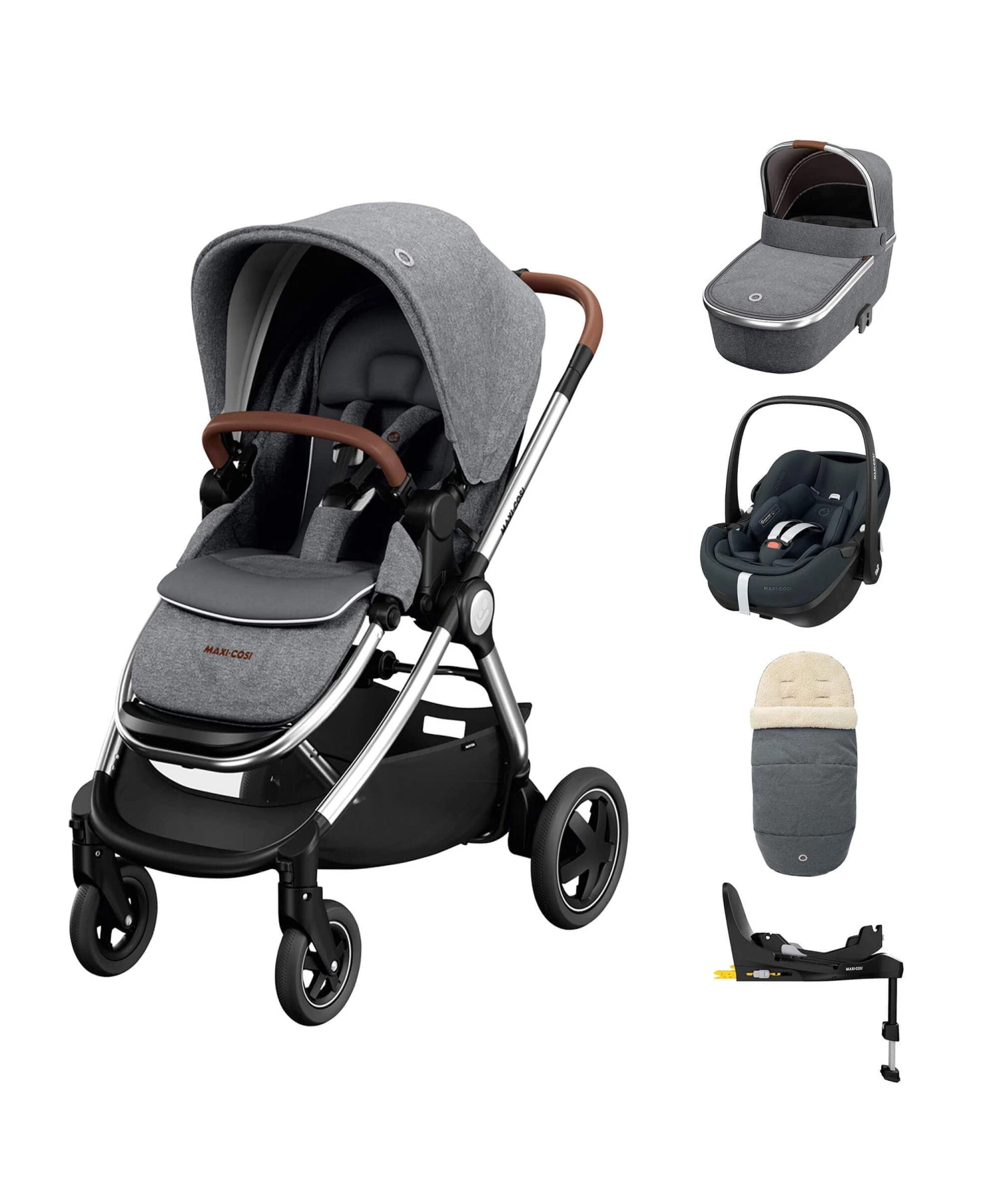 This Bundle includes: Maxi-Cosi Adorra² Luxe Pushchair – Twillic Grey, Maxi-Cosi Oria Luxe Carrycot – Twillic Grey, Maxi-Cosi 2-in-1 Fotmuff – Twillic Grey, Maxi-Cosi Pebble 360 Pro Car Seat – Essential Black & Maxi-Cosi FamilyFix 360 Car Seat Base – Black