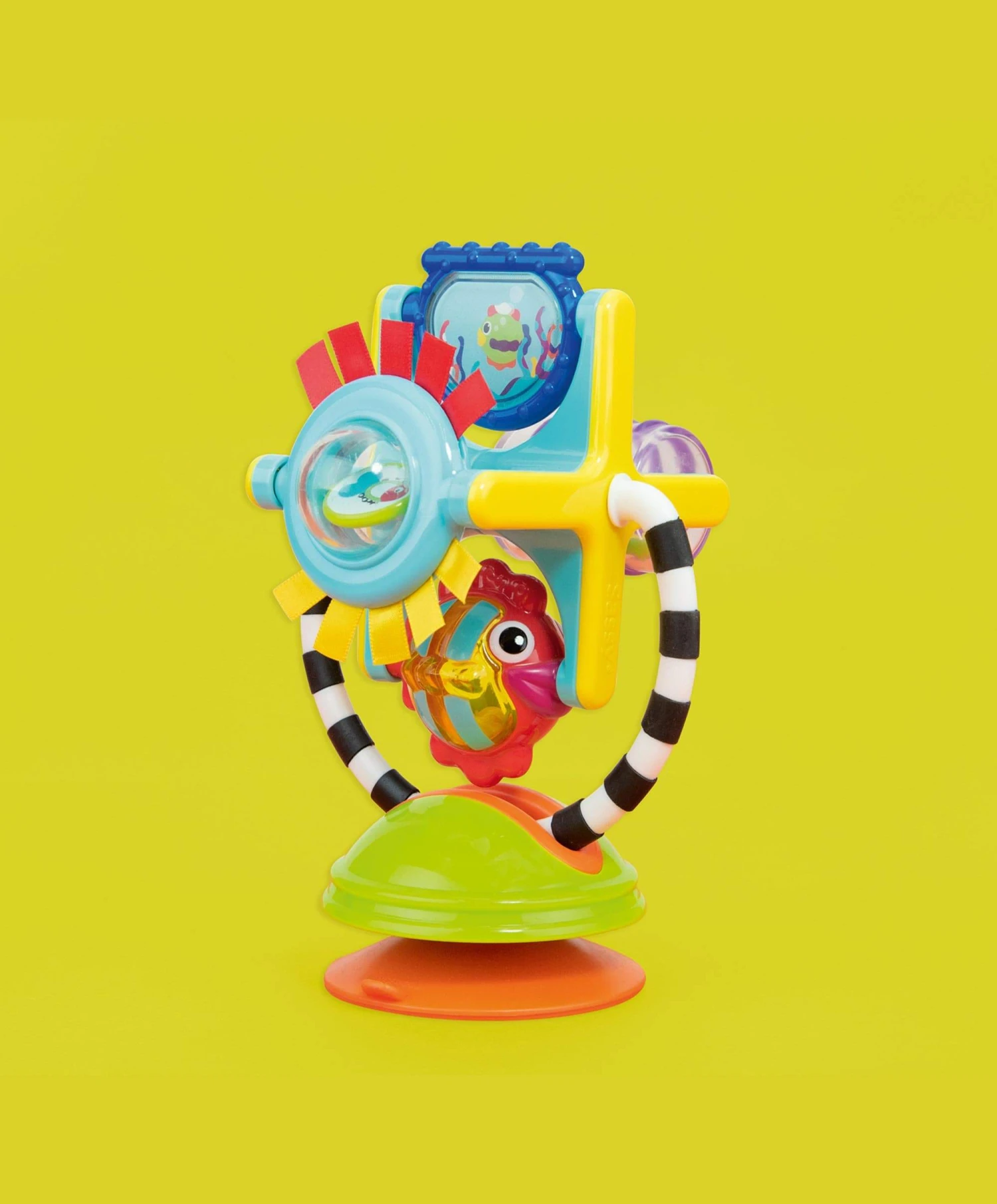 Use the suction cup base to attach the station to a flat surface and watch baby explore the many features of this station. The spinning wheel encourages baby to reach, tug and bat, strengthening hand-eye coordination. Each feature on the wheel spins individually when baby bats at it, introducing baby to cause & effect. The colorful beads trapped within the clear structures allow baby to connect the sound to sight. The toy’s handle is multi-textured, perfect for mouthing. This 2-in-1 toy can be suctioned to a table or high chair tray, or removed from the base for floor play.