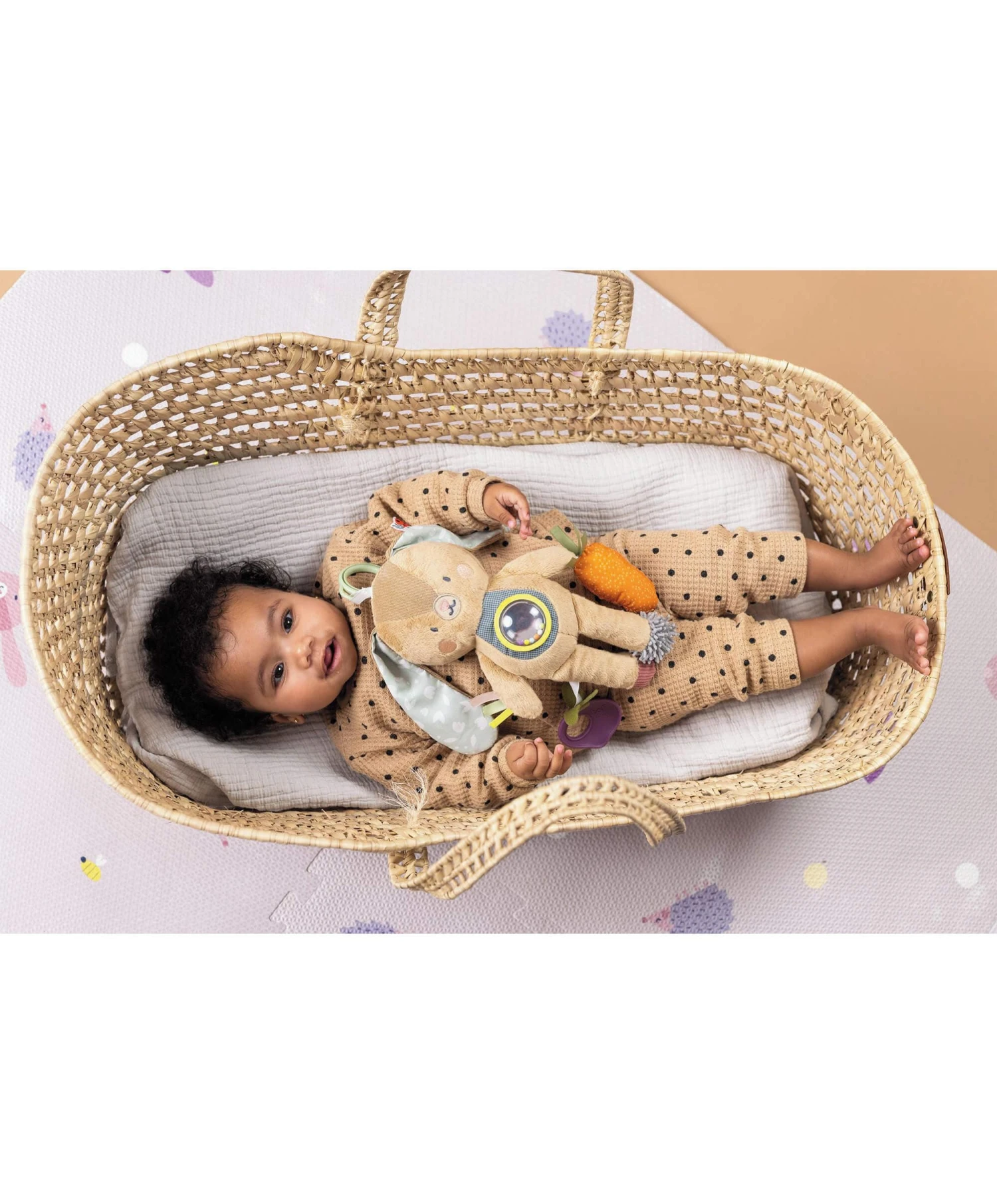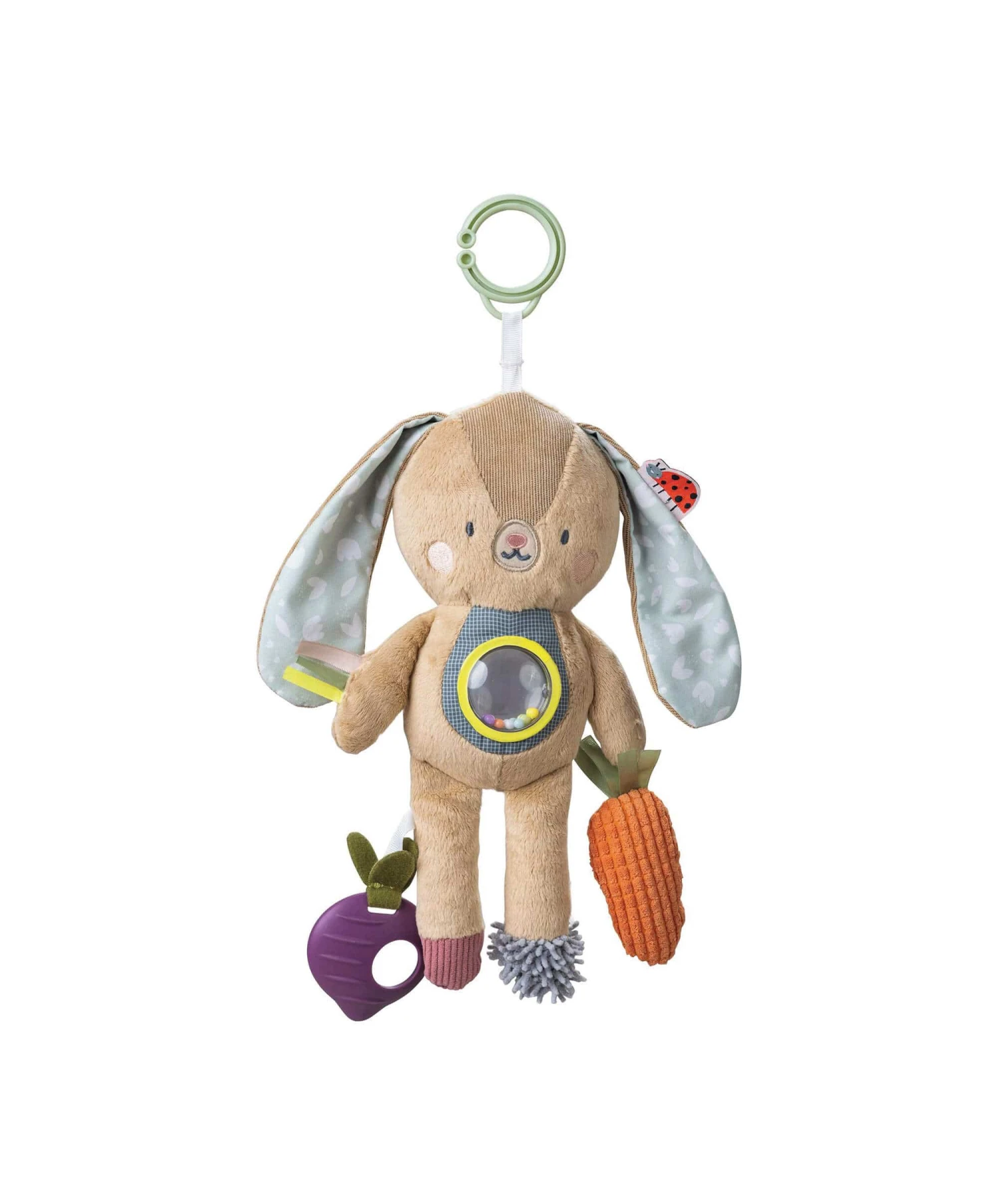 - Encourages cognitive, motor, and hand-eye coordination skills with soft body, crinkling ears and legs, squeaker, rattling carrot toy, and flexible beetroot teether