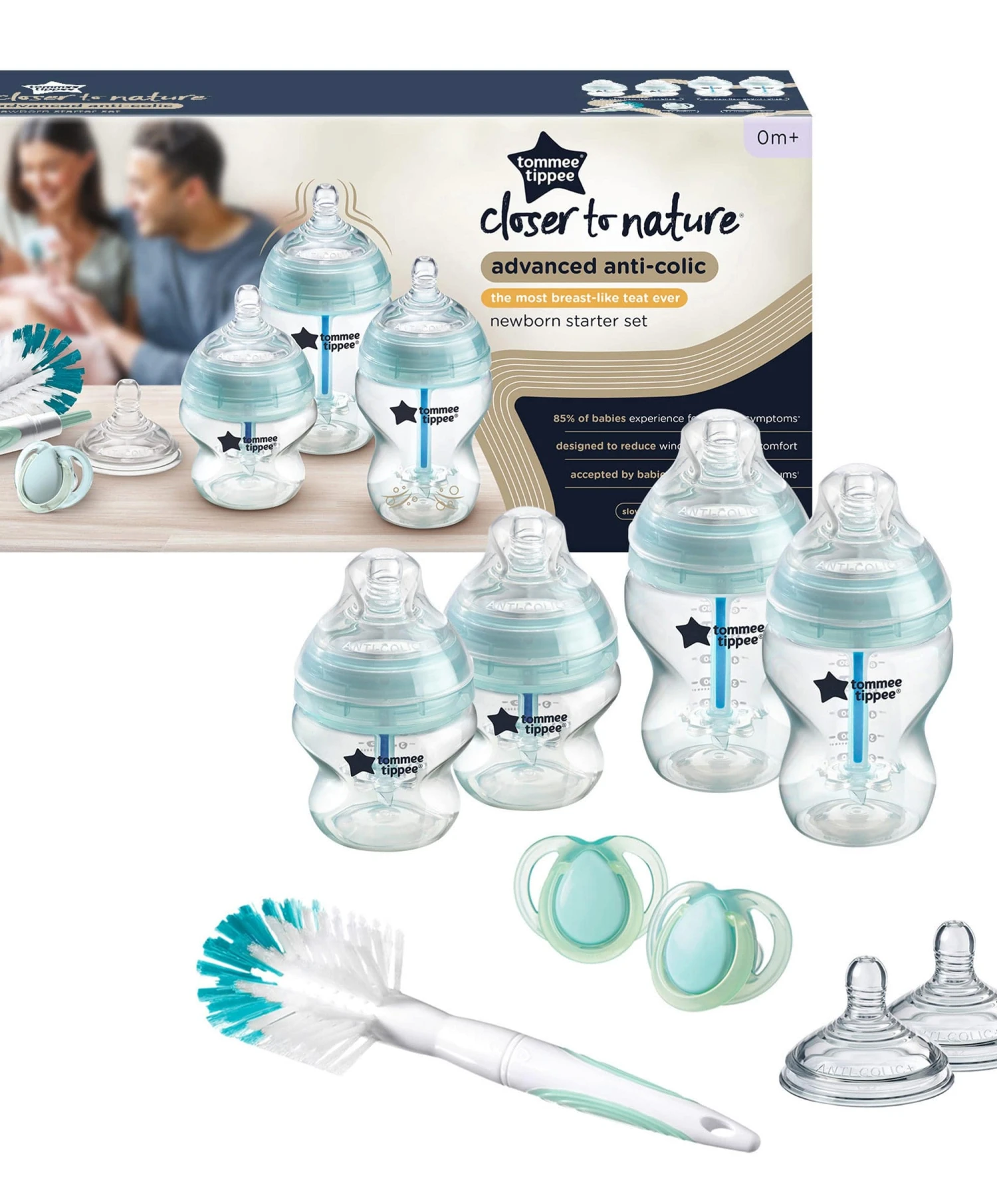 This starter kit includes: 2x 150ml and 2x 260ml Advanced Anti-Colic bottles with slow flow teats, 2x 0-6m night-time soothers and 1x bottle and teat brush