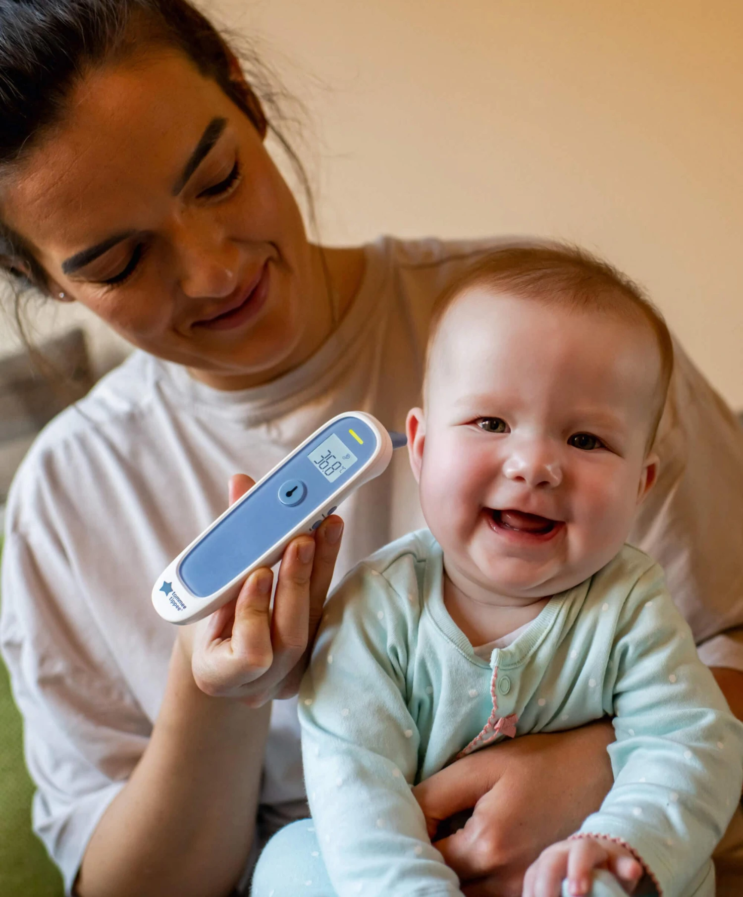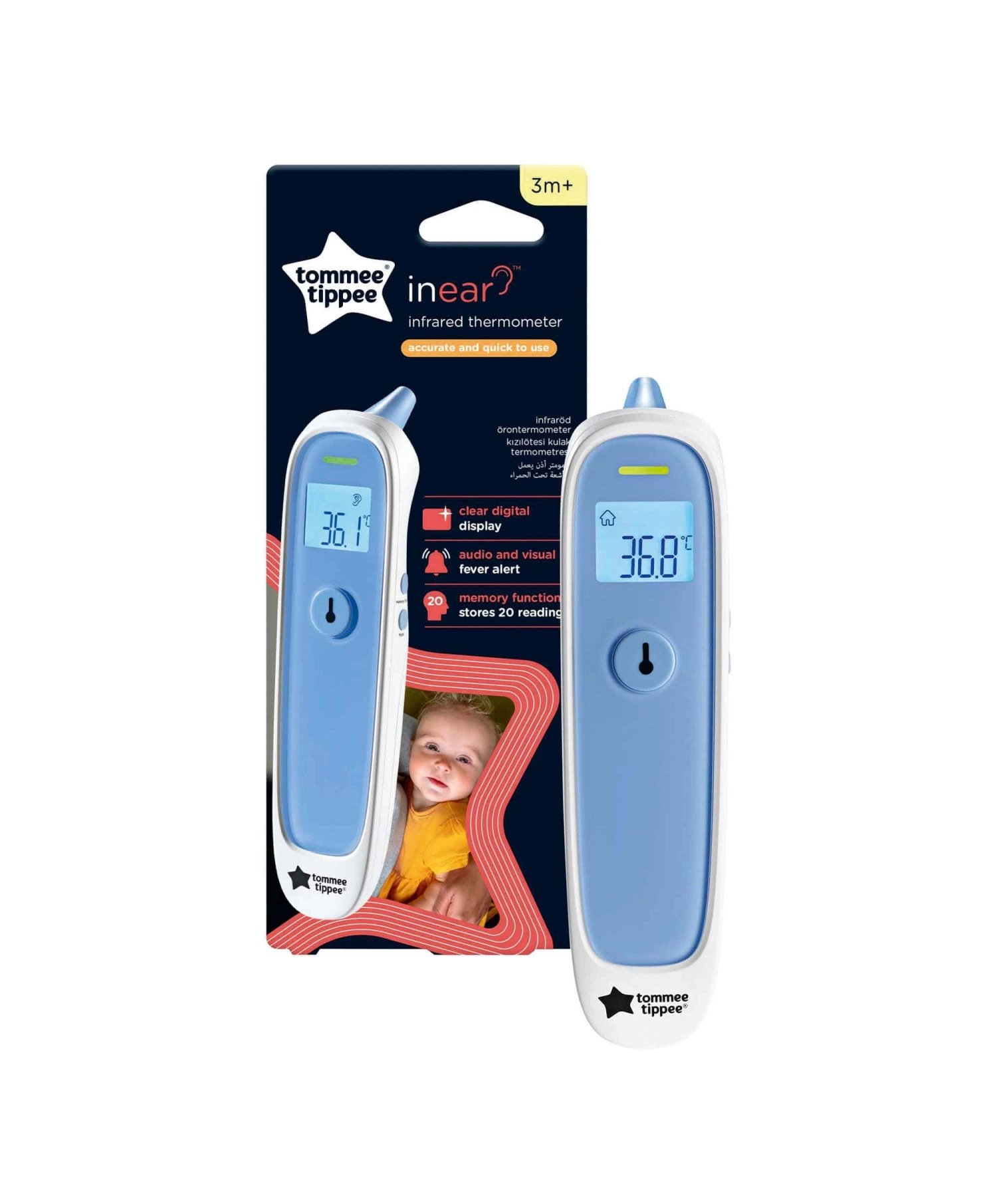 When you need to check your little one’s temperature, the Tommee Tippee InEar digital thermometer provides you with instant and highly accurate temperature readings. This easy to use in-ear thermometer is suitable for use from 3m+ and can be used for the whole family. Simply place the small ear tip in your little one’s ear and press the scan button. An accurate body temperature reading will be displayed on the large, easy to read LCD display in only 1 second. Switch between Celsius and Fahrenheit at the touch of a button according to your preference. Once set, the thermometer remembers your preference so there is no need to choose with each use. If your baby’s temperature is too high and records a reading of 37.6°C or above, the display light will turn red and an alarm will sound to warn of a possible fever, helping to eliminate any doubt. The digital thermometer stores the last 20 readings allowing you to monitor baby’s temperature over time with ease. The QR Code on the handle of the contactless thermometer links your smartphone to a How to Use video, ensuring instructions are always with you, whenever you need them. Supplied with a protective hygiene cover so you can keep your digital thermometer clean and dust free between uses. Includes 2x AAA batteries.