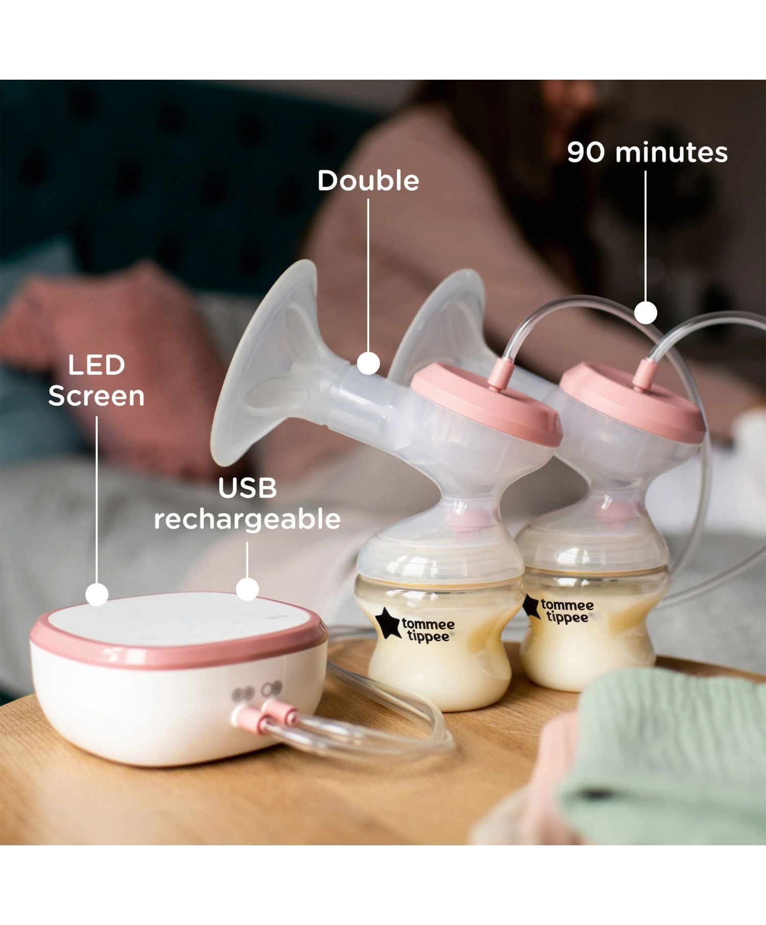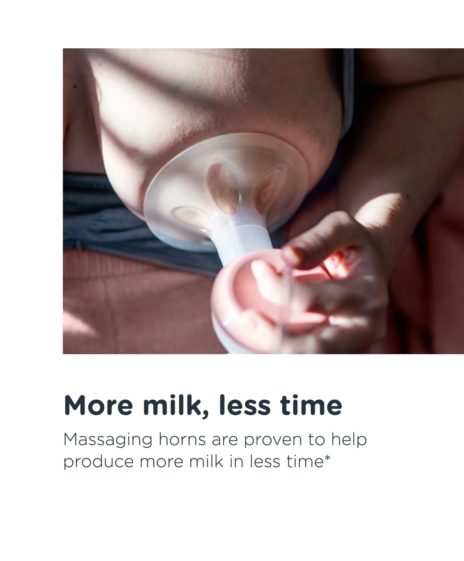 Made from completely BPA and BPS-free materials, you can rest-assured that your baby has a super-safe feed. Loved by mums for convenience**, this Tommee Tippee Double Electric Breast Pump is the ultimate travel companion thanks to its portable power unit that’s compact enough to fit in your bag. It’s lightweight and has a discreet design that allows for quiet pumping wherever you go. Choose between 5 massage and 9 express settings that help to stimulate the milk flow while still feeling gentle on tender breasts. Complete with a USB charger, this breast pump provides 90 minutes of cord-free pump time when fully charged, so you have freedom to express anytime. It even comes with two 150ml Closer to Nature baby bottles with measurement markers so you can keep track of how much you’re expressing, and the LED display screen tells you how long you express for. It also connects to all sizes of our Closer to Nature and Advanced Anti Colic baby bottles*** so it’s adaptable to your unique breast pumping experience. *Based on US consumer research, our horn increased milk flow compared to competitor pumps. **Based on US consumer research, our pump scored highest for convenience compared to competitor pumps. ***Excludes glass.