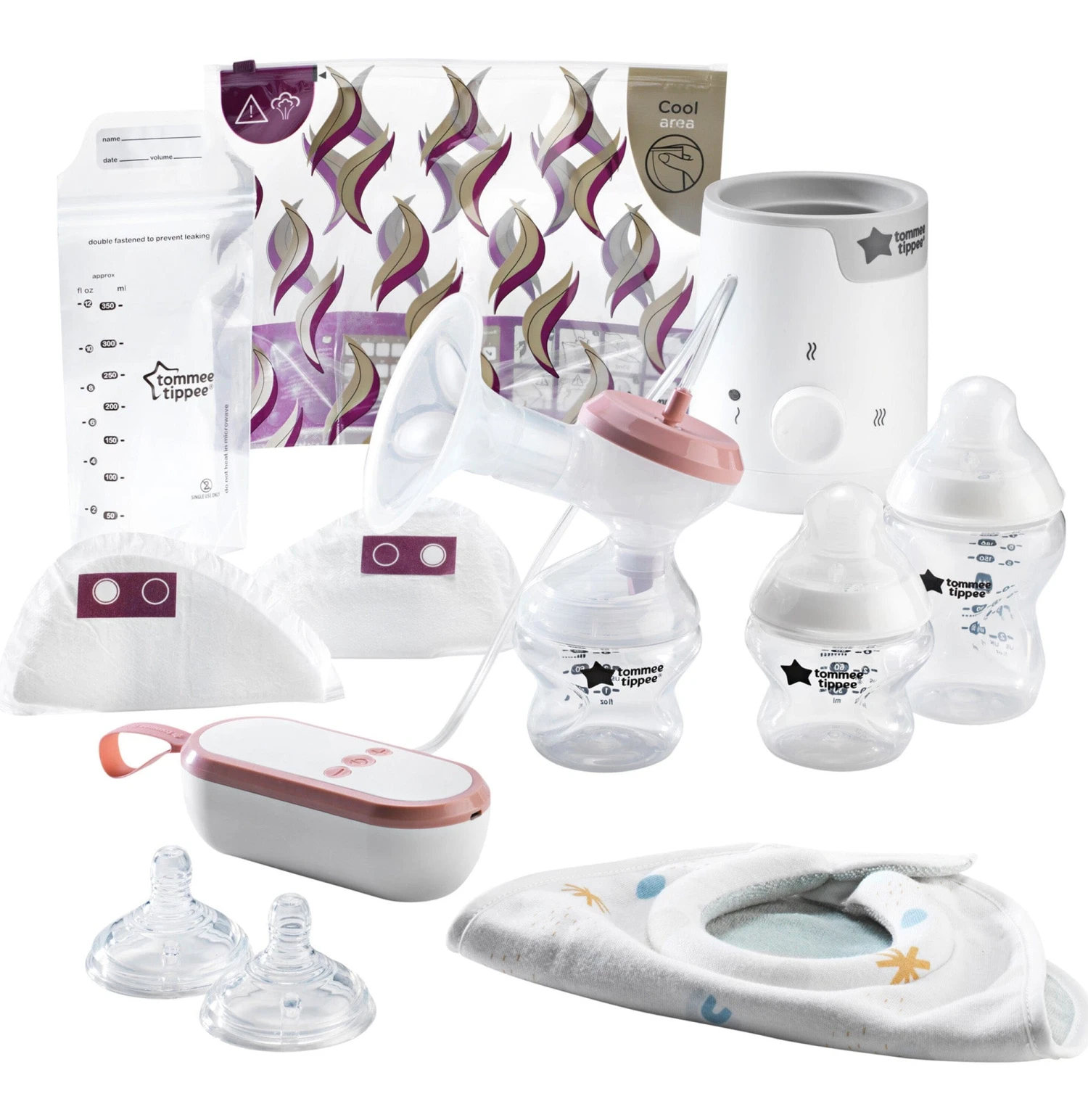 - Complete Breastfeeding Kit: Single electric breast pump, 150ml bottle, 260ml bottle, travel steriliser bags, food and bottle warmer, breast pad pairs, milk feeding bib, medium flow teats, milk storage bags