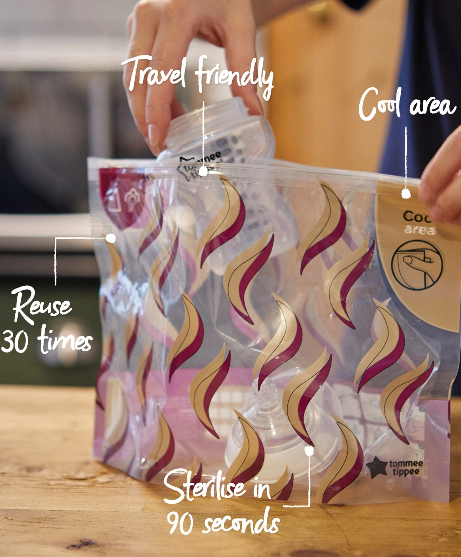 - Travel steriliser bags: Use each travel bag up to 30 times to sterilise breastfeeding equipment in the microwave before you head out for the day or night