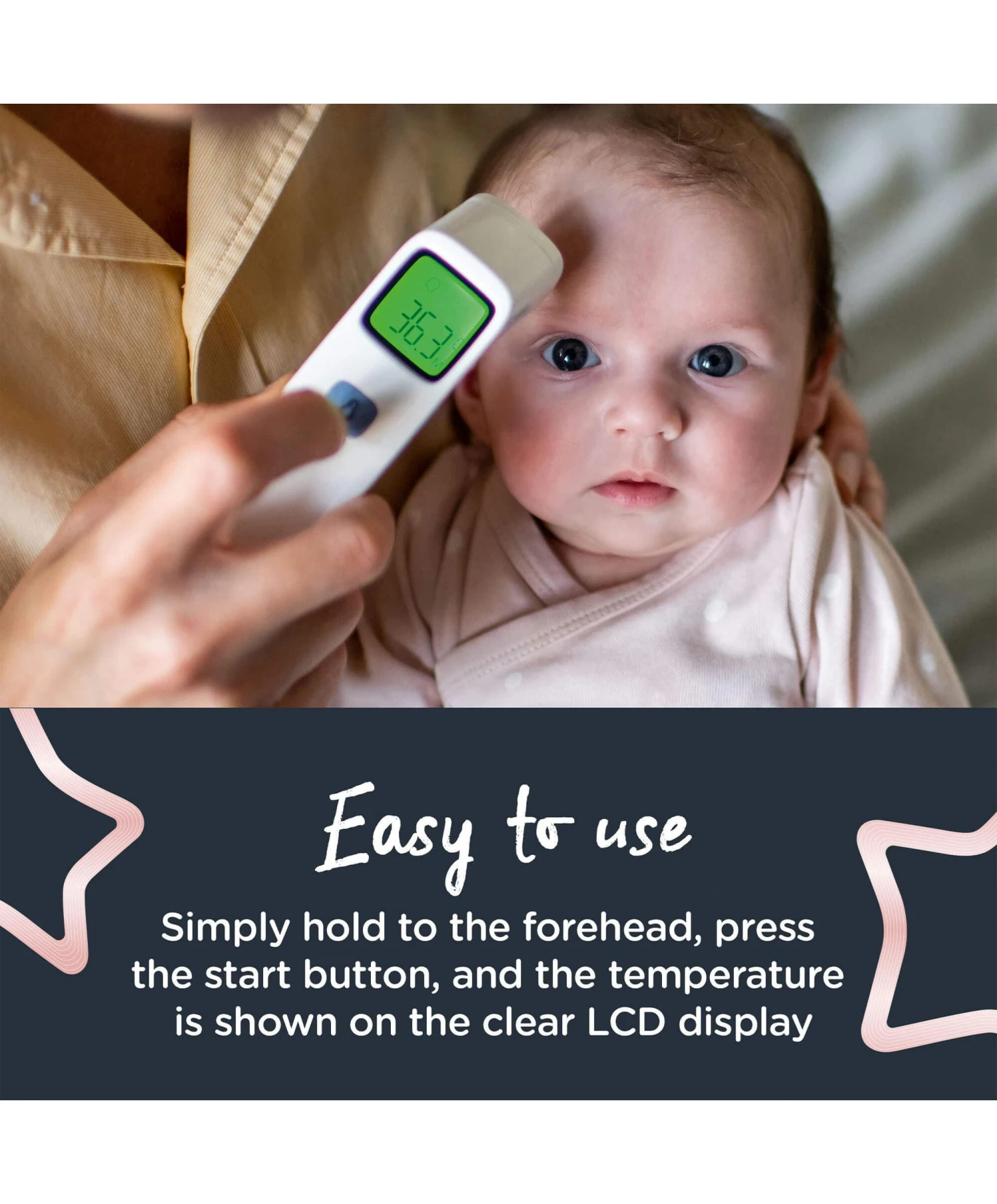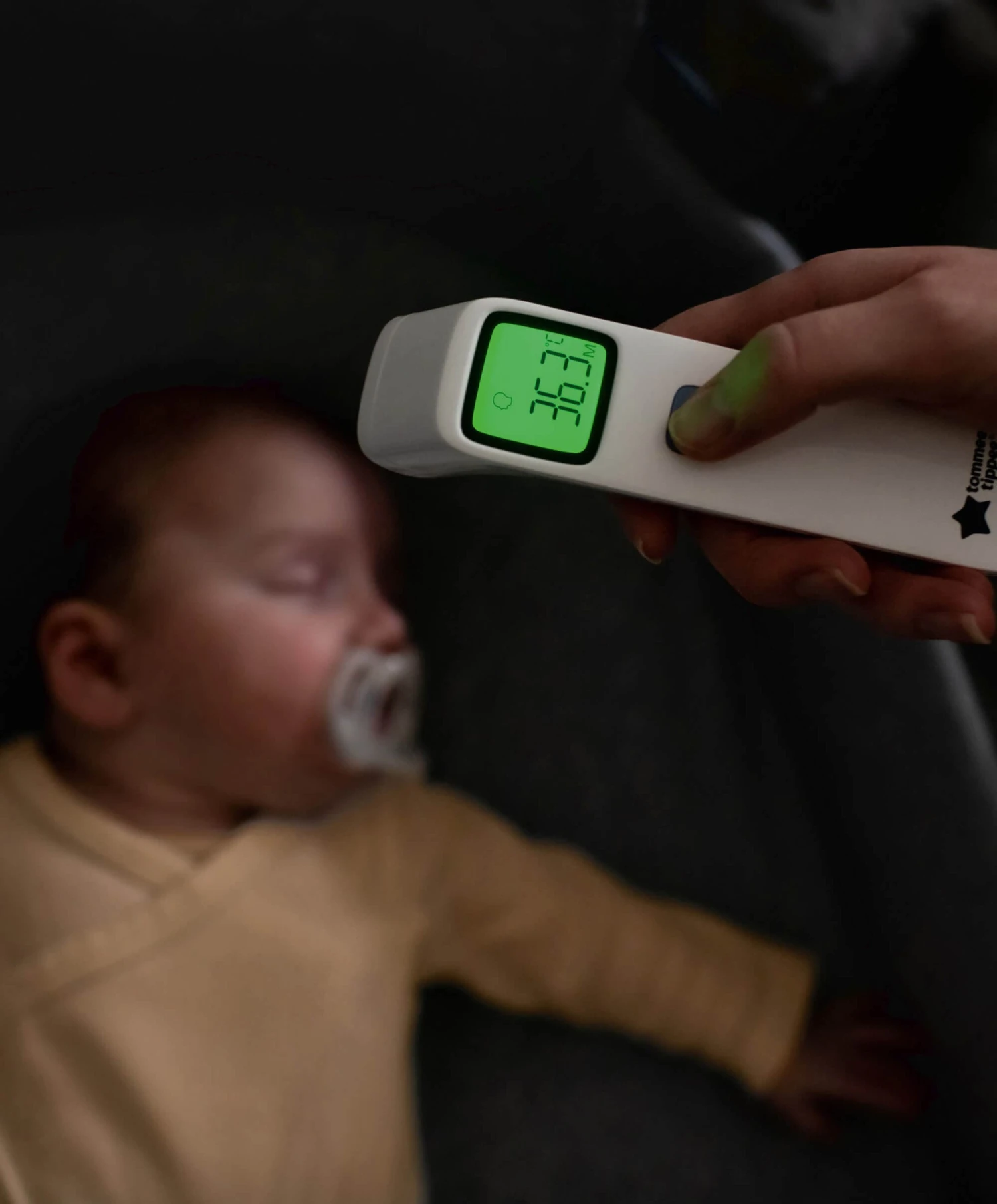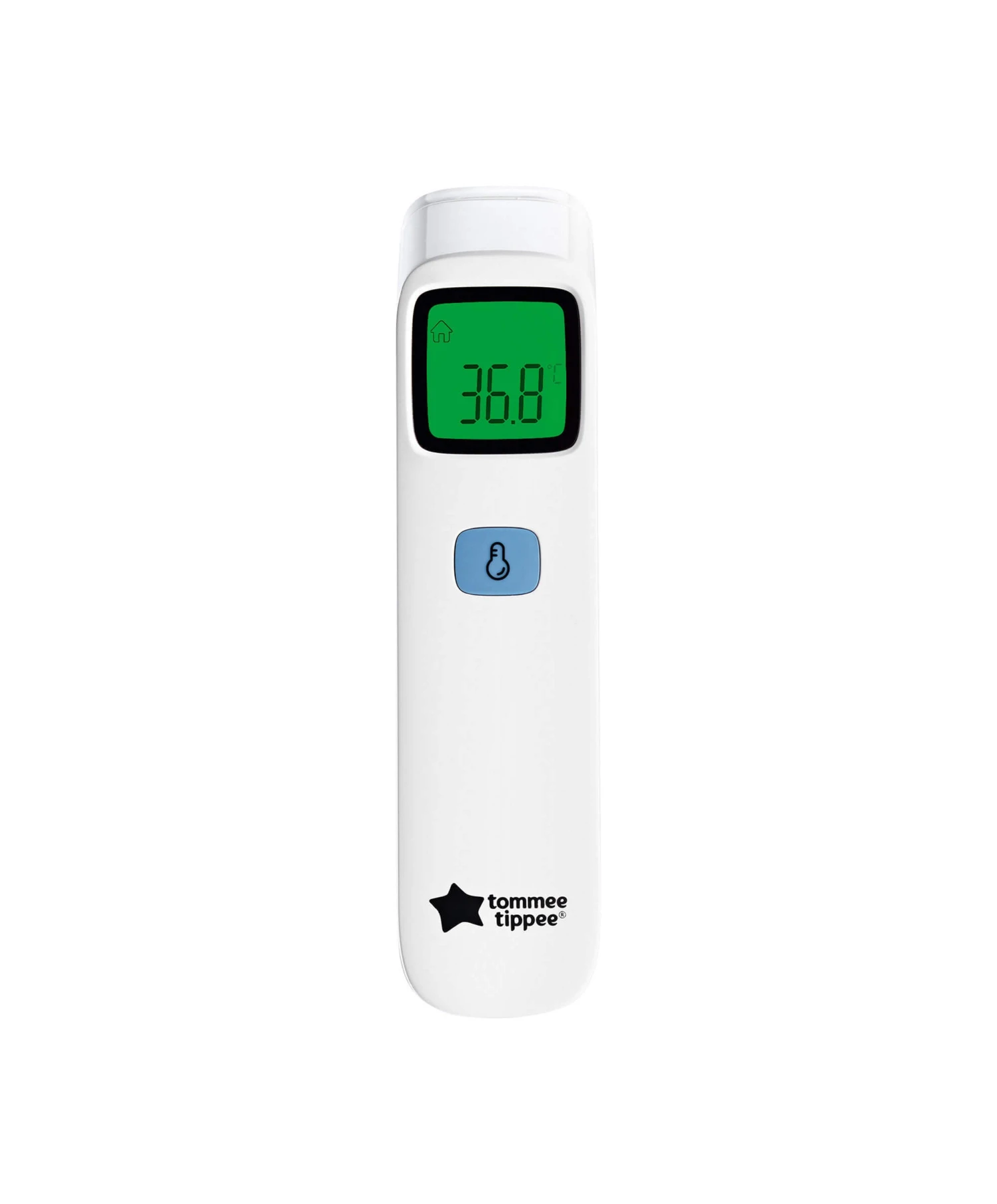 When you need to check your little one’s temperature, the Tommee Tippee NoTouch forehead thermometer provides you with instant and highly accurate temperature readings. This easy to use forehead thermometer is suitable for use from birth and can be used for the whole family. Simply hold the scanner 1-3cm away from the centre of the forehead, press the start button and the temperature will be shown on the easy to ready LCD display in just 1 second. If your baby’s temperature is too high and records a reading of 37.6°C or above, the light will turn red and an alarm will sound to warn of a possible fever, helping to eliminate any doubt. Switch between Celsius and Fahrenheit at the touch of a button according to your preference. Once set, the thermometer remembers your preference so there is no need to choose with each use.The digital thermometer stores the last 20 readings allowing you to monitor baby’s temperature over time with ease. The QR Code on the handle of the contactless thermometer links your smartphone to a How to Use video, ensuring instructions are always with you, whenever you need them. When used in object mode, this digital no-touch thermometer can also be used to measure the surface temperature of an object. Use it to measure the temperature of your baby’s bottle, so there’s no more guessing if it’s too hot. Supplied with a protective bag so you can keep your digital thermometer clean and dust free between uses. Includes 2x AAA batteries.